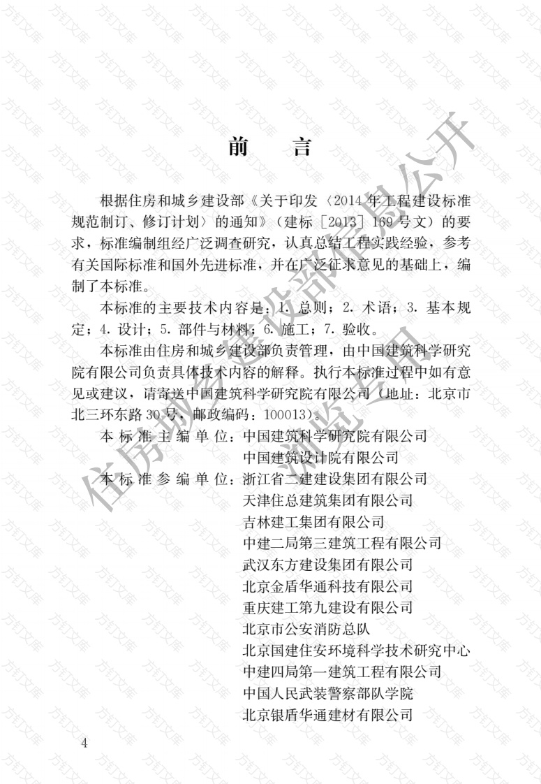前言根据住房和城乡建设部《关于印发(2014年玉程建设标准规范制订、修订计划〉的通知》(建标[2013]169号文)的要求,标准编制组经广泛调查研究,认真总结工程实践经验,参考有关国际标准和国外先进标准,并在广泛征求意见的基础上,编制了本标准本标准的主要技术内容是:。总则;2.术语;3.基本规定;4.设计;5.部件与材料6.施工;7.验收。本标准由住房和城乡建设部负责管理,由中国建筑科学研究院有限公司负责具体技术内容的解释。执行本标准过程中如有意见或建议,请寄送中国建筑科学研究院有限公司地址:北京市北三环东路30号,邮政编码:100013)。本标准主编单位:中国建筑科学研究院有限公司中国建筑设计院有限公司准参编单位:浙江省二建建设集团有限公司天津住总建筑集团有限公司吉林建工集团有限公司中建二局第三建筑工程有限公司武汉东方建设集团有限公司北京金盾华通科技有限公司重庆建工第九建设有限公司北京市公安消防总队北京国建住安环境科学技术研究中心中建四局第一建筑工程有限公司中国人民武装警察部队学院北京银盾华通建材有限公司贵州省大地建筑工程有限责任公司万文廊坊金盾华通科技有限公司江苏省紫葳建筑技术研究所有限公司廊坊凯博建设机械科技有限公司本标准主要起草人员:张声军曾雁沈燕张振辉陈凤楠安雄宝方群英周立新陈海燕于海祥李张伯华岳巍蔡芸张会来李效禹鲁永飞陈寿忠毕江寰果金颖王贤权萨周磊本标准主要审查人员:赵冠谦杨思忠李引擎范益群杨永起谢尧生张建明木唐明贤王国利住房城乡浏览专方文钉方方万目次总则2术语3基本规定设计4.1般规定54.2结构设计54.3设计性能要求5部件与材料5.1排气道5.2防火与止回部件115.3风帽115.4原材料及辅12136.1般规定136.2材料准备136.3排气道安装146.4风帽安装156.5防火与止回部件安装15验收167.1般规定167.2主控项目177.3般项目18附录A住宅排气管道系统性能型式试验方法20附录B排气道力学性能试验方法22附录C排气道耐火试验方法24