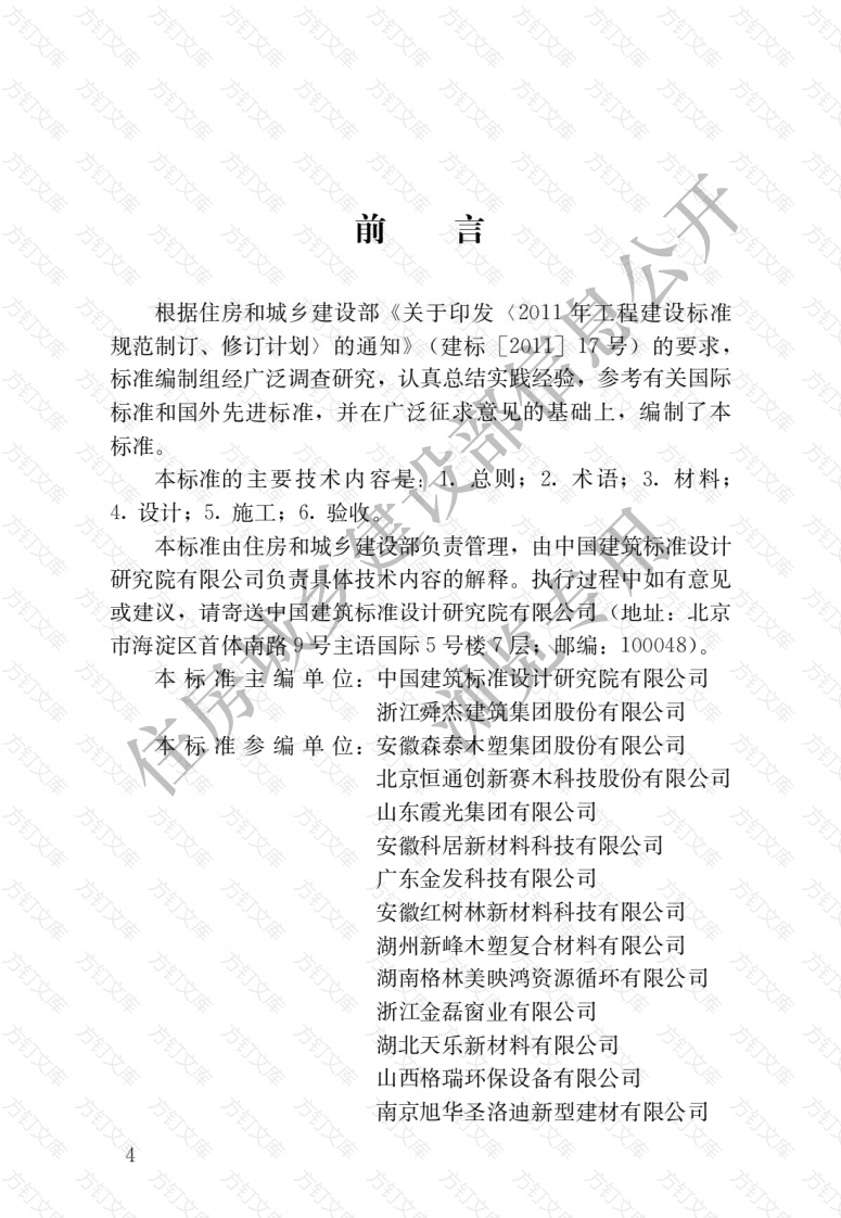 前根据住房和城乡建设部《关于印发2011年程建设标准标准编制组经广泛调查研究,认真总结实践经验,参考有关国际标准和国外先进标准,并在广泛征求意见的基础上,编制了本标准。本标准的主要技术内容是:总则;2.术语;3.验收。本标准由住房和城乡建设部负责管理,由中国建筑标准设计研究院有限公司负责具体技术内容的解释。执行过程中如有意见或建议,请寄送中国建筑标准设计研究院有限公司(地址:北京市海淀区首体南路9号主语国际5号楼?层:邮编:100048)本标准主编单位:中国建筑标准设计研究院有限公司浙江舜杰建筑集团股份有限公司准参编单位:安徽森泰木塑集团股份有限公司北京恒通创新赛木科技股份有限公司山东霞光集团有限公司安徽科居新材料科技有限公司东金发科技有限公司方订安徽红树林新材料科技有限公司湖州新峰木塑复合材料有限公司湖南格林美映鸿资源循环有限公司浙江金磊窗业有限公司湖北天乐新材料有限公司山西格瑞环保设备有限公司南京旭华圣洛迪新型建材有限公司宣城福美达新材料有限公司北京欧尼克新型材料有限公司黄山美森新材料科技有限公司海南昆仑新材料科技股份有限公司辽宁新世界科技股份有限公司黄石市鸿泰板业有限公司安徽耐科装备科技股份有限公司六盘水康博木塑科技有限公司贵州长生木塑制品有限公司中国建材检验认证集团股份有限公司中国林产工业协会本标准主要起草人员郝伟刘嘉魏素巍、江树辉陆兴陈坤校洪孙志强穆秀君商宇飞郭伟顾文彪叶润露邵敬明赵悦英唐道远刘建中郑金龙李靖陈福涛陆勤勇裴根全盛岳金张秋生熊雪平番珑天周灿本标准员:杨仕超霍瑞琴令狐延张晋勋廖赵士怀陆津龙蔡成军姜仁秦特夫李大纲万方万文方方方方次万文总则2术语3材料3.1般规定3.2室外铺板3.3室内外装饰墙板3.4配件设计124.1般规定…124.2室外铺板工程134.3室内墙面装饰程164.4室外墙面装饰程17施工24一般规定245.2施工准备5.3室外铺板工程25.4室内墙面装饰工程265.5室外墙面装饰工程276验收…286.1般规定286.2主控项目296.3般项目…29本标准用词说明31引用标准名录32