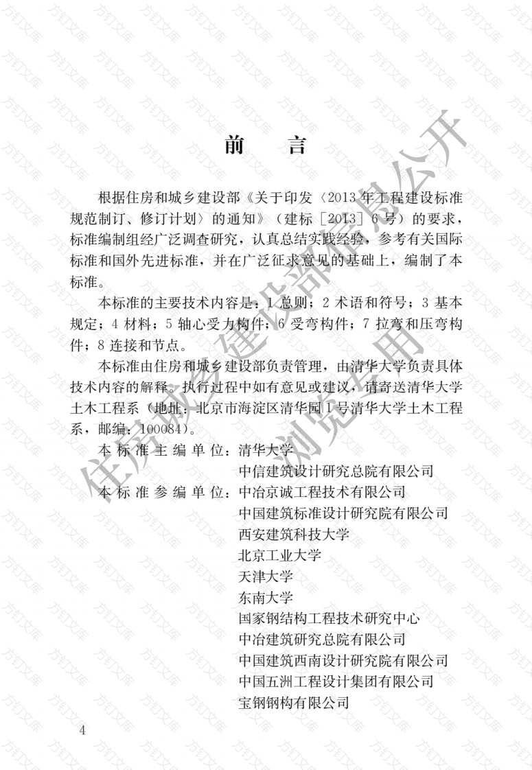 前根据住房和城乡建设部《关于印发2013年程建设标准规范制订、修订计划〉的通知》(建标6号)的要求,标准编制组经广泛调查研究,认真总结实践经验,参考有关国际标准和国外先进标准,并在广泛征求意见的基础上,编制了本标准。本标准的主要技术内容是:总则;2术语和符号;3基本规定;4材料;5轴心受力构件,6受弯构件;7拉弯和压弯构件;8连接和节点。本标准由住房和城乡建设部负责管理,由清华大学负责具体技术内容的解释。执行过程中如有意见或建议,请寄送清华大学土木工程系(地址:北京市海淀区清华园号清华大学土木工程系,邮编:100084)本标准主编单位:清华大学中信建筑设计研究总院有限公司标准参编单位:中冶京诚工程技术有限公司中国建筑标准设计研究院有限公司西安建筑科技大学文北京工业大学天津大学东南大学国家钢结构工程技术研究中心中冶建筑研究总院有限公司中国建筑西南设计研究院有限公司中国五洲工程设计集团有限公司万文宝钢钢构有限公司浙江东南网架股份有限公司浙江精工钢结构有限公司江苏省沪宁钢机股份有限公司上海中远川崎重工钢结构有限公司鞍钢股份有限公司舞阳钢铁有限责任武汉钢铁有限公司山东中通钢构建筑股份有限公司安阳钢铁股份有限公司马鞍山钢铁股份有限公司文山东钢铁股份有限公司莱芜分公司天津钢管集团股份有限公司北京市建筑工程研究院有限责任公司深圳市建筑设计研究总院有限公司住房城乡上海建工五建集团有限公司香港华艺设计顾问(深圳)有限公司深圳市清华苑建筑与规划设计研究有限公司杭州恒达钢结构实业有限公司北京国电龙源环保工程有限公司中信金属有限公司重庆大学北京首钢国际工程技术有限公司本标准主要起草人员:石永久施刚温四清郝际平张爱林丁阳舒赣平郁银泉余海群刘毅远贺明玄丁大益吴耀华周观根陈国栋刘志东董卫国刘明张华红童明伟员建成奚铁左勇志陈勤刘臣吴晖李琰文王元清王喆陈学森赵嘉康赵俊林左权胜劳俊王卫永王厚昕张旦天李丰功商存亮本标准主要审查人员:娄范重范峰肖从真周健朱丹住房城乡建设部信息傅中俊方订浏览专用方钉方方订文