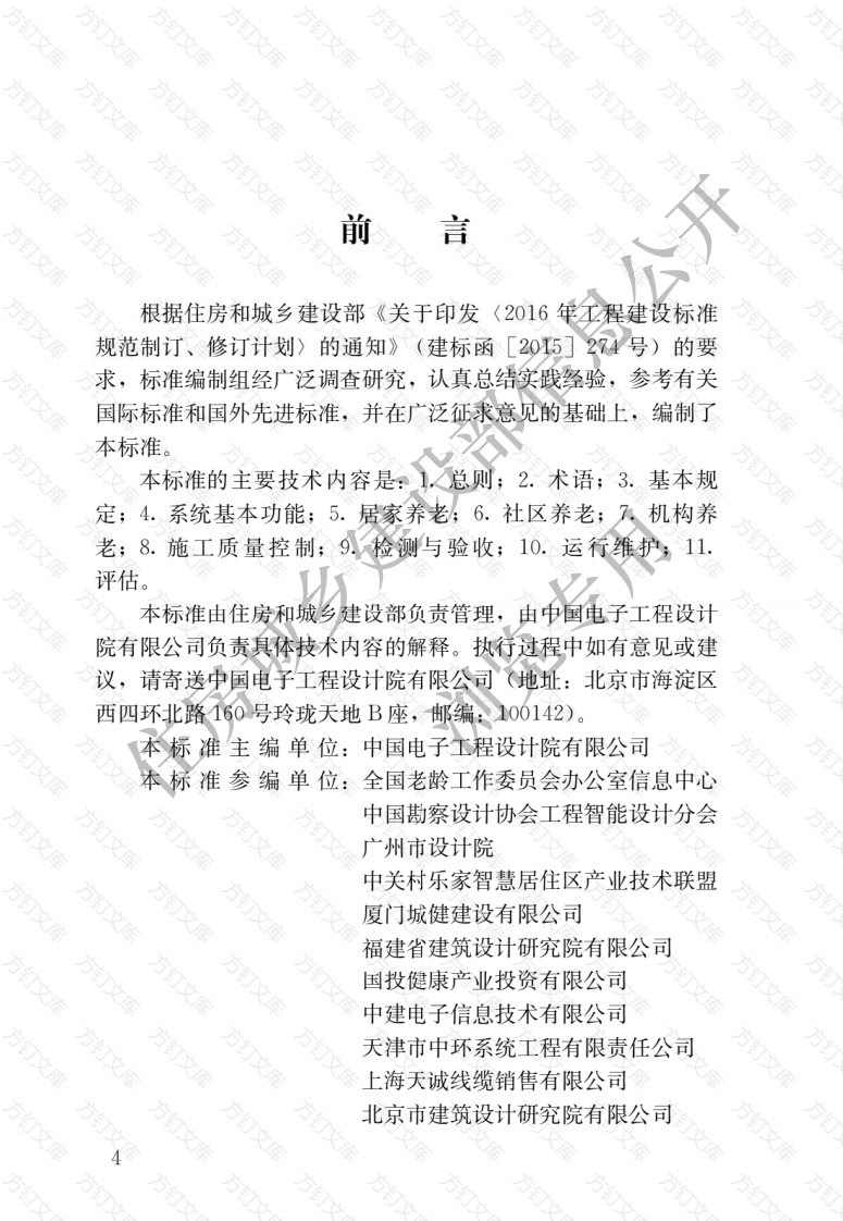 方万文方根据住房和城乡建设部《关于印发〈2016年工程建设标准规范制订、修订计划〉的通知》(建标函[205]274号)的要求,标准编制组经广泛调查研究,认真总结实践经验,参考有关国际标准和国外先进标准,并在广泛征求意见的基础上,编制了本标准。本标准的主要技术内容是:1.总则;2.术语;3.基本规定;4.系统基本功能5.居家养老:机构养11评估。本标准由住房和城乡建设部负责管理,由中国电子工程设计院有限公司负责具体技术内容的解释。执行过程中如有意见或建议,请寄送中国电子工程设计院有限公司(地址:北京市海淀区西四环北路160号玲珑天地B座,邮编:100142)本标谁主编单位:中国电子工程设计院有限公司本标准参编单位:全国老龄工作委员会办公室信息中心中国勘察设计协会工程智能设计分会广州市设计院中关村乐家智慧居住区产业技术联盟方订厦门城健建设有限公司福建省建筑设计研究院有限公司国投健康产业投资有限公司中建电子信息技术有限公司天津市中环系统工程有限责任公司上海天诚线缆销售有限公司北京市建筑设计研究院有限公司方方福建建集团有限公司方订福建省华荣建设集团有限公司海峡建工集团有限公司闽晟集团城建发展有限公司向阳建设实业有限公司海格电气(惠州)有限公司恒锋信息科技股份有限公司方方中电投工程研究检测评定中心有限公司北京世源希达工程技术有限公司机械还业第六设计研究院有限公司中国建筑设计研究院有限公司辽宁省建筑设计研究院有限责任公司北京北大青鸟安全系统工程技术有限住房城乡公司中国建筑东北设计研究院有限公司悉地(北京)国际建筑设计顾问有限公司中国五洲工程设计集团有限公司欧普照明股份有限公司深圳市视得安罗格朗电子有限公司广东天元建筑设计有限公司远洋养老运营管理有限公司广州奥特信息科技股份有限公司广州智能科技发展有限公司智慧华川养老(北京)有限公司本标准主要起草人员:李洪鹏谢卫肖建平杜新明李强王京王瑞张永刚李爽林卫东李鹏张维朱立彤郑清达张旭谭韩玉仲陈琪李杨胡晓雪黄敏桐王丹蕾刘洁吴国曾李朝栋徐学民姚艳青罗才喜桂佳琳李纲林能影李涛黄河朱峭丁淮剑孙胜进张达勇乔家峰沈孔祥元林忠东卢健肖世江叶德福杨家泓张建新颜翱罗敏静本标准主要审查人员:焦建欣管小军李国翚刘毛剑瑛吕晋栋项敏住房城乡建浏览专用方钉万文文