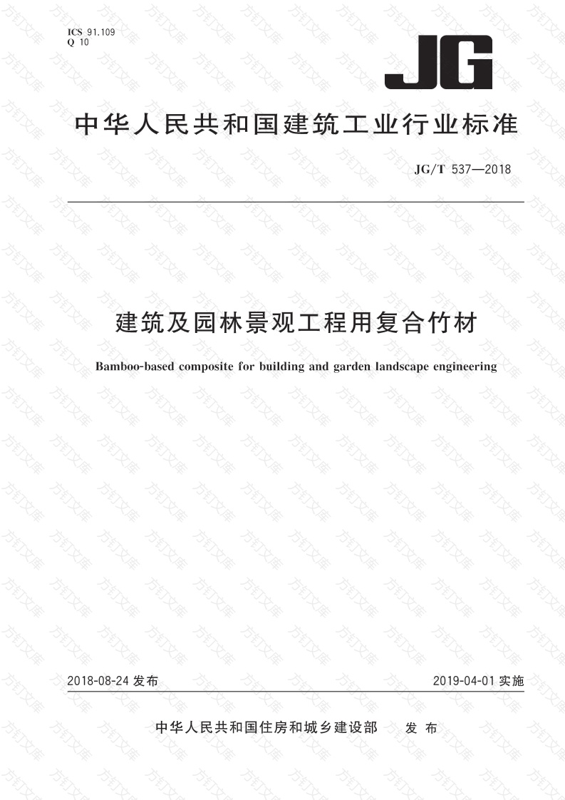 ICS91.109Q10中华人民共和国建筑工业行业标准JG/T537-2018建筑及园林景观工程用复合竹材Bamboo-based composite for building and garden landscapeengineering钉方方订万方万文018-08-24发布2019-04-01实施中华人民共和国住房和城乡建设部发布方万JG/T537-2018方万目次前言范围规范性引用文件3术语和定义4分类和标记5一般要求6检验方法8检验规则9包装、标志、运输和贮存方钉钉方方5372018万文本标准按照GB/T1.1一2009给出的规则起草。本标准由住房和城乡建设部标准定额研究所提出,本标准由住房和城乡建设部建筑制品与构配件标准化技术委员会归口。本标准负责起草单位:中国木材保护工业协会、杭州大索科技有限公司。本标准参加起草单位:浙江新海业竹科技有限公司、赣州森泰竹木有限公司、福建金竹竹业有限公司、浙江永裕竹业有限公司、木材节约发展中心、卓达竹木产业科技有限公司、安徽宏宇竹业科技有限公司、鹰潭易可竹业有限公司、上海摩紫新型装饰材料有限公司、太尔胶黏剂(广东)有限公司、浙江庄禾竹业科技有限公司、洪雅竹元科技有限公司、中国物流与采购联合会木材与木制品质量监督检验测试中心、杭州庄宜家具有限公司、福建盈昌竹木生态科技有限公司、湖南风河竹木科技股份有限公司、杭州新竹文化创意有限公司、南京林业大学本标准主要起草人:喻酒秋、刘红征、党文杰、林海、陶以明、颜景奇、张亚慧、熊晓晶、宁其斌、李小贤、方务新、唐镇忠、宋剑刚、范昫胸、边国民、仲维水、邬康文、蒋永健、马守华、何品才、戚士龙、高春娥、王倩、张少芳、颜凝香、王忠、何述光、徐江、薛中、沈海鹰、沈道海、沈长生、李海涛、余小溪、,李钊。万方方订方万