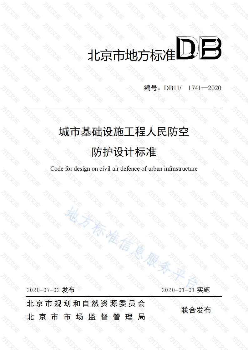 方方文北京市地方标准万文编号:DB11/1741-2020城市基础设施工程人民防空防护设计标准Code for design on civil air defence of urban infrastructure方方订方万方方2020-07-02发布2020-01-01实施北京市规划和自然资源委员会联合发布北京市市场监督管理局方方方文北京市地方标准万城市基础设施工程人民防空防护设计标准Code for design on civil air defence of urban infrastructureDB11/1741-2020主编单位:北京城建设计发展集团股份有限公司批准部门:北京市规划和自然资源委员会北京市市场监督管理局万实施日期:2021年01月01日方文方订标准信息服务平合方万文万万万文2020北京前言为贯彻落实习近平总书记关于“加强人防设施,把人防设施与城市基础设施结合起来,实现军民兼用”的指示,提高城市防空袭能力,保障城市基础设施战时安全有效运行,根据市政府《关于贯彻落实习近平总书记听取北京城市总体规划工作时重要指示精神任务清单分工方案》的要求以及市委、市政府关于加强首都人民防空工作部署,按照北京市规划和自然资源委员会《北京市“十三五”时期城乡规划标准化工作规划》和北京市市场监督管理局《关于印发2018年北京市地方标准制修订项目计划的通知》(京质监发(2018)20号)的要求,编制组在广泛调查研究、认真总结实践经验、吸取科研成果以及广泛征求意见的基础上,完成本标准的编制工作。本标准共分8章,主要内容包括:1.总则:2.术语:3.基本规定:4.轨道交通工程:5.城市地下联系隧6.城市综合管廊:7.城市地下综合体和综合客运交通枢纽:8.生产调度指挥中心。本标准第3.2.1条为强制性条文,必须严格执行。本标准由北京市规划和自然资源委员会和北京市人民防空办公室归口管理,北京市城乡规划标准化办公室负责日常管理,北京城建设计发展集团股份有限公司负责具体技术内容的解释。(地址:北京市西城区阜成门北大街5号:邮政编码:100037:电子邮箱:)本标准执行过程中如有意见和建议,请寄送至北京市城乡规划标准化办公室,以供今后修订时参考。(电话:68021694,邮箱:bbb3000@163.com)本标准主编单位:北京城建设计发展集团股份有限公司本标准参编单位:军事科学院国防工程研究院北京市市政工程设计研究总院有限公司北京市建筑设计研究院有限公司本标准主要起草人员:戴晓春刘云飞王哲郭婷杨京生曹宗豪张建海薛慧立吕志成叶菁赵新华韩全胜左军段世昌刘运亮张枯张良焊朱江蓝晓丹江琴齐瑞颖陈瓯黄思莹张立超吕馨沈铮林成虎张鹏飞贺强强倪西民本标准主要审查金路姚赤飙段进宇唐琼李端文王阳明方万