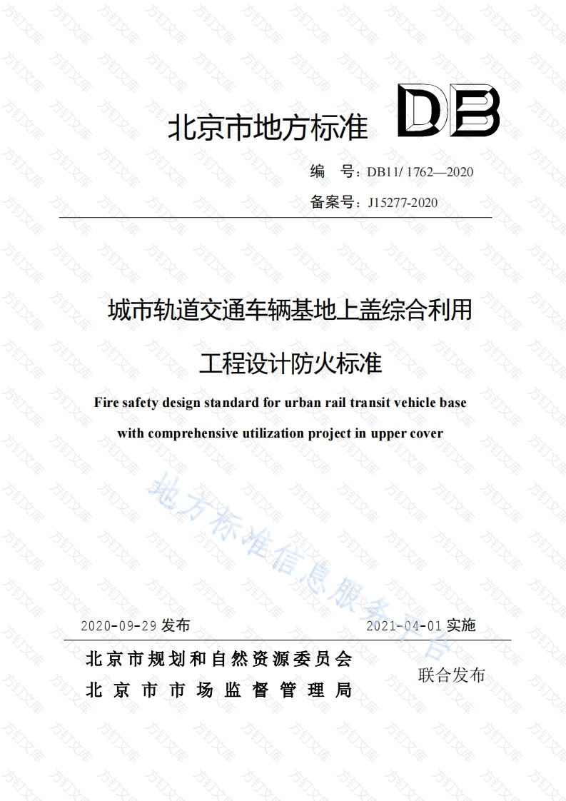 北京市地方标准编号:DB11/1762-2020备案号:J15277-2020城市轨道交通车辆基地上盖综合利用工程设计防火标准Fire safety design standard for urban rail transit vehicle basewith comprehensive utilization project in upper cover地方标准信息服文万文2020-09-29发布2021-04-01实施北京市规划和自然资源委员会联合发布北京市市场监督管理局方方文北京市地方标准城市轨道交通车辆基地上盖综合利用工程设计防火标准Fire safety design standard for urban rail transit vehicle basewith comprehensive utilization project in upper coverDB11/1762—2020主编单位:北京市基础设施投资有限公司中国建筑科学研究院有限公司北京城建设计发展集团股份有限公司批准部门:北京市规划和自然资源委员会北京市市场监督管理局实施日期:2021年04月01日2020北京DB111762-2020前言为加强城市轨道交通车辆基地上盖及周边土地的综合开发利用,指导城市轨道交通车辆基地上盖综合利用工程消防设计工作,根据北京市市场监督管理局《关于印发2020年北京市地方标准制修订项目计划的通知》(京市监发[2020]19号)文件的要求,标准编制组经过深入调查和研究,总结相关项目建设、管理实践经验,借鉴国内外先进做法,立足北京实际的基础上,编制本标准。本标准共分9章,主要内容包括:总则、术语、火灾危险性分类及耐火等级、总平面布局与平面布置、防火分区与建筑构造、安全疏散、消防给水与灭火设施、防烟与排烟、消防电气。本标准中3.2.1、4.3.1条(款)为强制性条文,必须严格执行。本标准由北京市规划和自然资源委员会归口管理,北京市城乡规划标准化办公室为日常管理机构,中国建筑科学研究院有限公司负责具体技术解释工作。本标准执行过程中如有意见和建议,请寄送至北京市城乡规划标准化办公室,以供今后修订时参考。(电话:55595016,邮箱:主编单位:北京市基础设施投资有限公司中国建筑科学研究院有限公司北京城建设计发展集团股份有限公司编单位:北京市市政工程设计研究总院有限公司北京市轨道交通设计研究院有限公司华通设计顾问工程有限公司北京火正消防安全技术研究院有限公万文北京市轨道交通建设管理有限公司北京城市快轨建设管理有限公司