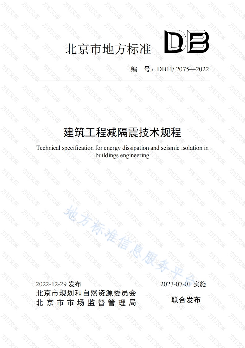 北京市地方标准编号:DB11/2075-2022建筑工程减隔震技术规程echnicalspecificationfor energydissipation and seismic isolationinbuild ings engineering方万文方方地方标准信息服务万2022-12-29发布2023-07-01实施北京市规和自然资源委员会北京市市场监督管理局联合发布文北京市地方标准建筑工程减隔震技术规程echnical specificationfor energy dissipation and seismicisolation inbuildings engineeringDB11/2075-2022主编单位:北京市建筑设计研究院有限公司北规院弘都规划建筑设计研究院有限公司北京建筑大学批准部门:北京市规划和自然资源委员会北京市市场监督管理局实施日期:日2023年07月01文信息服务平合文万文2022北京方万为贯彻落实党的十九大精神,推动《北京城市总体规划(2016年-2035年)》实施,根据《北京市“十三五”时期城乡规划标准化工作规划》和北京市市场监督管理局《2021年北京市地方标准制修订项目计划(第一批)》(京市监发(2021)19号)的要求,规程编制组经广泛调查研究,认真总结实践经验,吸取科研成果,并在广泛征求意见的基础上,制定本规程。本规程的主要技术内容是:1.总则;2.术语和符号:3.基本规定:4.地震作用和作用效应计算;5.地震时正常使用建筑的性能目标及设计:6.消能器的技术性能:7.消能减震结构设计:8.消能部件与结构的连接构造;9.消能部件的施工、验收和维护:10.隔震支座的技术性能:11.隔震结构设计:12.建筑与机电隔震构造;13.隔震分部工程的施工、验收和维护:14.建筑物地震反应观测系统和隔震建筑监测系统。本规程中第3.1.8条及13.3.5条为强制性条文,必须严格执行。本规程由北京市规划和自然资源委员会、北京市市场监督管理局共同负责管理,由北京市规划和自然资源委员会归口并负责组织实施,北京市规划和自然资源标准化中心负责日常管理,北京市建筑设计研究院有限公司负责具体技术内容的解释。(地址:北京市西城区南礼士路62号:联系电话:010-88043359)本规程执行过程中如有意见和建议,请寄送至北京市城乡规划标准化办公室,以供今后修订时参考。(电话:010-55595000,邮箱:bibb@ghzrzyw.beijing.gov.cn)本规程主编单位:北京市建筑设计研究院有限公司北规院弘都规划建筑设计研究院有限公司北京建筑大学本规程参编单位:清华大学万中国地震局工程力学研究所北京市地震局震安科技股份有限公司北京工业大学北京城建设计发展集团股份有限公中国建筑设计研究院有限公司北京维拓时代建筑设计股份有限公司北京城建亚泰建设集团有限公司泛华建设集团有限公司北京工程建设标准化协会北京交通大学规程主要起草人员:苗启松姜峰曾德民潘鹏王涛黄源安晓文霍文营卜龙瑰閤东东杜志超解琳琳管庆松彭凌云李洪求陈曦