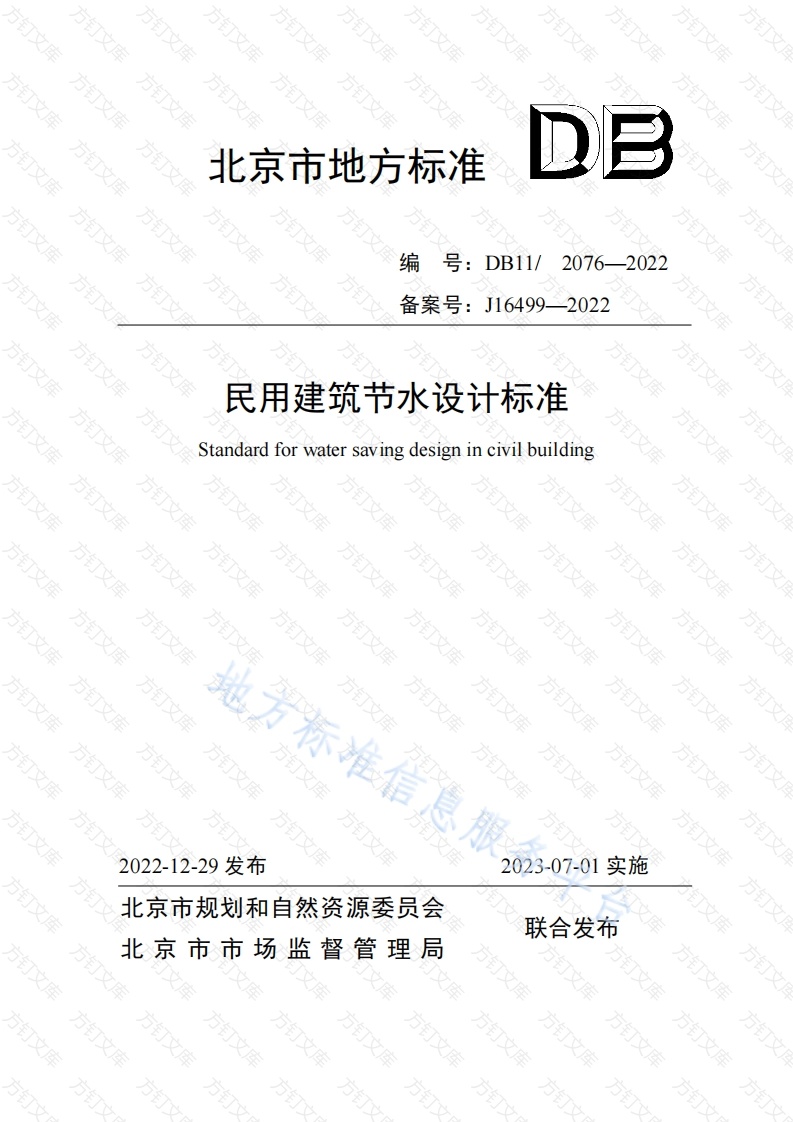 北京市地方标准编号:DB11/2076-2022备案号:J16499一2022民用建筑节水设计标准Standard for water saving design in civil building方方订万文2022-12-29发布2023-07-01实施北京市规划和自然资源委员会联合发布北京市市场监督管理局方方方方方方方万文方钉万文北京市地方标准民用建筑节水设计标准Standard for water saving design in civil building万万DB11/20762022主编单位:北京市建筑设计研究院有限公司批准部门:北京市规划和自然资源委员会北京市市场监督管理局实施日期:2023年07月01日万方万2022万万文万