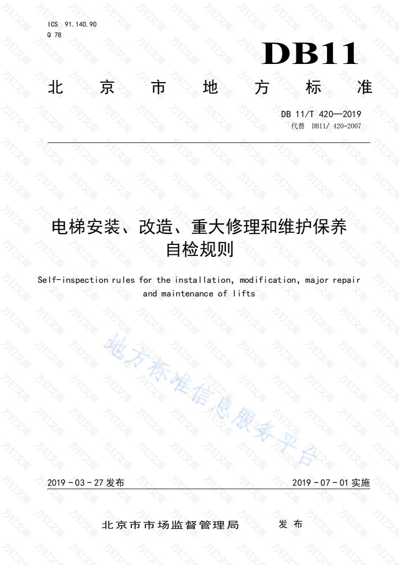 ICS91.140.90078北京市地方标准DB11/T420-2019代替DB11/420-2007电梯安装、改造、重大修理和维护保养自检规则Self-inspection rules forthe installation,modification,majorrepairand maintenance方方地方标准信息服务平方万万方文方2019-03-27发布2019-07-01实施北京市市场监督管理局发布方方方方方方方万文方库万文方方DB11/T420-2019次前言范围自检条件及检验检测仪器3自检要求流程要求5报告书编制要求6安全要求附录A(规范性附录)自检检验检测仪器设备附录B(规范性附录)电梯监督检验自检报告书一有机房曳引驱动电梯附录C(规范性附录)电梯监督检验自检报告书一无机房曳引驱动电梯35附录D(规范性附录)电梯监督检验自检报告书一自动扶梯与自动人行道65附录E(规范性附录)液压电梯监督检验自检报告书80附录F(规范性附录)杂物电梯监督检验自检报告书100附录G(规范性附录)曳引驱动电梯定期检验自检报告书113附录H(规范性附录)电梯定期检验自检报告书一自动扶梯与自动人行道131附录I(规范性附录)液压电梯定期检验自检报告书143附录J(规范性附录)杂物电梯定期检验自检报告155参考文献164方标准信息服务平万万文万文