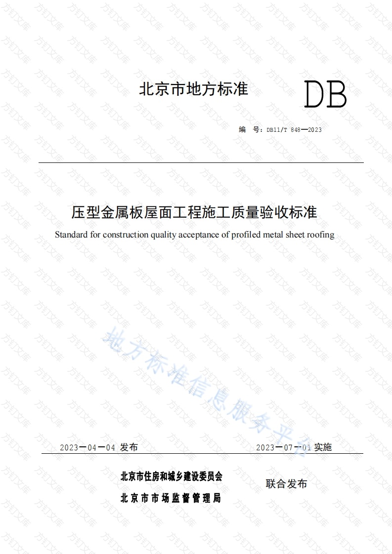 方方文北京市地方标准DB编号:DB11/T8482023压型金属板屋面工程施工质量验收标准Standardfor constructionquality acceptance of profiled metal sheet roofing方方文万地方标准信息服务方202304发布2023一07-01实施北京市住房和城乡建设委员会联合发布北京市市场监督管理局方方北京市地方标准万文万压型金属板屋面工程施工质量验收标准Standard for construction quality acceptance of profiled metal sheet roofing方方编848-2023主编部门:中国新兴建设开发有限责任公司方北京城建集团有限责任公司批准部门:北京市市场监督管理局万实施日期:2023年07月012023北京万文万文根据原北京市质量技术监督局《2018年北京市地方标准制修订项目计划》(京质监发(2018)20号)的要求,标准编制组经广泛调查研究,认真总结实践经验,参考国内外相关标准,并在广泛征求意见的基础上,修订本标准。本标准的主要技术内容是:1总则:2术语:3基本规定:4原材料与构件验收:5安装工程验收:6压型金属板屋面工程验收。本标准修订的主要技术内容是:1.对本标准的适用范围进行了调整,增加了采用压型金属板作为屋面持力板的单层防水卷材屋面和金属面夹芯板屋面。2.“基本规定”增加了压型金属板屋面抗风揭性能检测的内容和要求:增加了压型金属板屋面子分部、分项工程划分表。3.“原材料与构件验收”增加了金属面夹芯板、泛水板的验收要求。“安装工程验收”增加了支承系统安装、透汽层与隔汽层安装、金属面夹芯板安装、以金属压型板作为持力板的单层防水卷材屋面和附属设施安装的验收内容。“压型金属板屋面工程验收”将原标准“按工序或分项工程进行验收”修订为“按屋面分部工程进行验收”:增加了功能性检验和隐蔽工程验收的规定和要求。本标准由北京市住房和城乡建设委员会和北京市市场监督管理局共同负责管理,北京市住房和城乡建设委员会归口并负责组织实施,中国新兴建设开发有限责任公司负责具体技术内容的解释。执行过程中如有意见或建议,请寄送中国新兴建设开发有限责任公司(地址:北京市海淀区太平路44号院)。本标准主编单位:中国新兴建设开发有限责任公司北京城建集团有限责任公司本标准参编单位:北京建工集团有限责任公司中国新兴集团有限责任公司北京城建远东建设投资集团有限公司东方诚建设集团有限公司