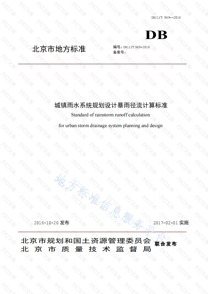 DB11/T969-2016ウ北京市地方标准编号:DB11/T969-2016备案号:文城镇雨水系统规划设计暴雨径流计算标准Standard of rainstorm runoff calculation文for urban storm drainage system planning and design方方方地方标准信息服方订万文2016-10-20发布-02-01实施北京市规划和国土资源管理委员会联合发布北京市质量技术监督局DB11/T969-2016北京市地方标准城镇雨水系统规划设计暴雨径流计算标准Standard of rainstorm runoff calculationfor urban storm drainage system planning and designDB11/T969-2016方万主编单位:北京市城市规划设计研究院批准部门:北京市规划和国土资源管理委员会北京市质量技术监督局实施日期:2017年02月01万文服务平库2016北京文文DB11/9692016本标准是根据原北京市规划委员会《北京市“十二五”时期城乡规划标准化工作规划》及北京市质量技术监督局《京质监标发[2012]第20号》立项计划,由北京市城市规划设计研究院等单位编制。编制组在执行《城市雨水系统规划设计暴雨径流计算标准》(DB11/T969-2013)基础上,经广泛调查研总结实战经验,参考有关国内外标准,对本标准进行了修编本标准的主要技术内容是:适用于雨水管道、排水明渠及雨水泵站规划设计的流量计算方法、雨强度公式、径流系数、重现期以及设计降雨雨型。分为1.总则;2.术语;3.技术内容等章节。本次标准修编的主要技术内容是:补充规定推理公式法计算雨水设计流量的适用范围和采用数学模型法计算设计流量的要求;体编了取样方法为年最大值法的操雨强度公式:取消折减系数;修正规划综合径流系数及其用途;补充规定:的确定方法;补充规定立体交叉道路雨水管渠(含泵站)设计重现期;补充以暴雨强度公式法以及水文手册查值法推求北京市I区、Ⅱ区两个暴雨分区不同重现期的1440min时间段设计雨型等。本标准由北京市规划和国土资源管理委员会归口管理,北京市城市规划设计研究院负责具体技术内容解释工作,日常管理机构为北京市城乡规划标准化办公室。各单位在执行本规范的过程中,如发现需要修改与补充之处,请将意见和建议反债给北京市城市规划设计研究院(北京市西城区南礼士路60号,邮编:100045,联系电话:88073705,邮箱:北京市城乡规划标准化办公室联系电话:68017520,邮箱:本标准主编单位:北京市城市规划设计研究院本标准参编单位:北京市市政工程设计研究总院有限公司北京市水文总站北京市水科学技术研究院北京工业大学北京市气象局北京市排水集团有限公司标准主要起草人员:张晚听、韦明杰、王军、周楠森、李艺、李振川、杨忠山、马京津、高振宇、付征垚、王强、李萍、郭磊、王亚娟、周玉文、孟德娟、刘子龙、黄騁飞、姜明杰、白国营、张书函、王玉珍、房小怕、李晋、王、苏东彬、陈建刚、王理许标准主要审查人员:段伟、王义成、刘洪伟、郭金燕、都天文、赵世明、王建龙、赵乐军文DB11/T9692016万文方e次总则术语和定3.计算方法与参数雨水设计流量计算与方法3.2暴雨强度公式3.3重现期A3.4径流系数3.5设计雨型附录A7附录B22引用标准名录50本标准用词说明.51条文说明.52方万地方标准信息服务平合方方万方方方文DB11/T969—2016CONTENTSGeneralProvisionsTerms aand Definitions..3.Caculation Method and Parameters...3.1Caculation of Rainstorm Design Runoff and Method3.2Formula of Rainstorm Intensity.3.3Recurrence Interval.3.4 Runoff Coefficient.3.5 Design Rainfall PatternAppendix A.Appendix B..List of Quoted Standards.51Explanation of Words in This Standard50Explannation of Provisions52库方方方地方标准信息服务平合方万方钉方文DB11/T969—20161.0.1为规范北京市行政区域内城镇雨水系统规划设计工作,提高雨水系统规划设计质量和水平确保城市雨水系统的安全可靠,减少城市内涝灾害,编制本标准。1.0.2本标准适用于北京市行政区域内新建、改建、扩建城镇雨水系统的规划和设计,以及内涝积水模拟计算。1.0.3本标准规定了城镇雨水系统规划设计中暴雨径流计算的基本方法和参数。1.0.4城镇雨水系统规划设计暴雨径流计算除应执行本标准外,尚应符合国家及北京市现行有关标准的规定。方方方方订方万DB11/T969-2016术语2.0.1设计降雨历时duration of降雨过程中的设计时段。万2.0.2暴雨强度rainstorm intensity单位时间内的降雨量,工程上常用单位时间单位面积内的降雨体积表示。2.0.3暴雨分区rainstorm partition将某一地区划分为若干具有相同暴雨特征的区域。2.0.4重现期recurrence interval在一定长的统计期间内,等于或大于某统计对象出现一次的平均时间间隔。2.0.5年最大值法annual maximum value method从每年的降雨资料系列中均选取一个降雨量最大值作为样本系列,进行频率计算的选样方法。2.0.6汇水面积catchment area雨水管渠汇集降雨的流域面积。2.0.7径流系数runoff coefficient定汇水面积某一时间段内地面径流水量与降雨量的比值。2.0.8综合径流系数weighted runoff coefficient在总汇水面积上各种不同性质地面的径流系数的面积加权平均数值。2.0.9雨水控制与利用设施stormwater managementand harvest用于削减本区域外排径流总量、峰值及降低径流污染和雨水回用设施的总称。包括雨水滞蓄、收集回用和调节等。2.0.10雨水泵站stormwater pumping station分流制排水系统中,提升雨水的泵站。2.0.11设计雨型design rainfall pat tern反映降雨强度随时间变化的典型降雨过程。2.0.12城市内涝urban local pluvial f1 ooding强降雨或连续性降雨超过