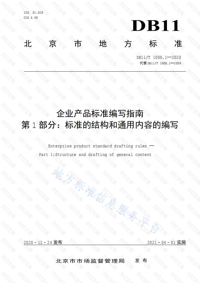 ICS01.020CCS A 00北京市地方标准DB11/T1000.1-2020代替DB11/T1000.1-2009万万企业产品标准编写指南第1部分:标准的结构和通用内容的编写Enterprise productstandard drafting rulesPart1:Structure and drafting of generalcontent万方方地方标准信息服务平方方方方2020-1224发布2021-04-01实施北京市市场监督管理局发布方DB11/T1000.1—2020次前范围2规范性引用文件.3术语和定义.产品标准结构与层次.·5通用内容的编写.616附录A(资料性)封面示意图21附录B(资料性)前言编写示例22附录C(资料性)注的用法23附录D(资料性)量和单位24附录E(规范性)标准中的字体和字号2628方方地方标准信息服务平合方万方DB11/T10002020本文件按照GB/T-2020《标准化工作导则第1部分:标准化文件的结构和起草规则》的规定起草。本文件是DB11/T1000《企业产品标准编写指南》的第1部分。DB11/T1000已经发布了以下部分第1部分:标准的结构和通用内容的编写。本文件代替DB11/T1000.1一2009《企业产品标准编写指南第1部分:标准的结构和通用内容的编写》,与DB11/T1000.1一2009相比,除结构调整和编辑性改动外,主要技术变化如下:)增加了“要素”的相关内容,和图1以及后面章节呼应(见4.1.1):b)调整了“产品标准的层次”的结构(见4.2和2009版3.2.1.1~3.2.1.5)c)增加了“列项”的表达方式和相应示例(见4.2.6):将“附录”相关内容从标准的“层次划分”调整到“通用内容的编写”(见5.10和2009版3.2.1.6):调整了“封面”的层次结构(见5.1和2009版5.1.1.1~5.1.1.8):f)在“标准编号”中删除了企业代号和顺序号为四位数的规定(见5.1.4)更新了标准中的大量示例(见4.2.2,4.2.6,5.2.3.4,5.4.2,5.7.1,5.7.4.1.3,5.7.4.1.5,5.7.4.1.6,5.7.4.3…):将标准名称中关于“要素”的表述调整为“元素”(见5.2):调整了“标准名称的形式”的层次结构(见5.2.3):修改了“前言”相关内容的表述(见5.4):k)调整了“规范性引用的两种形式”层次结构(见5.7.3.2):1)修改了注日期引用和不注日期引用的条件(见5.7.3.2.2和5.7.3.2.3):m)增加了“术语和定义”章节及编写要求(见5.8)n)增加了“技术要求”章节及编写要求(见5.9)o)增加了图和表的转页接排方式(见6.1.4.4,6.1.5.3.4)p)修改了“数学公式”相关内容(见6.2.1)增加了字体字号及其他内容的编排格要求见6.2.2和6.2.3):r)修改了附录A、附录B:万文s)增加了附录D、附录E。本文件由北京市市场监督管理局提出并归口。本文件由北京市市场监督管理局组织实施。本文件起草单位:北京市标准化研究院、北京标准化协会、北京科技大学本文件主要起草人:贾月芹、刘雪涛、李文峰、聂开鹏、罗桂平、张利歌潘崇超。本文件及其所代替文件的历次版本发布情况为:DB11/T1000.1一2009:本次为第一次修订。DB11/T1000.1-2020企业产品标准编写指南第1部分:标准的结构和通用内容的编写范围本文件规定了企业产品标准的结构与层次、通用内容的编写、要素的表述以及编排格式等内容。本文件适用于企业产品标准的编写,食品安全、药品、工程建设等领域标准的编写应符合其行业规规范性引用文件下列文件中的内容通过文中的规范性引用而构成本文件必不可少的条款。其中,注日期的引用文件,仅该日期对应的版本适用于本文件,不注日期的引用文件,其最新版本(包括所有的修改单)适用于本文件。GB/T 1.1标准化工作导则第1部分:标准化文件的结构和起草规则GB/T3101有关量、单位和符号的一般原则GB/T3102(所有部分)量和单位GB/T4728(所有部分)电气简图用图形符号GB/T5465.2电气设备用图形符号第2部分:图形符号GB/T6988(所有部分)电气技术用文件的编制方GB/T14691技术制图字体GB/T16273(所有部分)设备用图形符号GB/T20000.2标准化工作指南第2部分:采用国际标准GB/T20001.10标准编写规则第10部分:产品标准方万DB11/T1000.2企业产品标准编写指南第2部分:主要技术内容的编写术语和定义GB/T1.1和GB/T20001.10界定的术语和定义话用于本文件。产品标准结构与层次结构息服4.1.1要素4.1.1.1要素是标准中相对独立的功能单元。按照要素的作用,要素可分为规范性要素和资料性要素:按照要素存在的状态,要素可分为必备要素和可选要素。4.1.1.2心企业产品标准要素应包括:封面、前言、标准名称、范围、规范性引用文件、术语和定义,技术要求等。其中,规范性引用文件、术语和定义要素的章编号和标题是必备的。4.1.1.3企业产品标准要素还可包括目次、引言、符号代号和缩略语、分类和编码、参考文献和索引等。这些内容可根据产品标准中涉及的具体内容增删。DB11/T1000.12020文文4.1.2结构要求产品标准的结构是指一项产品标准应包括的要素和必要的章节。在编写产品标准时,首先应确定标准的结构。图1是典型产品标准的结构内容,但并不是所有产品标准都应按图1的结构编排。其中有些内容是必要的,有些内容是可选的,可以根据产品的特点,选择相应的内容。典型产品标准的结构见图1。封面*目次资料性概述要素引言方产品标准名称*规范性一般要素规范性引用文件幸术语和定义*产品分类技术要求*规范性技术要素规范性附录资料性补充要素参考文献方索引注“”是产品标准中应有的要素,未注明“”的均为可选择要素。图1典型产品标准的结构图4.2层次4.2.1层次划分标准的层次是指部分、章、条、段、列项和附录。表1给出了标准中各个层次的具体名称及相应的编号示例。层次及编号示例层次编号示例部分章66.1条6.1.1段无
