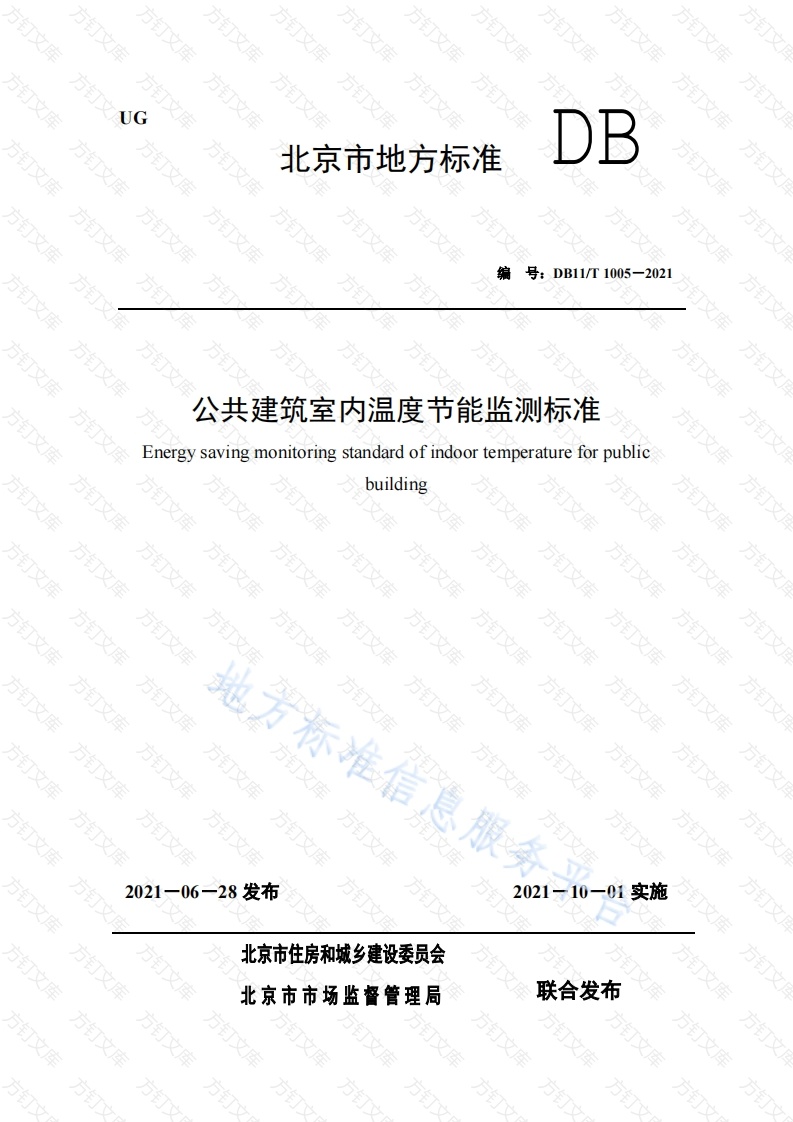 G北京市地方标准号:DB11/T1005-2021公共建筑室内温度节能监测标准Energy saving monitoring standard of indoor temperature for public文building地方标准信息服务方订方万2021-06一28发布021一10-01实施北京市住房和城乡建设委员会北京市市场监督管理局联合发布方方方方订万北京市地方标准公共建筑室内温度节能监测标准Energy saving monitoring standard of indoor temperature forpublicbuilding号:DB11/T1005-2021主编部门:北京市住房和城乡建设科学技术研究所批准部门:北京市市场监督管理局施行日期:2021年10月01日2021息服务平合北京万文根据原北京市质量技术监督局《关于印发2018年北京市地方标准制修订项目计划的通知》京质监发(2018)20号的要求,标准编制组经广泛调查研究,认真总结实践经验,并在广泛征求意见的基础上,对《公共建筑空调采暖室内温度节能监测标准》DB11T1005-2013进行了修订。本标准的主要技术内容是:1.总则:2.术语:3基本规定:4室内温度、相对湿度检测方法本标准修订的主要技术内容是:1.术语中增加了定点快速检测和移动快速检测:2基本规定中增加了移动快速检测用仪器仪表及技术要求:3.室内温度、相对湿度检测方法中增加定点快速检测方法和移动快速检测方法相关条款。本标准由北京市住房和城乡建设委员会、北京市市场监督管理局负责管理,由北京市住房和城乡建设委员会归口并负责组织实施。由北京市住房和城乡建设科学技术研究所负责具体技术内容解释。在实施过程中如发现需要修改和补充之处,请寄送至北京市住房和城乡建设科学技术研究所(地址:北京市通州区达济街9号院3301室,邮编:101160).本标准主编单位:北京市住房和城乡建设科学技术研究所本标准参编单位:北京市住房和城乡建设执法总队北京中建建筑科学研究院有限公司北京建筑材料检验研究院有限公司北京创意傅物联科技有限公司北京爱德姆能源科技有限公司本标准主要起草人员:徐俊芳王皆腾梁元元王会粉赵会刚王秀玲张金花李培方任静唐轩李建邱伟国魏晨晨吕芳刘建鹏李恕峰本标准主要审查人员:万水娥崔俊奎那威赵庆国勾昱君航杨茂忠万方方方次总则2术语3基本规定4室内温度、相对湿度现场检测方法4.1检测方法4.2数据处理与结果判定本规范用词说明条文说明方订万万方ContentsI General provisions2 Terms3 Basic requirements.4 The detection method of indoor temperature and relative humidity4.1 Detection method .......4.2 Data processing and results benchmarkExplanation of wording in this standardExplanation of proivisions文方方地方标准信息服务平万方总1.0.1为贯彻执行国家和北京市有关节约能源的法律、法规和政策,加强对公共建筑节能运行管理的指导,规范公共建筑供暖空调室内温度监测方法,制定本标准。1.0.2本标准适用于供暖空调系统运行期间公共建筑室内温度的节能监测。不适用于对室内温度有特定要求的公共建筑或区域。1.0.3公共建筑室内温度节能监测除应符合本标准外,尚应符合国家及北京市现行有关标准的规定方方订方方方万万万万文文方语2.0.1温度监测temperature monitoring采用温度测量仪器对建筑室内温度或温度分布进行检测,确定室内温度状况是否符合相关规定,并对室内温度的节能管理制度、方法及其执行情况进行监督的过程。2.0.2防辐射通风罩radiation-proof ventilation hood防止太阳、光线等热源对仪器的直接辐射和地面对仪器的反射辐射,保护仪器免受强风、雨、雪等的影响,并使仪器感应部分有适当的通风,能真实地感受外界空气温度和相对湿度变化的装置。2.0.3测点均布well-proportioned arrange of test points测点布置方法中的一种,以抽样楼层的公共区域作为受检区域,以楼层为单位对其进行均匀分区,以分区后的各个小区间的中心点为测点。2.0.4定点快速检测fixed-point rapid testing依据抽样检测或测点均布检测方法中的测试布置原则,通过缩短检测持续时长和数据记录时间间隔,获得受检区域温度的一种检测方法。2.0.5移动快速检测moving rapid testing在受检区域内,通过温度测量仪器在拟定测试线路上匀速移动的方式进行检测,获得受检区域温度的一种检测方法。方标准信息服务平合万万文万万文文方文基本规定3.0.1检测中使用的仪器仪表应按要求进行测试或校准,技术性能应符合表3.0.1的规定。表3.0.1检测用仪器仪表及技术要求仪器名称技术要求测试或校准要求具有自动采集和存储功能:测量范围应含0℃~50℃:测试或校准应至少包括18℃、20℃、24℃,温度测量仪器温度精确度<0.5℃:26℃、28℃温度分辨率0.1℃:移动快速检测时,温度响应时间不超过5$具有自动采集和存储功能:相对湿度测量仪器相对湿度分辨率0.1%RH:应给出相对湿度65%RH的测试或校准结果,相对湿度精确度≤5%RH。3.0.2公共建筑运行管理单位应建立含室内温度监控的节能运行管理制度,对室内温度等系统运行的主要参数进行日常监测并记录,室内温度不符合室内温度控制要求时,宜及时进行系统调节并记录。3.03公共建筑主要公共区域明显位置应装设温度、相对湿度测量仪表,测量仪表宜符合本标准表3.0.1中的技术要求。3.0.4应设有负责公共建筑室内温度节能监测的管理岗位。人员上岗前应经过节能培训,并定期自方养准信息服务平合文万方室内温度、相对湿度检测方法4.1检测方法411室内温度、相对湿度检测应在供暖空调期内,且应在公共建筑运营时间段内进行,检