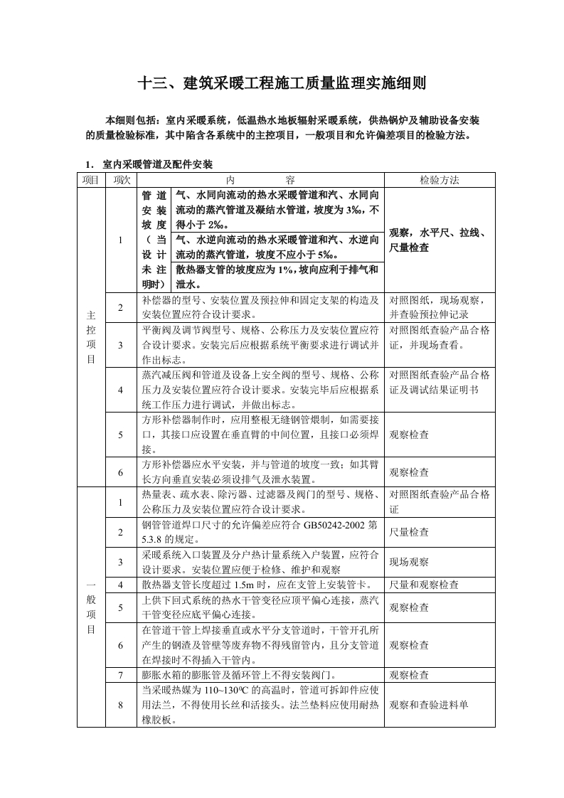 十三、建筑采暖工程施工质量监理实施细则本细则包括:室内采暖系统,低温热水地板辐射采暖系统,供热锅炉及辅助设备安装的质量检验标准,其中陷含各系统中的主控项目,一般项目和允许偏差项目的检验方法。1.室内采暖管道及配件安装内容检验方法管道气、水同向流动的热水采暖管道和汽、水同向安装流动的蒸汽管道及凝结水管道,坡度为3%,不坡度得小于2%。(当气、水逆向流动的热水采暖管道和汽、水逆向观察,水平尺、拉线、1流动的蒸汽管道,坡度不应小于5%。尺量检查设计未注散热器支管的坡度应为1%,坡向应利于排气和明时)泄水。补偿器的型号、安装位置及预拉伸和固定支架的构造及对照图纸,现场观察,2主安装位置应符合设计要求。并查验预拉伸记录控平衡阀及调节阀型号、规格、公称压力及安装位置应符对照图纸查验产品合格项3合设计要求。安装完后应根据系统平衡要求进行调试并证,并现场查看。作出标志。蒸汽减压阀和管道及设备上安全阀的型号、规格、公称对照图纸查验产品合格4压力及安装位置应符合设计要求。安装完毕后应根据系证及调试结果证明书统工作压力进行调试,并做出标志。方形补偿器制作时,应用整根无缝钢管煨制,如需要接5口,其接口应设置在垂直臂的中间位置,且接口必须焊观察检查接。方形补偿器应水平安装,并与管道的坡度一致:如其臂6观察检查长方向垂直安装必须设排气及泄水装置热量表、疏水表、除污器、过滤器及阀门的型号、规格、对照图纸查验产品合格1公称压力及安装位置应符合设计要求。证钢管管道焊口尺寸的允许偏差应符合GB50242-2002第2尺量检查53.8的规定。采暖系统入口装置及分户热计量系统入户装置,应符合3现场观察设计要求。安装位置应便于检修、维护和观察散热器支管长度超过1.5m时,应在支管上安装管卡。尺量和观察检查般上供下回式系统的热水干管变径应顶平偏心连接,蒸汽项观察检查干管变径应底平偏心连接。在管道干管上焊接垂直或水平分支管道时,干管开孔所6产生的钢渣及管壁等废弃物不得残留管内,且分支管道观察检查在焊接时不得插入干管内。7膨胀水箱的膨胀管及循环管上不得安装阀门。观察检查当采暖热媒为110-130℃的高温时,管道可拆卸件应使用法兰,不得使用长丝和活接头。法兰垫料应使用耐热观察和查验进料单橡胶板。焊接钢管管径大于32m的管道转弯,在作为自然补偿9时应使用煨弯。塑料管及复合管除必须使用直角弯头的观察检查。场合外应使用管道直接弯曲转弯。管道、金属支架和设备的防腐和涂料应附着良好,无脱10现场观察检查皮、起泡、流淌和漏涂缺陷。11管道和设备的允许偏差应符合GB50242-2002规定中表4.4.8的规定12采暖管道安装的允许偏差应符合下表8.2.18的规定项目允许偏差检验方法横管道管径≤100mm每1米纵、横方管径>100mm用水平尺、直1.5尺、拉线和尺量向弯曲全长管径≤100mm不大于13采暖检查(25m以上)管径>100mm不大于25管道每1米2吊线和尺量检的安立管垂直度(mm)全长(5米以上)不大于10查装管径≤100mm椭圆率10%管径>100mm8%用外卡钳和尺3弯管折皱不平度管径≤100mm量检查(mm管径>100mm52.辅助设备及散热器安装项目质量标准检验方法散热器组对后,以及整组出厂的散热器在安装之前应试验时间为2~3分钟,1作水压试验。试验压力如设计无要求时应为工作压力主控压力不降且不渗不漏。项目的1.5倍,但不小于0.6Mpa。水泵、水箱、热交换器等辅助设备安装的质量检验与按规范要求观察和尺量2验收应按规范规定执行。检查项目允许偏差(MM)检验方法散热器组队应平直紧密,组对后的平直度应符合下表8.3.3的规定。2-4片长翼型4组对后散热5-7片6拉线和尺量器平直度铸铁片式4一般钢制片式16-25片项目组队散热器的垫片应符合下列规定:1组对散热器垫片应使用成品,组对后垫片外露不应2观察和尺量检查2散热器垫片材质当设计无要求时,应采用耐热橡胶。散热器支架、托架安装,位置应准确,埋设牢固。散热器支架、托架数量,应符合设计或产品说明书要求。现场清点检查如设计未注时,则应符合下表83.5规定。散热器安装每组上部托钩下部托钩项次型式方式片数合计或卡架或卡架数24123①长翼挂5224型墙237243-812柱型91213柱翼挂②1316墙246型17-202521-25268381带柱型81211③柱翼足131622型落地17-202221-252散热器背面与装饰后的墙内表面安装距离,应符合设4尺量检查计或产品说明书要求。如设计未注明,应为30mm。5散热器安装允许偏差应符合下表83.7的规定项次项目允许偏差检验方法①散热器背面与墙内表面距离3②与窗中心线或设计定位尺寸尺量20③散热器垂直度3吊线和尺量铸铁或钢制散热器表面的防腐及面漆应附着良好,色6现场观察泽均匀,无脱落、起泡、流淌和漏涂缺陷。金属辐射板安装内容检验方法辐射板在安装前应作水压试验,如设计无要求时试验力试验压力下2~3min压1主应为工作压力1.5倍,但不得小于0.6Mpa力不降且不渗不漏。水平尺、拉线和尺量检项2水平安装的辐射板应有不小于5%的坡度坡向回管。查。目辐射板管道及带状辐射板之间的连接,应使用法兰连3观察检查接。4.低温热水地板辐射采暖系统安装内容检验方法主地下敷设的盘管埋地部分不应有接头隐蔽前现场查看控盘管隐蔽前必须进行水压试验,试验压力为工作压力的稳压1h内压力降不大项21