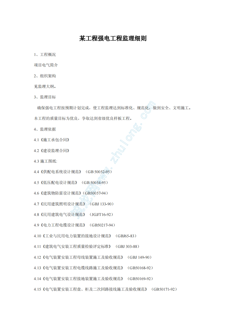 某工程强电工程监理细则1、工程概况项目电气简介2、组织架构见监理大纲。3、监理目标确保强电工程按预期计划完成,使工程监理达到标准化、规范化,做到安全、文明施工。本工程的质量目标为优良,争取达到省级优良样板工程。4、监理依据4.1《施工承包合同》4.2《建设监理合同》zhulong.4.3施工图纸:4.4《供配电系统设计规范》(GB50052-95)4.5《低压配电设计规范》(GB5005495)4.6《建筑物防雷设计规范》(GB50057-94)4.7《民用建筑照明设计规范》(GBJ133-90)4.8《民用建筑电气设计规范》(JGJT16-92)4.9《电力工程电缆设计规范》(GB50217-94)4.10《工业与民用电力装置的接地设计规范》(GB65-83)4.11《建筑电气安装工程质量检验评定标准》(GBJ303-88)4.12《电气装置安装工程母线装置施工及验收规范》(GBJ149-90)4.13《电气装置安装工程电缆线路施工及验收规范》(GB50168-92)4.14《电气装置安装工程接地装置施工及验收规范》(GB50169-92)4.15《电气装置安装工程盘、柜及二次回路接线施工及验收规范》(GB50171-92)4.16《电气装置安装工程电梯电气装置施工及验收规范》(GB50182-93)4.17《电气装置安装工程低压电器施工及验收规范》(GB50254-96)4.18《电气装置安装工程1KV及以下配线工程施工及验收规范》(GB50258-96)4.19《电气装置安装工程电气照明装置施工及验收规范》(GB50259-96)4.20《电气装置安装工程高压电器施工及验收规范》(GBJ147-90)4.21《低压成套开关设备验收规程》(CECS49:93)5、监理工作重点序号分部分项影响质量的因素主要对策1镀锌钢管管口不齐、乱丝、弯扁、跨接线漏焊、接线盒深入墙内、管子导致混凝土裂缝。①锯管时人要站直:套丝工具要调整适度:使用定型的电气用的弯管器。②管子在进箱盒要有适度的弯曲,以求得管和接线盒的配合过渡,应加锁紧螺母:暗配的管子应有1.5cm以上的混凝土护层。③按规范规定进行接地跨接。主要解决办法:对接线盒埋入过深,应用套盒过度,并焊好跨接线、作好防腐处理。2开关、插座盖板周围有缝隙或孔洞,开关、插座安装高度不一致、接线盒埋入太深。①接线盒口边,在墙面刮白前应先修正位置,并用水泥砂浆修口,待室内乳胶漆刷完后才可以安装开关、插座。②开关、插座的高度不一致,主要应在绑钢筋时、浇筑混凝土前有效控制,同层内应采取同一基准控制标高,接线盒应贴模板固定牢固。土建工程的支模尺寸应严格控制,杜绝抹灰层过厚。主要解决办法:①修补缝隙或孔洞:把开关、插座卸下,进行必要的剔凿,用水泥砂浆修口,补刷乳胶漆。②对高差较大的无法调好的接线盒,应彻底凿开混凝土,重新安装更换接线盒。3电缆线路过墙保护管长度不够,或不加保护管。电缆头制作质量差,电缆无标志牌。送电运行后,电缆电线的接线端子处发热①认真学习现行规范,执行电缆保护管的规定。②提倡使用定型的电缆首套,在干包防潮锥(应力锥)时应严格执行施工工艺,要美观:按规范要求挂标志牌。③注意市技术监督局公布的机电行业的监督检测报告,严禁使用不合格的产品,特别是铜接线端子的选用,应严格执行有关国家标准。一般端子宜先压接后镀锡,紧固螺栓必须配有弹簧垫,紧固力适度。铜和铜的接触必须镀锡。4防雷接地底板接地网的网格不清,跨接线截面不够,焊接长度不够。高度在30以上的阳台金属扶手及铝合金窗接地漏做。避雷带不平直①及时和设计部门联系,确定底板接地网的网格尺寸:熟悉规范,正确选用跨接线,一般宜选用和金属母材材质相同的材料,其截面不小于100mm2(圆钢为Φ12以上,推荐选用Φ14mm)。②认真做好均压带、及引出线,其截面应为不小于100mm2的镀锌钢材,引出线直接引向阳台金属扶手及铝合金窗的位置并作好标记,以便跨接。铝合金窗应有厚度不小于2mm的镀锌钢制跨接板引出,并且和铝合金窗接触良好。③先施工避雷带的支撑并调正,在把避雷带调直。避雷带宜选用Φ14mm镀锌圆钢5导线与电器连接铜导线接头未镀锡。多股导线连接未用端子。紧固件不是镀锌制品①对于沿海地区,铜与铜连接必须镀锡,未镀锡的应补做。②10mm2及以下的多股铜导线,宜用开口的接线端子,16mm2及以上应用套筒接线端子,压接后镀锡。③规范要求电气紧固件(除地脚螺栓外)必须采用镀锌制品,对于电气连接用紧固件,其平垫圈、弹簧垫圈必须配套齐全,施工中应严格执行此规定6灯具安装成排灯具不整齐、高度不一致。灯具的金属外壳不做接地(无PE线)①成排灯具安装应先拉线定下基准再打膨胀螺丝,对于在吊顶上安装的灯具,应以吊顶的自然分格为基准进行定位。在安装过程中,要进行多次检查调整的过程,直至达到规范的要求。②对于灯具的接地的问题,规范上并无明确的规定,一方面应这样理解:灯具是电器,其金属外壳应与“PE线”可靠连接(对TN一S系统):另一方面,看设计要求,根据安装的场所不同设计者会有明确的规定,在施工中主要应根据规定严格执行6、监理工作流程6.1工作流程图6.2流程说明: