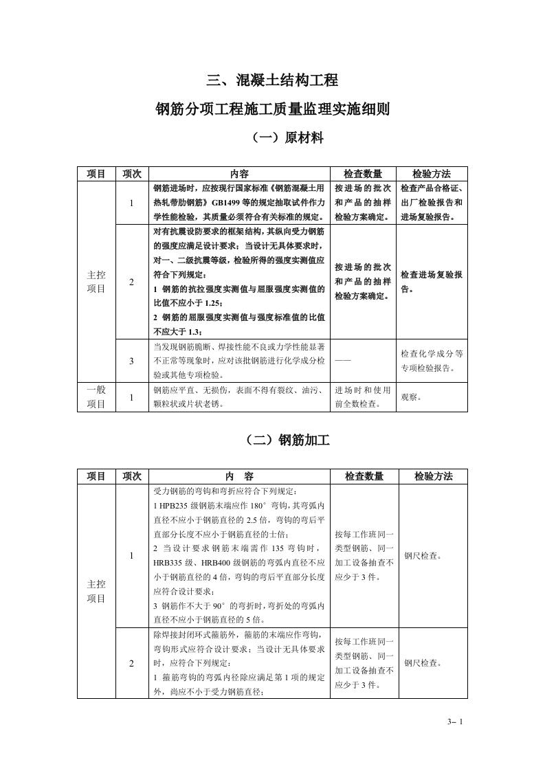 三、混凝土结构工程钢筋分项工程施工质量监理实施细则(一)原材料项目项次内容检查数量检验方法钢筋进场时,应按现行国家标准《钢筋混凝土用按进场的批次检查产品合格证、热轧带肋钢筋》GB1499等的规定抽取试件作力和产品的抽样出厂检验报告和学性能检验,其质量必须符合有关标准的规定。检验方案确定。进场复验报告。对有抗震设防要求的框架结构,其纵向受力钢筋的强度应满足设计要求:当设计无具体要求时,对一、二级抗震等级,检验所得的强度实测值应主控按进场的批次符合下列规定:检查进场复验报2和产品的抽样项目1钢筋的抗拉强度实测值与屈服强度实测值的告。检验方案确定。比值不应小于1.25:2钢筋的屈服强度实测值与强度标准值的比值不应大于13:当发现钢筋脆断、焊接性能不良或力学性能显著检查化学成分等3不正常等现象时,应对该批钢筋进行化学成分检专项检验报告。验或其他专项检验。一般钢筋应平直、无损伤,表面不得有裂纹、油污、进场时和使用观察。项目颗粒状或片状老锈。前全数检查。(二)钢筋加工项目项次内容检查数量检验方法受力钢筋的弯钩和弯折应符合下列规定:1HPB235级钢筋末端应作180°弯钩,其弯弧内直径不应小于钢筋直径的2.5倍,弯钩的弯后平直部分长度不应小于钢筋直径的士倍:按每工作班同一2当设计要求钢筋末端需作135弯钩时,类型钢筋、同一1钢尺检查。HRB335级、HRB400级钢筋的弯弧内直径不应加工设备抽查不小于钢筋直径的4倍,弯钩的弯后平直部分长度应少于3件。主控应符合设计要求:项目3钢筋作不大于90°的弯折时,弯折处的弯弧内直径不应小于钢筋直径的5倍。除焊接封闭环式箍筋外,箍筋的末端应作弯钩,按每工作班同一弯钩形式应符合设计要求:当设计无具体要求时,应符合下列规定:类型钢筋、同一钢尺检查。加工设备抽查不1箍筋弯钩的弯弧内径除应满足第1项的规定外,尚应不小于受力钢筋直径:应少于3件。3-12箍筋弯钩的弯折角度:对一般结构,不应小于90°:对有抗震等要求的结构,应为135°:3箍筋弯后平直部分长度:对一般结构,不宜小于箍筋直径的5倍:对有抗震等要求的结构,不应小于箍筋直径的10倍。按每工作班同一钢筋调直宜采用机械方法,也可采用冷拉方法。类型钢筋、同一1当采用冷拉方法调直钢筋时,HPB235级钢筋的观察,钢尺检查。冷拉率不宜大于1%加工设备抽查不应少于3件。钢筋加工的形状、尺寸应符合设计要求,其偏差一般应符合下表的规定(GB502042002规范表5.3.4)项目按每工作班同一项目类型钢筋、同一2受力钢筋顺长度方向全长的钢尺检查。加工设备抽查不净尺寸应少于3件。弯起钢筋的弯折位置±20箍筋内净尺寸±5(三)钢筋连接项目项次内容检查数量检验方法1纵向受力钢筋的连接方式应符合设计要求。全数检查观察在施工现场,应按国家现行标准《钢筋机械连接主控通用技术规程》JG)107、《钢筋焊接及验收规程》检查产品合格项目2JG)18的规定抽取钢筋机械连接接头,焊接接头按有关规程确定证、接头力学性试件作力学性能检验,其质量应符合有关规程的能试验报告。规定。钢筋的接头宜设置在受力较小处。同一纵向受力1钢筋不宜设置两个或两个以上接头。接头末端至全数检查观察,钢尺检查钢筋弯起点的距离不应小于钢筋直径的10倍。在施工现场,应按国家现行标准《钢筋机械连接通用技术规程》JG)107、《钢筋焊接及验收规程》全数检查观察GJ18的规定对钢筋机械连接接头、焊接接头的外观进行检查,其质量应符合有关规程的规定。当受力钢筋采用机械连接接头或焊接接头在同一检验批一般时,设置在同一构件内的接头宜相互错开。内,对梁、柱和项目纵向受力钢筋机械连接接头及焊接接头连独立基础,应抽接区段的长度为35倍d(d为纵向受力钢筋的较查构件数量的大直径)且不小于500m,凡接头中点位于该10%,且不少于3连接区段长度内的接头均属于同一连接区段。同件:对墙和板,3观察,钢尺检查。一连接区段内,纵向受力钢筋机械连接及焊接的应按有代表性的接头面积百分率为该区段内有接头的纵向受力自然间抽查钢筋截面面积与全部纵向受力钢筋截面面积的10%,且不少于3比值。同一连接区段内,纵向受力钢筋的接头面积墙可按相邻轴线百分率应符合设计要求:当设计我具体要求时,间高度5m左右3-2应符合下列规定:划分检查面,板1在受拉区不宜大于50%:可按纵横轴划分2接头不宜设置在有抗震设防要求的框架梁检查面,抽查端、柱端的箍筋加密区:当无法避开时,对等强10%,且均不少度高质量机械连接接头,不应大于50%:直接承受动力荷载的结构构件中,不宜采用焊接接头:当采用机械连接接头时,不应大于50%。同一构件中相邻纵向受力钢筋的绑扎搭接接头宜相互错开。绑扎搭接接头中钢筋的横向净距不应小于钢筋直径,且不应小于25m。钢筋绑扎搭接接头连接区段的长度为1.3(L·为搭接长度),凡搭接接头终点位于该连接区段长度内的搭接接头均属于同一连接区段。同一连接区段内,纵向钢筋搭接接头面积百分率为该区段内有搭接接头的纵向受力钢筋截面面积与全部纵向受力钢筋截面面积的比值(图5.4.6)4注:图中所示搭接接头同一连接区内的搭接钢筋为两根,当各钢筋直径相同时,接头面积百分率为50%。同一连接区段内,纵向受拉钢筋搭接接头面积百分率应符合设计要求:当设计