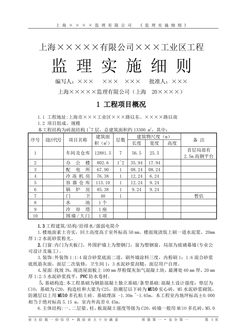 上海××××监理有限公司《监理实施细则》监理实施细则XXX XXX上海×××××监理有限公司(上海20××××)1工程项目概况1.1工程地址:上海市×××工业区×X×路以东、××××路以南1.2项目组成、规模本工程结构为砖混结构1~7层,总建筑面积约13300m2,其中:建筑面建筑物尺度(m)序号设计代号项目名称积(m2)层数长度备注宽度高度车间及仓库12881.57首层局部有56.525.52.5m高钢平台2办公楼802.61235.9417.94配电所67.90108.2408.244冷冻机房76.3812.246.245容器仓库113.10112.249.246锅炉房85.3819.249.247门卫40暂估水池1个9冷却塔1座10围墙/大门1项1.3工程建筑/结构/给排水/强弱电简介1.楼地面素土夯实,回土高度高于室外标高50mm。楼面现浇饭上刷一道水泥浆,20mm厚1:2水泥砂浆粉光。2.门窗:内门为夹板门,外围护墙上为塑钢门,窗为塑钢窗,局部为玻璃幕墙(专业公司设计及施工)。3.装饰:外装饰1:1:4混合砂浆底面二道,刷外墙涂料三度,内粉刷1:1:6混合砂浆底纸筋灰面,面层二次装修,卫生间1:3水泥砂浆刮糙,面层用户自理。4.屋面:找坡3%,现浇屋面板上100mm厚粉煤灰加气混凝土块,最薄处60mm厚,20mm厚1:2.5水泥砂浆找平,PVC防水卷材。5.基础构造:本工程基础为钢筋混凝土独立基础/条型基础:混凝土设计强度:垫层为C10,基础为C20,构造柱和大梁为C25,防潮层以下砖为MU10实心砖,M5水泥砂浆砌筑,防潮层以上用MU10多孔粘土砖。基础埋深-1.30m~-1.65m,本工程室内地坪标高±0.000相当于绝对标高5.15m,室内外高差0.45m。6.主体结构:一、二层梁、柱,板混凝土强度等级为C20,砖墙一般用MU10多孔砖,M5.0业主给我一份信任·我给业主十分满意质量第一·安全第一第1页业主给我一份信任·我给业主十分满意混合砂浆砌筑。7.给排水、电气概况8.室内给水管采用UPVC给水管,承插粘接,室外采用镀锌钢管,丝扣连接。9.室内消防管采用镀锌钢管,丝扣连接,室外消防管采用铸铁管,石棉水泥接口。10.排水管:废水和污水管室内采用UPVC排水管,室外雨水管及污水管为UPVC排水管。11.电气工程:电源为380/220V供电,室内电线管暗敷,采用阻燃型硬质塑料管。2编制依据1,已批准的监理规划2,与专业工程相关的标准3.设计文件4,技术资料5,施工组织设计3质量控制的内容1督促承建单位建立工程项目质量保证体系,承建单位是工程具体实施者,在项目开工前要求承建单位根据工程特点和质量要求,建立质量保证体系,有明确的质量管理目标和质量管理职责,以及完善的质量管理程序和办法。2为了掌握工程情况,取得良好的监理工作效果,监理人员要充分熟悉图纸,并对施工图进行审核,发现问题及时向设计单位建议。同时,参加设计技术交底与图纸会审会。3在施工前准备阶段,要事先做好各工序工种的质量控制,检查各工序工种的配合情况及相应的技术措施。审查承建单位编制的施工组织设计和技术措施,选择最佳施工方案。督促承建单位对质量要求及设计技术要求的落实,参加分项工程技术交底会,对控制桩和水准点进行复核。4严格按标准检查和验收订购的设备、材料、成品和半成品的质量,严禁无合格证或复试不合格的材料用于工程。5加强工序控制,对关键部位关键工序实行重点监控,进行中间检查和技术复核。6督促和检查承建单位严格按照施工规范、验收标准和设计图纸进行施工。7及时对各分项分布工程进行检查验收,对符合标准规定的项目进行签认,不合格项目令承建单位返工,直至合格,必要时发出停工指令。8检查承建单位特种作业人员和技术性较强的带班人员的上岗操作证,甚至按规范和操作规程进行抽查考核。4施工工艺过程的质量控制1定位放线和竖向控制。定位放线必须严格按规划红线和施工图纸对定位轴线进行复核,轴线和竖向偏差必须每层复核,每23层用外控和内控法(用天顶法)复核竖向偏差。2对基础、砌体、模板、层高、砂浆配合比,墙身轴线,预留孔位置等要严格控制检查和复核。3对基槽的地质情况必须严格按设计要求进行检查,基础回填土按规范要求。上海××××监理有限公司《监理实施细则》第2页上海××××监理有限公司《监理实施细则》4对士0.00以下的基础施工,隐蔽前必须进行隐蔽检查验收。5现浇钢筋混凝土构配件,检查钢筋型号、规格、数量、锚固长度、模板尺寸、模板支撑、预埋件、混凝土配合比、混凝土浇筑和混凝土养护。6检查水、电预埋管线标高、位置、坡度、尺寸、规格、品种。7施工单位设置沉降观测点,实行中间抽查和结构完成对观测点进行实测复核,并做好沉降观测记录,沉降观测点的设置和测量按设计和规范JGJ/T8-97进行。8对工程所使用的全部原材料及现场制作的混凝土、砂浆所有试块,均实行由建设单位和监理见证取样、送样制度,其中重点是影响结构及使用功能的原材料(水泥、钢筋、混凝土和砂浆试块、防水材料等)。9对基础工程、主体工程、装饰工程、安装工程进行中间验收,严格工程竣工的初验工作,对建筑进行综合检查,包括水、电等各种调试和测试符合设计对使用功能的要求,检查不合格的通知承建单位返修直至合格,然后申报质监站进行验收。10现场拌和混凝土、砂浆,其原材料砂、石、水泥和水必须经过严格计量,砂、石必须车车过磅。5分项、分部工程监理实施细则5.1地基与基础工程监理实施细则1土方开挖前在施工区域内设置临时或永久排水沟,修筑施工场地内机械运行的道路,主要干线