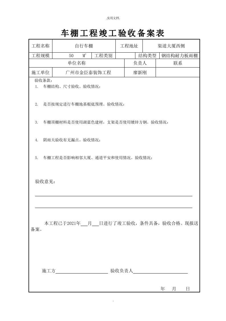 实用文档.车棚工程竣工验收备案表工程名称自行车棚工程地址渠道大厦西侧工程规模50工程类别结构类型钢结构耐力板雨棚单位名称负责人联系施工单位广州市金臣泰装饰工程廖新刚验收条款:1.车棚结构、尺寸验收。验收情况:2.是否按规定进行车棚地基根底预埋。验收情况:3.车棚顶棚材料是否使用湖蓝色建材,支架是否使用镀锌方钢。验收情况:4.阴雨天验收有无漏点。验收情况:5.车棚工程是否影响相邻大厦、通道平安和使用情况。验收情况:验收意见:本工程已于2021年月日进行了竣工验收,条件具备,验收合格。现报送备案。施工方验收负责人年月日