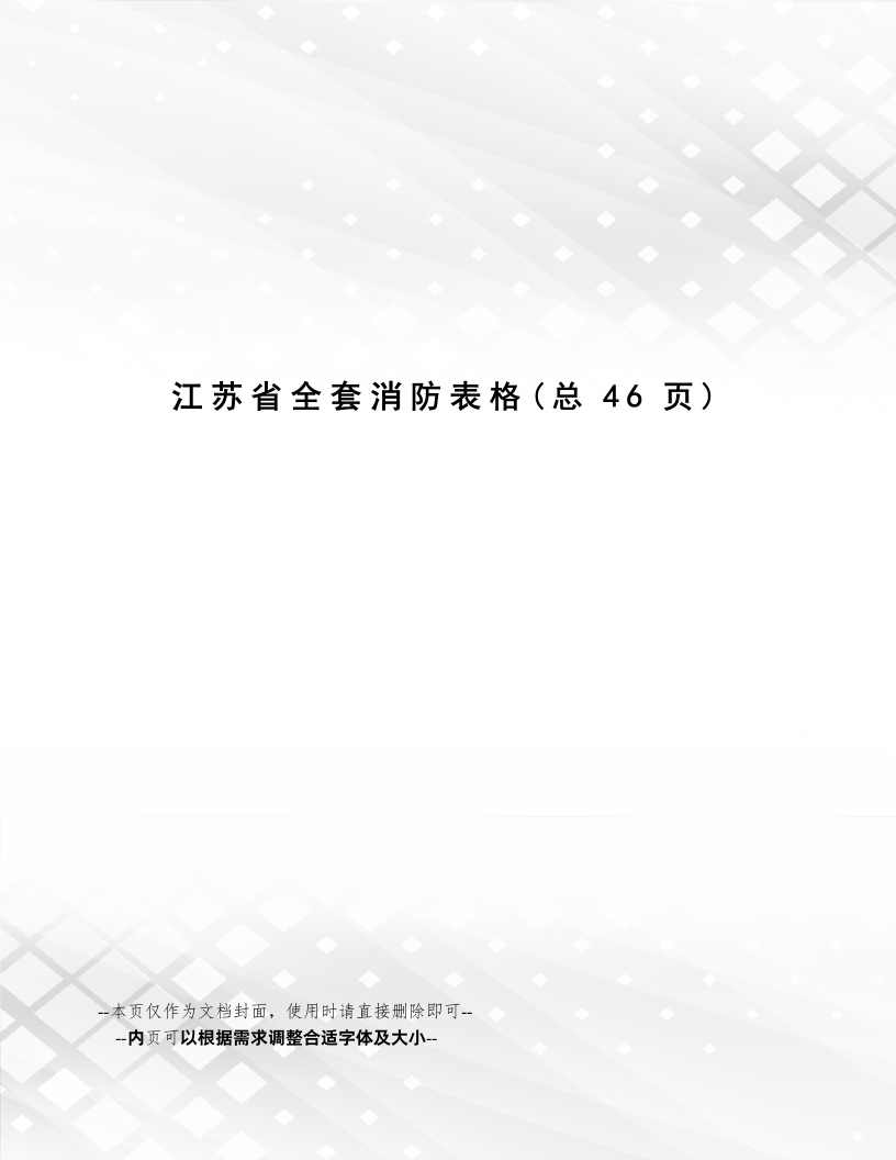江苏省全套消防表格(总46页)-本页仅作为文档封面,使用时请直接删除即可-内页可以根据需求调整合适字体及大小-附录四一A火灾自动报警系统施工安装质量记录目录序号资料名称编号页数1火灾自动报警系统质量保证资料核查表A-12图纸会审记录13设计变更明细表24技术交底记录35施工技术核定单46施工组织设计(方案)7开工报告68设备材料相关证件汇总表9设备开箱检查记录810材料检查记录911火定自动报警系统配管、配线安装检查记录A-212火灾自动报警系统电缆敷设检查记录A-313消防配电线路敷设检查记录1014火灾自动报警系统接地电阻测试记录A-415火定自动报警系统绝缘电阻测试记录A-516火灾自动报警系统配管配线隐蔽验收记录A-617火定自动报警系统电缆敷设隐蔽验收记录A-718消防配电线路隐蔽验收记录1119火灾自动报警系统报警控制器安装检查记录A-820火定自动报警系统联动控制器安装检查记录A-921火灾自动报警系统探测器安装检查记录A-1022火灾自动报警系统手动报警按钮安装检查记录A-1123火灾自动报警系统警报装置安装检查记录A-1224火定自动报警系统探测、报警点全点试验记录A-1325火定自动报警系统联动控制点全点试验记录A-146