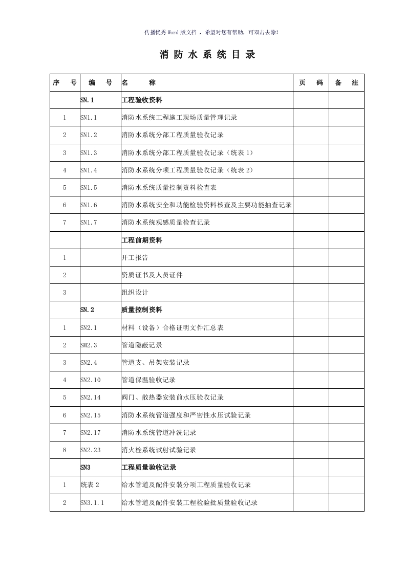 传播优秀Word版文档,希望对您有帮助,可双击去除!消防水系统目录序号编号名称页码备注工程验收资料消防水系统工程施工现场质量管理记录2消防水系统分部工程质量验收记录3消防水系统分部工程质量验收记录(统表1)4消防水系统分项工程质量验收记录(统表2)5消防水系统质量控制资料检查表6SN1.6消防水系统安全和功能检验资料核查及主要功能抽查记录7消防水系统观感质量检查记录工程前期资料1开工报告资质证书及人员证件组织设计S.2质量控制资料1SN2.1材料(设备)合格证明文件汇总表管道隐蔽记录3SN2.4管道支、吊架安装记录4SN2.10管道保温验收记录SN2.14阀门、散热器安装前水压验收记录6SN2.15消防水系统管道强度和严密性水压试验记录7SN2.17消防水系统管道冲洗记录SN2.23消火栓系统试射试验记录SN3工程质量验收记录1统表2给水管道及配件安装分项工程质量验收记录SN3.1.1给水管道及配件安装工程检验批质量验收记录传播优秀Word版文档,希望对您有帮助,可双击去除!3统表2室内消火栓系统安装分项工程质量验收记录SN3.1.2室内消火栓系统安装工程检验批质量验收记录5统表2消防给水设备安装分项工程质量验收记录6SN3.1.3消防给水设备安装工程检验批质量验收记录1统表2消防水泵接合器安装分项工程质量验收记录SN3.6.2消防水泵接合器安装工程检验批质量验收记录工程竣工验收记录1B-26喷淋系统调试报告消火栓系统调试报告3B-27喷淋系统自检报告4C-20消火栓系统自检报告喷淋系统竣工报告612消火栓系统竣工报告传播优秀Word版文档,希望对您有帮助,可双击去除!消防水系统工程施工现场质量管理记录SN1.1工程名称苏宁易购总部基地项目消防工程施工许可证号建设单位江苏昌祺贸易有限公司项目负责人孔卫东设计单位南京长江都市建筑设计股份有限公司项目负责人陈元俊监理单位南京普兰宁建设工程咨询有限公司施工单位南京市消防工程有限公司主要种姓名工种持证名称证号发证部门马曾海项目经理一级建造师证00021473中华人民共和国建设部汤登元质检员质量检查员(安装)证030111200351江苏省住房和城乡建设厅王志勇材料员材料检查员787316江苏省建设厅薄荣光电工特种作业人员操作证T37082619809200836江苏省安全生产监督管理局陈孝伟焊工特种作业人员操作证T341122198611260434江苏省安全生产监督管理局现场管理制度1,质量例会制度2、月评比及奖罚制度3、三检及交接检制度4、质量与经济挂钩制度。质量检验制度1、原材料与施工检验制度2、抽测门的检刚制度施工图审查情况图纸会审记录施工组织设计及方案审批人黄根明现场使用主要设备仪器、仪表名称型号规格单位数量说明专业施工负责人:专业监理工程师:年日年日