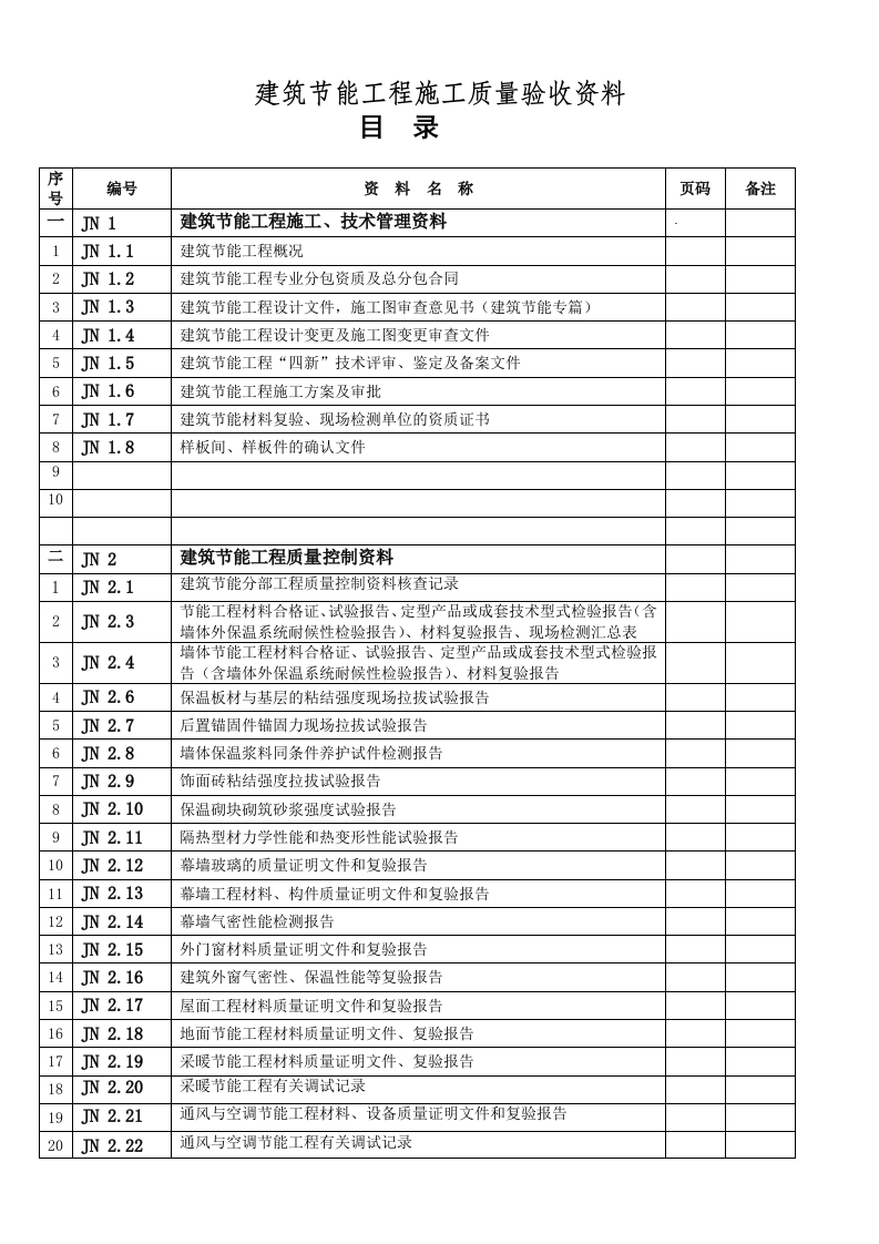 建筑节能工程施工质量验收资料目录序编号资料名称页码备注JN 1建筑节能工程施工、技术管理资料1JN1.1建筑节能工程概况2JN1.2建筑节能工程专业分包资质及总分包合同3N1.3建筑节能工程设计文件,施工图审查意见书(建筑节能专篇)4JN1.4建筑节能工程设计变更及施工图变更审查文件5JN1.5建筑节能工程“四新”技术评审、鉴定及备案文件6JN1.6建筑节能工程施工方案及审批7JN1.7建筑节能材料复验、现场检测单位的资质证书8JN1.8样板间、样板件的确认文件910二建筑节能工程质量控制资料1JN2.1建筑节能分部工程质量控制资料核查记录2JN2.3节能工程材料合格证、试验报告、定型产品或成套技术型式检验报告(含墙体外保温系统耐候性检验报告)、材料复验报告、现场检测汇总表3JN2.4墙体节能工程材料合格证、试验报告、定型产品或成套技术型式检验报告(含墙体外保温系统耐候性检验报告)、材料复验报告4JN2.6保温板材与基层的粘结强度现场拉拔试验报告5JN2.7后置锚固件锚固力现场拉拔试验报告6JN2.8墙体保温浆料同条件养护试件检测报告7JN2.9饰面砖粘结强度拉拔试验报告JN2.10保温砌块砌筑砂浆强度试验报告9N2.11隔热型材力学性能和热变形性能试验报告10JN2.12幕墙玻璃的质量证明文件和复验报告11JN2.13幕墙工程材料、构件质量证明文件和复验报告12JN2.14幕墙气密性能检测报告13JN2.15外门窗材料质量证明文件和复验报告14JN2.16建筑外窗气密性、保温性能等复验报告15JN2.17屋面工程材料质量证明文件和复验报告16JN2.18地面节能工程材料质量证明文件、复验报告17JN2.19采暖节能工程材料质量证明文件、复验报告18JN2.20采暖节能工程有关调试记录19JN2.21通风与空调节能工程材料、设备质量证明文件和复验报告20JN2.22通风与空调节能工程有关调试记录21JN2.23空调与采暖系统冷热源及管网节能工程材料、设备质量证明文件和复验报告22JN2.24空调与采暖系统冷热源及管网节能工程有关调试记录23JN2.25配电与照明节能工程材料、设备质量证明文件和复验报告24JN2.26监测与控制节能工程材料、设备质量证明文件和相关技术资料JN2.27建筑节能工程围护结构的传热系数检验报告(热工性能现场检测报告)26JN2.28外墙节能构造钻芯检验报告27JN2.29外窗气密性现场实体检测报告28JN2.30采暖、通风、空调、配电与照明系统性能检测报告29JN2.31风管及系统严密性检验记录30JN2.32现场组装的组合式空调机组的漏风量测试记录31JN2.33设备单机试运转及调试记录32JN2.34系统联合试运转及调试记录33JN2.35系统节能性能检测报告343536JN 3建筑节能分部工程质量验收资料1JN3.1建筑节能分部工程质量验收记录JN统表1墙体节能分项工程质量验收记录3JN统表2墙体节能分项工程隐蔽验收记录4JN3.2墙体节能检验批/分项工程质量验收5JN3.2.1聚苯板外保温系统墙体节能检验批/分项工程质量验收记录6JN3.2.2保温浆料保温系统墙体节能检验批/分项工程质量验收记录7JN3.2.3聚氨酯发泡外保温墙体节能检验批/分项工程质量验收记录8JN3.2.4保温装饰板外保温系统墙体节能检验批/分项工程质量验收记录9JN3.2.5墙体自保温墙体节能检验批/分项工程质量验收记录10JN统表1幕墙节能分项工程质量验收记录11JN统表2幕墙节能分项工程隐蔽验收记录12JN3.3幕墙节能检验批/分项工程质量验收记录13JN统表1门窗节能分项工程质量验收记录14N统表2门窗节能分项工程隐蔽验收记录15JN3.4门窗节能检验批/分项工程质量验收记录16JN统表1屋面节能分项工程质量验收记录17JN统表2屋面节能分项工程隐蔽验收记录18JN3.5屋面节能检验批/分项工程质量验收记录19JN统表1地面节能分项工程质量验收记录20JN统表2地面节能分项工程隐蔽验收记录21JN3.6地面节能检验批/分项工程质量验收记录22JN统表1采暖节能分项工程质量验收记录23JN统表2采暖节能分项工程隐蔽验收记录24JN3.7采暖节能检验批/分项工程质量验收记录25JN统表1通风与空调节能分项工程质量验收记录26JN统表2通风与空调节能分项工程隐蔽验收记录27JN3.8通风与空调节能检验批/分项工程质量验收记录28JN统表1空调与采暖系统冷热源及管网节能分项工程质量验收记录29JN统表2空调与采暖系统冷热源及管网节能分项工程隐蔽验收记录30JN3.9空调与采暖系统冷热源及管网节能检验批/分项工程质量验收记录31JN统表1配电与照明节能分项工程质量验收记录32JN统表2配电与照明节能分项工程隐蔽验收记录33JN3.10配电与照明节能检验批/分项工程质量验收记录34JN统表1监测与控制节能分项工程质量验收记录35JN统表2监测与控制节能分项工程隐蔽验收记录36JN3.11监测与控制节能检验批/分项工程质量验收记录四N4其它1
