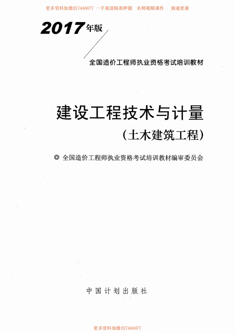 更多资料加微信7446077一手渠道精准押题名师视频课件极速更新2017年版全国造价工程师执业资格考试培训教材建设工程技术与计量(土木建筑工程)回全国造价工程师执业资格考试培训教材编审委员会中国计划出版社更多资料加微信7446077更多资料加微信7446077一手渠道精准押题名师视频课件极速更新图书在版编目(C1P)数据建设工程技术与计量.,土木建筑工程/全国造价工程师执业资格考试培训教材编审委员会编。一7版.一北京:中国计划出版社,2017.52017年版全国造价工程师执业资格考试培训教材ISBN978-7-5182-0607-0理一资格考试一自学参考资料V.①TU723.3中国版本图书馆CIP数据核字(2017)第065060号全国造价工程师执业资格考试培训教材(201?年版)建设工程技术与计量(土木建筑工程)全国造价工程师执业资格考试培训教材编审委员会中国计划出版社出版发行网址:www.jhpress,com地址:北京市西城区木郴地北里甲11号国宏大厦C座3层邮政编码:100038电话:(010)63906433(发行部)北京中科印刷有限公司印刷787mm×1092mm1/1627.5印张680千字2017年5月第7版2017年5月第1次印刷印数1一80000册ISBN978-7-5182-0607-0定价:80.00元版权所有侵权必究本书环衬使用中国计划出版社专用防伪纸,封面贴有中国计划出版社专用防伪标,否则为盗版书。请读者注意鉴别、监督!侵权举报电话:(010)63906404如有印装质量问题,请寄本社出版部调换更多资料加微信7446077更多资料加微信7446077一手渠道精准押题名师视频课件极速更新全国造价工程师执业资格考试培训教材编审委员会审定委员会顾问:陈重杨思忠张允宽组长:刘灿副组长:徐惠琴卫胡传海成·员:(以姓氏笔画为序)王美林李清立杨志生吴佐民张仕廉张有恒张丽萍陈建国陈光云周守渠赵毅明赵曙平施笠倪健陶学明黄如宝谢洪学谭华编写委员会组长:徐惠琴副组长:吴佐民成员:(以姓氏笔画为序)马楠王洪强王艳艳王雪青牛永宁竹隰生刘伊生刘维齐宝库安慧许远明孙凌志李志国·李成栋李丽红吴新华张成中陈志华陈起俊周述发周霞赵军赵志曼赵亮赵振宇郝治福荀志远柯·洪袁大祥贾宏俊栾高阳高显义郭婧娟郭琦黄如宝梁宝臣舒宇路君平解本政。潘爱先更多资料加微信7446077