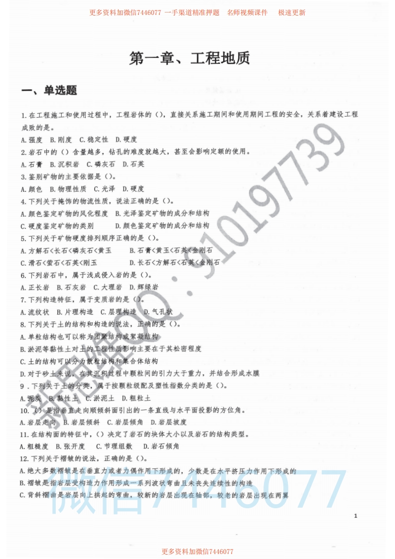 更多资料加微信7446077一手渠道精准押题名师视频课件极速更新第一章、工程地质一、单选题1.在工程施工和使用过程中,工程岩体的(),直接关系施工期问和使用期间工程的安全,关系着建设工程成败的是。A.强度B.刚度C.稳定性D.硬度2.岩石中的()含量越多,钻孔的难度就越大,甚至会影响定额的使用。A.石膏B.沉积岩C.磷灰石D.石英3.鉴别矿物的主要依据是()。A.颜色B.物理性质C.光泽D.硬度4.下列关于掩饰的物流性质,说法正确的是()。A.颜色鉴定矿物的风化程度B.光泽鉴定矿物的成分和结构C.硬度鉴定矿物的类别D.颜色鉴定矿物的成分和结构01977395.下列关于矿物硬度排列顺序正确的是()。A.方解石<长石<磷灰石<黄玉B.石膏<黄玉<石英<金刚C.滑石<萤石〈石英<刚玉D.长石<方解石<石英<金刚石6.下列岩石中,属于浅成侵入岩的是()。A.正长岩B.石灰岩C.大理岩D.辉绿岩7.下列构造特征,属于变质岩的是()。A流纹状B,片理构造C.层理构造D,气孔状8.下列关于土的结构和构造的说法,正确的是()。A.单粒结构也可以称为团聚结构或絮凝结构B.淤泥等黏性土对上的工程性质影响主要在于其松密程度C.土的结构可以分为散粒结构和集合体结构D.对于砂士来说,在其沉积过程中颗粒间的引力大于重力,并结合形成水膜9.下列关于土的分类,属于按颗粒级配及塑性指数分类的是()。10.)是指垂直走向顺倾斜面引出的一条直线与水平面投影的方位角。A岩层走向B.岩层倾斜C.岩层倾角D.岩层坡度11.在结构面的特征中,()决定了岩石的块体大小以及岩石的结构类型。A.粗糙度B.张开度C.节理组数D.岩石倾角12.下列关于褶皱的说法,正确的是()。A.绝大多数褶皱是在垂直力或者力偶作用下形成的,少数是在水平挤压力作用下形成的B.褶皱是指岩层受构造力作用形成一系列波状弯曲且未丧失连续性的构造C.背斜褶曲是岩层向上拱起的弯曲,较新的岩层出现在轴部,较老的岩层出现在两翼更多资料加微信7446077更多资料加微信7446077一手渠道精准押题名师视频课件极速更新D.背斜褶曲是岩层向下凹进的弯曲,较老的岩层出现在轴部,较新的岩层出现在两翼13.对于深路堑和高边坡来说,对路基稳定最不利的是()。A.岩层倾角小于坡面倾角的逆向坡B.岩层倾角大于坡面倾角的逆向坡C.岩层倾角小于坡面倾角的顺向坡D.岩层倾角大于坡面倾角的顺向坡14.某基岩被5组不规则的x形裂隙切割成小块状,间距0.20.35m,大部分为张开裂隙,部分由填充物,该裂隙按发育程度属于(),此基岩的裂隙对工程()。A.不发育,无影响B.较发育,影响不大C.发育,影响很大D.很发育,影响很严重15.张性裂缝主要发育在()。A.背斜的新岩层B.向斜的老岩层C.背斜的老岩层D.背斜和向斜的翼部16.对岩体具有普遍意义的非构造裂隙是()。A.张性裂隙B.风化裂隙C.卸荷裂隙D.扭性裂隙17.结构面结合力较差的工程地基岩体的工程特性是()。A.沿层面方向的抗剪强度高于垂直层面方向B.沿层面方向有错动比有软弱夹层工程地质性质差C.结构面倾向坡外比倾向坡里的工程地质性质好D.沿层面方向的抗剪强度低于垂直层面方向18.建筑物结构设计对岩石地基主要关心的是()。A.岩体的结构B.岩石的抗压强度C.岩体的变形模量或弹性模量D.掩饰的抗剪强度19.下列关于岩石的流变性能,说法正确的是()。A.蠕变是指变形保持一定时,应力随时间的增长而逐渐较小的现象B.蠕变是指在应力一定的条件下,变形随时间的持续而逐渐减小的现象C.松弛是指在应力一定的条件下,变形随时间的持续而逐渐增加的现象D.松弛是指变形保持一定时,应力随时间的增长而逐渐较小的现象20.下列关于岩体的强度性质,说法正确的是()。A.当岩体中结构面不发育时,呈完整结构式,岩体的结构完全受结构面控制。B.当岩体沿某一结构面产生整体滑动时,岩石强度可视为岩体强度。C.当岩体中结构面不发有时,岩石强度可视为岩体强度。D.岩体强度既可以等于岩块岩石强度,也可以等于结构面的强度。21,下列关于岩石的物理学性质,说法正确的是()A.组成岩石的矿物比重越大,或岩石的孔隙性越大,则岩石的重度越大。B.软化系数越大,表示岩石的强度和稳定性受水的作用影响越大。C.高寒地区,软化性是评价岩石工程性质的一个重要指标。D.吸水率越大,软化作用用越强,岩石的强度和稳定性受水的作用影响越大。22.下列关于岩石的力学性质的说法,正确的是()。A.弹性模量越小,岩石抵抗变形的能力越大。B.弹性模量和泊桑比,只是在一定条件下的最大值。C.抗压强度和抗剪强度是评价岩石稳定性的重要指标。D.抗剪强度一般为抗压强度的50%以上。23.土层中常有石芽、溶洞或土洞分该地区布其中,给地质勘测和设计带来困难,该地区的土质可能为()。更多资料加微信7446077更多资料加微信7446077一手渠道精准押题名师视频课件极速更新A.湿陷性黄土B.红黏土C.膨胀土D.软土24.不宜作为建筑物地基填土的是()。A.堆填5年的砂土B.经处理后的建筑垃圾C.经压实后的生活垃圾D.经处理后的一般工业废料25.下列结构面对工程岩体力学和岩体破坏方式具有意义的边界条件是()。A.I级和IⅡ级B.Ⅱ级和Ⅲ级C.级和V级D.IV级和V级26.下列关于软弱结构面的说法,错误的是()。A.与两盘相比具有高压缩和低强度等特征B.软弱结构面的黏性颗粒含量很高,含水量接近或超过塑限C.软弱结构层密度比原岩大,具有一定的胀缩性D.软弱结构层的力学性质