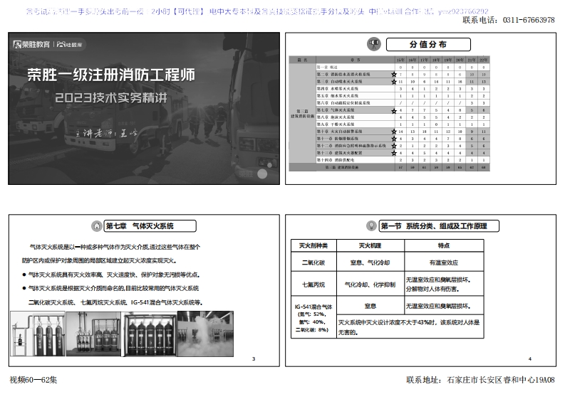 联系电话:0311-67663978分值分布0荣胜一级注册消防工程师☆42014口第七章气体灭火系统Q第一节系统分类、组成及工作原理气体灭火系统是以一种或多种气体作为灭火介质道过这些气体在整个灭火机理特点二氧化碳●气体灭火系统是根据灭火介无命名的目前比较常用的气体灭火系统气化冷却、化学抑制灭火系统种灭火设计浓度不大于43%时。该系统对人体是视频6062集联系地址:石家庄市长安区蓉和中心19AO8联系电话:0311-67663978第一节系统分类、组成及工作原理Q第一节系统分类、组成及工作原理医方式Q第一节系统分类、组成及工作原理Q第一节系统分类、组成及工作原理27视频6062集联系地址:石家庄市长安区容和中心19AO8联系电话:0311-67663978第一节系统分类、组成及工作原理练习题1柜式气体灰火装置B管阿灭火系统预制灭火系统C全淹设灭火系统和号部应用灭火系统D.自压式气体灭火统、内储压式气体灭火系密和外储压式气体灭火系统Q第一节系统分类、组成及工作原理第一节系统分类、组成及工作原理12视频6062集联系地址:石家庄市长安区蓉和中心19A08