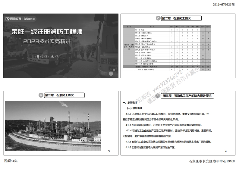0311-67663978荣胜一级注册消防工程师067wz923新更合第二章石油化工防火第三节油化工生产的防火设计要求412石油化工企业应远离人口密集区.饮用水地、重要交道枢妞等区域。并宜位于邻近城镇成居民区全年最小频率风向的上风侧,4视颊84集石家庄市长安区容和中心19AO80311-67663978第三节石油化工生产的防火设计要求石油化工风向归钠施宜布置在人员集中场所及明火成散发火花地点的全年最小频率风向的上风侧,5wz92352926新更合石油化工风向归钠微信第三节油化工生产的防火设计要求粉尘等场所的全年最小顿率风向的下风侧,视颊84集石家庄市长安区睿和中心19A080311-67663978Q[第三节石油化工生产的防火设计要求第三节油化工生产的防火设计要球二、生产区的防火设计小于05m,设备全年最小频率风向的下风侧,其平直布置设计应符合以下规定9529210wz923第三节石油化工生产的防火设计要求加微信第三节油化工生产的防火设计要求5211在甲、乙类若置内部的设备、建筑物区的设置应符合下列规定:宽度不应小于7m,1112视颊84集