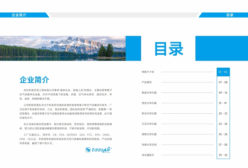 企业简介目录目录等离子介绍企业简介产品推荐07-08深圳利登环保工程有限公司秉承“服务社会、造福人民"的理念,主要经营等陶子空气消毒净化设备。针对不同场景下的消毒,杀茵、空气净化需求,提供经济、环09-14保,高效,快捷的解决方案。公司的研发团队专注于研发符合国际标准的高埃等离子体空气清毒净化技术。广20-22内领先水平。天花式净化器23-2425-26电离水的应用27-28净化器配件29-32等离子消毒等离子消毒空气中的等离子空气中的等离子子数离子是分子或原子包含的电荷,这些离子存在于大自然之中。简单来说离子有30-300秒之同的空气净化本身存在于自然界,大自然净化过程的完善性和无限创造力。确立了任何事物的运行尺存活时间。但它们是非常活跃的,大自然中离子密度范围:每立方厘米900-1100个负离子和每立方厘米1000-1200个正离子,因此在新鲜空气的环境中所含离子数,远超室内离子数量。在海平西我利用电离枝术,可以人为实现白然空气白净的高效无害电离过程,保持离子活性在25小时左右,门能体验到500个负离子和600个正离子每立方厘米,而在效市的建筑物内离子水平就下降了80%至并按要求控制离子浓度。从而产生类似白然界的正负离子,达到净化室内污染空气的日的。使室内95%,办公室内几乎测量不到离子,当离子减少,故而细菌溢生。在各种室内环境的空气中增加等空气达到城市公园空气质量水平。离子的数量,氧分子再一次变活跃,空气质量提高到新鲜空气的水平。筒而言之。等离子被释放到空气中后,在相互碰撞井攻击细菌和病毒的同时抑制及分解空气中污染物,从而令您随时置身于无生大量的正负离子井控制其数量。负离子含有一个镇外的电子,而正离子缺少一个电子,这种不隐污染的原生态环境中,呀吸到与大自然相近的清新洁净的空气令人倍感舒适,这是等离子空气电离定的电子保证了离子的话性,从而保证了正负离子的最佳消毒和空气净化效果。技术的优点。0102等离子消毒等离子消毒这些不稳定离子的好处等离子空气消毒净化技术的起源工作原理和过程PLASMA等离子空气与传统净化器的对比无产生大量的正负离子0304