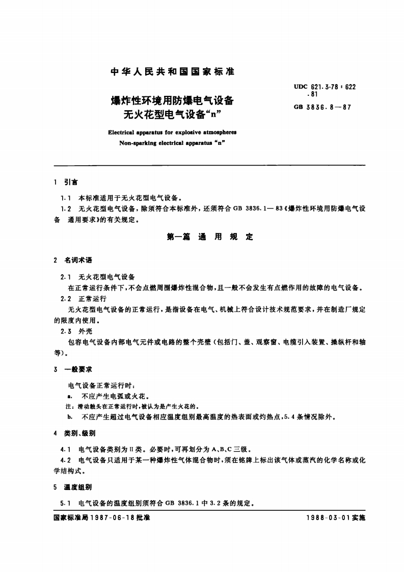 中华人民共和国国家标准UDC621.3-78622.81爆炸性环境用防爆电气设备GB3836.8一87无火花型电气设备“n”Electrical apparatus for explosive atmospheres1引言1.1本标准适用于无火花型电气设备。1.2无火花型电气设备,除须符合本标准外,还须符合GB3836.1一83《操炸性环境用防操电气设备通用要求》的有关规定。第一篇通用规定2名词术语2.1无火花型电气设备在正常运行条件下,不会点燃周围爆炸性混合物,且一般不会发生有点燃作用的故障的电气设备。2.2正常运行无火花型电气设备的正常运行,是指设备在电气、机械上符合设计技术规范要求,并在制造厂规定的限度内使用。包容电气设备内部电气元件或电路的整个壳壁(包括门、盖、观察窗、电缆引入装置、操纵杆和轴等)电气设备正常运行时:注:滑动触头在正常运行时,被认为是产生火花的,b.不应产生超过电气设备相应温度组别最高温度的热表面或灼热点,5.4条情况除外。4类别、级别4.1电气设备类别为Ⅱ类。必要时,可再划分为A、B、C三级,4.2电气设备只适用于某一种爆炸性气体混合物时,须在铭牌上标出该气体或蒸汽的化学名称或化学结构式。5温度组别5.1电气设备的温度组别须符合GB3836.1中3.2条的规定。国家标准局1987-06-18批准1988-03-01实施GB3836.8-87注:对于电动机,除非订货时另有要求,一般可按T3组设计制造,5.2电气设备正常运行时的允许最高表面温度须符合GB3836.1中4.1条表1的规定。注:非周期性工作制或非频紫起动的电动机,起动时的最高表面温度,可不受本条规定的限制。5.3电气设备的运行环境温度,须符合GB3836.1中4.2条的规定。5.4电气设备的允许最高表面温度须低于电气设备上标志的组别温度。下列情况之一者除外:■.对于总表面积不大于10cm的元件(例如:晶体管或限制小功率电路能量的电阻器),其最高表面温度相对于实测引燃温度至少具有下列安全裕度时,该元件的最高表面温度允许超过电气设备上标志的组别温度:对于T1,T2、T3组设备为+50℃:对于T4、T5、T6组设备为+25℃。b.对于只适用于某一种燥炸性气体混合物的电气设备,如经试验证明,其最高表面温度比燥炸性气体混合物的最低引燃温度至少低50℃时,设备的最高表面温度允许超过标志的组别温度,且须在铭牌上标明限制使用的条件和最高表面温度。6.1外壳的防护等级须不低于下列要求:b.棵露带电部件的外壳:P54,c.安装在清洁室内并有专人经常维护管理的电气设备外壳(接线盒和裸露带电部件除外):P20。注,电气设备铭牌上须注明受到限制的使用范围。6.2外壳的机械强度须符合GB3836.1第21章的有关规定。7接线装置7.1接线盒接线盒结构尺寸的设计,须便于接线,并留有适合于导线弯曲半径的空间,还应保证正确连接电缆后,其电气间隙、爬电距离须符合第10章和第11章的规定。接线盒内壁须均匀地涂耐孤漆。7.2连接件引入电缆或导线的连接件,应保证与电缆或导线连接牢固、接线方便,同时还须防止电缆或导线松动、自行脱落、拧转,并能保持良好的接触压力。连接件不允许在正常工作条件下,因温度升高而引起接触压力降低。连接件不允许带有可能损伤电缆或导线的棱角。不允许在正常紧固时产生水久变形和自行转动。不允许用绝缘材料部件传递接点压力。用于连接多股线的连接件,须采取措施防止导线分股。连接截面积在4m'及以下的电缆或导线的连接件,须设计成能与截面积更小的电缆或导线可靠连接。注:①必要时,应采取特殊措施,以防止振动或碰撞,②使用铝导线时,应果用铜铝过凌接头,以防止接触处电解腐蚀。7.3内部导线连接7.3.1电气设备内部导线连接不允许承受不适当的机城应力。可采用下述任一方法连接:8.能防止松动的螺栓或螺钉连接:b.导线先用机械方法连接后再用锡焊连接:e.熔焊连接。注:使用铝导线时,须采用铜铝过被接头,以防止电解腐蚀,GB3836,8-877.3.2可能与尖锐金属件接触的内部导线,应有机械保护或适当固定,以防损坏。8引人装量引入装置须符合GB3836.1第14章的规定。9绝缘介电强度电气设备的绝缘介电强度须符合有关标准的规定。10电气间隙10.1带电零件之间、带电零件与接地零件之间的电气间隙须符合表1的规定。10.2带电零件与接地零件之间的电气间隙,按线电压进行计算,这也适用于电网中性点直接接地系统。如果额定电压为10kV或更高的电气设备,仅用在中性点直接接地的电网中,则带电零件与接地零件之间的电气间隙可按电气设备的相电压计算。在这种情况下,电气设备铭牌上应标明只适用于这种用途的标志(见GB3836.1第30章)。额定电压,V36412722063808660101140183000366000601000010011爬电距离11,1爬电距离的长度根据额定电压、绝缘材料的耐泄痕性和绝缘件的表面形状确定。绝缘材料按相对泄痕指数分级见表2。表2绝缘材料按相对泄痕指数的分级试验电压,V滴数600>100b500500>50380380>50d175175>50注:陶瓷材料不须经过上述试验,按照惯例可列入缀,常用绝缘材料耐泄痕性分级示例见GB3836,3《爆炸性环境用防操电气设备增安型电气设备“e”》附录D。11.2带电零件之间的爬电距离须符合表3的规定。11.310.2条关于电压的规定也适用于确定爬电距离。11,4对表面有凸筋或凹槽的接线板,爬电距离应按GB3836.3中6.3条和6.4条的规定计算。