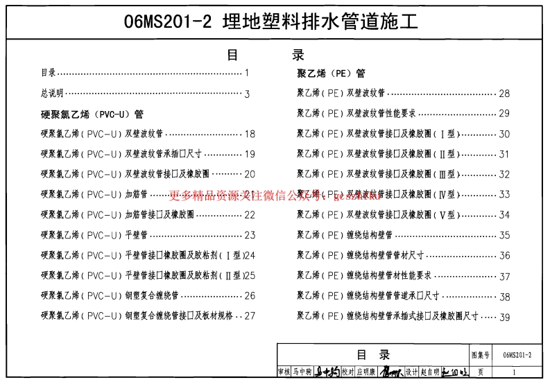 06MS201-2埋地塑料排水管道施工目录聚乙烯(PE)管总说明…了硬聚氯乙烯(PVC-U)管聚乙烯(PE)友壁波纹管性能要求…29硬聚氯乙烯(PVC-U)双雕波纹管承插口尺寸…19硬聚氯乙烯(PVC-U)双壁波纹管接口及橡胶圈…20聚乙烯(PE)双壁波纹管接口及橡胶圈(Ⅲ型)…32硬聚氯乙希(PVC-U)加筋管接口及橡胶圈…22聚乙烯(PE)双壁波纹管接口及橡胶圈(V型…34聚乙烯(PE)缠绕结构壁管…35硬聚氯乙希(PVC-U)平壁管接口橡胶圈及胶粘剂(I型)24聚乙烯(PE)缠绕结构壁管管材尺寸.…36硬聚氯乙烯(PVC-U)平壁管接口橡胶圈及胶粘剂(Ⅱ型25聚乙烯(PE)缠绕结构壁管材性能要求…37硬聚氯乙烯(PVC-U)钢塑复合缠绕管.…26聚乙烯(PE)缠绕结构壁管管道承口尺寸…38硬聚氯乙希(PVC-U)钢塑复合缠绕管接口及板材规格.·27聚乙烯(PE)缠绕结构壁管承插式接口及橡胶圈尺寸·39目录06WS201-2页1钢芳增强聚乙烯(PE)螺旋波纹管热收缩套接口…50聚乙烯(PE)缠绕结构壁管卡箍式弹性密封件接口…41钢带增强聚乙烯(PE)螺旋波纹管内衬板材焊接接口·51聚乙烯(PE)缠绕结构壁管电热熔带接口…42增强聚丙烯(FRPP)管聚乙烯(PE)缠绕结构壁管热收缩带接口…4了52聚乙烯(PE)纲塑复合缠绕偕…44增强聚丙烯(FRPP)模压管接口及橡胶图..53PVC-U铜塑复合缠绕管铜助材料力学特性…46埋地塑料排水管道基础及沟槽宽度…54PE钢带增强聚乙烯(PE)管埋地塑料排水管道土工布加固技术要求…55钢带增强聚乙烯(PE)螺旋波纹管…47埋地塑料排水管道与检查井的连接(I型)…56埋地塑料排水管道与检查井的连接(Ⅱ型)…57纲带增强聚乙烯(PE)螺旋波纹管焊接接口…49目录页总说明1.设计依据2.1适用于管径系列范围为150~1200mm的市政、住宅小区,《室外排水设计规范》GB50014-2006工业企业和民用建筑其管项最大覆土深度≤8.0m的埋地塑料排水营《给水排水工程管道结构设计规范》GB50332-2002《室外给水排水和燃气热力工程抗震设计规范》2.2适用于排入管道的水温不大于40℃,排入市政排水管道的水质GB50032-2003应符合现行行业标准《污水排入城市下水道的水质标准》CJ3082《给水#水管道工程施工及验收规范》GB50268-97的有关规定。《建筑地基基础设计规范》GB50007-2002《埋地排水用硬聚氯乙烯(PVC-U)双壁波纹管材》漱泥、淤泥质士、冲填士等软士地基时,应根据相关规范进行地基处《埋地排污、废水用硬聚氯乙烯(PVC-U)管材》膨胀土、多年冻土地区的理地塑料排水管道施工,应根据有关标准规GB/T10002.3-1996范和规程另做处理。《埋地用聚乙唏(PE)结构壁管道系统》2.4道用于抗震设防烈度为9度及以下的地区,第1部分:聚乙烯双壁被纹管材GB/T19472.1-20043.管材和接口的选用第2部分:聚乙烯缠绕结构壁管材GB/T19472.2-20043.1管材类型《埋地硬聚氯乙烯排水管道工程技术程》选入本图集的管材有硬聚氯乙烯(PVC-U)、聚乙烯(PE)和CECS122:2001增强聚丙烯(FRPP)等:根据管陵结构型式有平壁管、加筋管、双《埋地聚乙烯排水管管道工程技术规程》CECS164:2004壁波纹管、缠绕结构壁管及铜塑复合缠绕管等,如表1所示。2.适用范围总说明065201-2页3