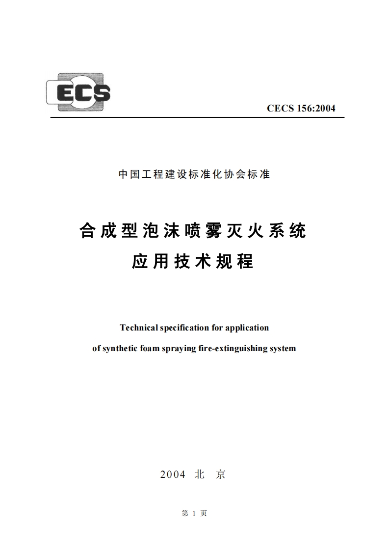 CECS156:2004中国工程建设标准化协会标准合成型泡沫喷雾灭火系统应用技术规程Technical specification for applicationof synthetic foam spraying fire-extinguishing system2004北京第1页中国工程建设标准化协会标准合成型泡沫喷雾灭火系统应用技术规程Technical specification for applicationof synthetic foam spraying fire-extinguishing systemCECS156:2004主编部门:浙江省消防协会设备专业委员会批准部门:中国工程建设标准化协会施行日期:2004年2月15日2004北京第2页前根据中国工程建设标准化协会(2003)建标协字第2?号文《关于印发中国工程建设标准化协会20心3年第一批标准制、锋订项目计划的通知》的要求,制订本规程。合成型泡沫喷雾灭火系统是采用合成泡沫灭火剂,通过气压式喷雾达到灭火的目的。该灭火系统由储液罐、合成泡沫灭火剂、氮气启动源、氮气动力源,电磁控制阀、水雾喷头、管网等组成。其特点是:灭火效率高,安全可靠;无水池、专用电源、泵组及排水设施:具有良好的绝缘性能,不污染环境:安装、操作、维护简单。现已广泛应用于油浸电力变压器、燃油锅炉房、撚油发电机房、小型石油库、小型汽车库等场所。本规程是在依据实验数据,参考国内外相关标准,总结国内工程实践经验,并广泛征求专家和使用单位意见的基础上编制而成的。根据国家计委计标[1986]1649号文《关于请中国工程建设标准化委员会负责组织推荐性工程建设标推试点工作的通知》,现批准协会标雅《合成型泡袜喷雾灭火系统应用技术规程》,编号为CECS156:2004,推荐给工程设计、施工、使用单位采用。本规程由中国工程建设标准化协会防火防爆专业委员会CECS/T℃玉4归口管理,由新江省消防协会设备专业委员会(杭州市文晖路319号,邮编:310014)负责解释。在使用中如发现糯要修改或补充之处,请将意见和资料径寄解释单位。主蜩单位:浙江省消防协会设备专业委员会参编单位:公安部四川消防研究所杭州安士城消防器材有限公司第3页