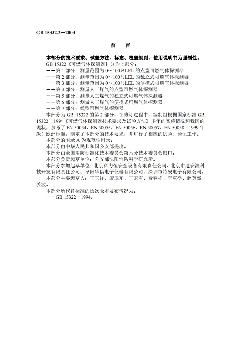 GB15332.2-2003前言本部分的技术要求、试验方法、标志、检验规则、使用说明书为强制性。GB15322《可燃气体探测器》分为七部分:一一第1部分:测量范围为0一100%LEL的点型可燃气体探测器一一第2部分:测量范围为0~100%LEL的独立式可燃气体探测器一一第3部分:测量范围为0~100%LEL的便携式可燃气体探测器一一第4部分:测量人工煤气的点型可燃气体探测器一一第5部分:测量人工煤气的独立式可燃气体探测器一一第6部分:测量人工煤气的便携式可燃气体探测器一一第7部分:线型可燃气体探测器本部分为GB15322的第2部分,在修订过程中,编制组根据国家标准GB15322一1994《可燃气体探测器技术要求及试验方法》多年的实施情况和我国的现状,参考了EN50054、EN50055、EN50056、EN50057、EN50058(1999年版)欧洲标准,制定了本部分的技术要求,并进行了相应的试验、验证工作。本部分的附录A为规范性附录。本部分由中华人民共和国公安部提出。本部分由全国消防标准化技术委员会第六分技术委员会归口。本部分负责起草单位:公安部沈阳消防科学研究所。本部分参加起草单位:北京科力恒安全设备有限责任公司、北京市迪安波科技开发有限责任公司、阜阳华信电子仪器有限公司、深圳市特安电子有限公司。本部分主要起草人:王玉祥、康卫东、丁宏军、费春祥、李克亭、赵英然、姜波。本部分所代替标准的历次版本发布情况为:--GB15322-1994。中华人民共和国国家标准GB15332.2-2003部分代替GB15322-1994可燃气体探测器第2部分:测量范围为0~100%LEL的独立式可燃气体探测器Combustible gas detectors-Part 2:Self-contained detectors for 0~100%LEL combustible gas1范围GB15322的本部分规定了独立式可燃气体探测器的定义、分类、技术要求、试验方法、标志、检验规则和使用说明书。本部分适用于一般工业与民用建筑中安装使用的独立式可燃气体探测器(以下简称探测器),其他环境中安装的具有特殊性能的探测器,除特殊要求应由有关标准另行规定外,亦应执行本部分。2规范性引用文件下列文件中的条款通过GB15322的本部分的引用而成为本部分的条款。凡是注日期的引用文件,其随后所有的修改单(不包括勘误的内容)或修订版均不适用于本部分,然而,鼓励根据本部分达成协议的各方研究是否可使用这些文件的最新版本。凡是不注日期的引用文件,其最新版本适用于本部分。GB16838一1997消防电子产品环境试验方法及严酷等级。3定义本部分采用下列定义:3.1报警设定值alarm setting value预置的可燃气体报警浓度值。3.2报警动作值alarm value探测器报警时对应的最小可燃气体浓度值。3.3爆炸下限(LEL)low explosive limit可燃气体或蒸汽在空气中的最低爆炸浓度。4分类4.1按防爆要求分为:中华人民共和国国家质量监督检验检疫总局2003-02-21发布2003-12-01实施GB15332.2-2003a)防爆型:b)非防爆型。4.2按使用环境条件分为:a)室内使用型:b)室外使用型。5技术要求5.1性能5.1.1探测器在被监测区域内的可燃气体浓度达到报警设定值时,应能发出报警信号。5.1.2报警设定值探测器具有低限、高限两个报警设定值时,其低限报警设定值应在1%LEL~25%LEL范围,高限报警设定值应为50%LEL:仅有一个报警设定值的探测器,其报警设定值应在1%LEL~25%LEL范围。5.1.3报警动作值5.1.3.1在本部分规定的所有试验项目中,探测器的报警动作值不应低于1%LEL。5.1.3.2探测器的报警动作值与报警设定值之差不应超过±3%LEL。5.1.4全量程指示偏差具有可燃气体浓度显示功能的探测器,其显示值与真实值之差不应超过±5%LEL。5.1.5响应时间具有可燃气体浓度显示功能的探测器,显示值达到真实值的90%时的响应时间(t90)不应超过30s。不具有可燃气体浓度显示功能的探测器,其报警响应时间不应超过30s。5.1.6探测器应满足下述功能:5.1.6.1当被监测区域内的可燃气体浓度达到报警设定值时,探测器应能发出声、光报警信号,再将探测器置于洁净空气中,30s内应能自动(或手动)恢复到正常监视状态。5.1.6.2探测器在传感元件断路或短路时应发出与报警信号有明显区别的声、光故障信号。5.1.6.3探测器应对声、光警报装置设置手动自检功能。5.1.6.4对于有输出控制功能的探测器,当探测器发出报警信号时,应能启动输出控制功能。5.1.7使用电池供电的探测器,在电池电量低时,应能发出与报警信号有明显区别的声、光指示信号,其电池性能应符合下述要求:5.1.7.1探测器在指示电池电量低的情况下再工作24h后其报警动作值与报警设定值之差不应超过士5%LEL。5.1.7.2探测器的电池持续工作时间应不少于60d。5.1.8不通电贮存