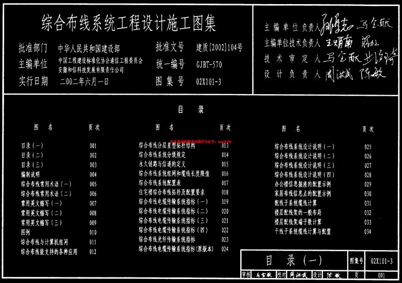 综合布线系统工程设计施工图集批准部门中华人民共和国建设部批准文号建质[2002]104号主编单位统一编号GJBT-570安徽和信科技发展有限责任公司实行日期图集号02X101-3录图名页次名3综合布线系统设计说明(一)025综合有线系筑分级规定026003永久链路与信道的定义综合布线系统设计说(三)027004016综合布线系统设计说明(四)028综合布线常用术语(一)005综合布线系统配置表017办公楼信息插座的配置示例029018家居布线信息点的配置示例030007配线子系统缆线计算031综合布线电缆传轴系统指标(二)020032021楼层配线来端子数计算033010022034综合布线与计算机组网023综合市线能支持的各希应用01202402X101-3001图名035087多个楼层交接间综合有线方案036主干电缆布线连接方式037053089高层单元式住宅楼综合布线方案038配线(水平)子系统综合有线法(二)0545指座、插头及连接方式090多层单元式住宅楼综合布线方案039055091040配线(水平)子系统缘合有线法(四)066室外光缆的结构(一)092高层住宅楼光纤到户有线方案093042068综合布线用光纤的性能要求094043配线(水平)子系统布线方法比较069光纤连接硬件的性能要求095070光纤连接硬件及光纤连接09645水平干线布线法071光缆的型号识别及相关参数097住宅园区网络配置方案举例(续)046建筑群子系统布线方法07219"标准配线架(柜)的基本尺寸098047设备间综合有线系统围实例(一)04807410配线架(俚线模块)100049设备间平面布置示例(二)075101大型建筑物楼层交接间的布局076102051077103052078104053楼层交接间平面寺置示例(三)079105住宅楼楼层交接间平面有置示侧080106配线空间设计参考数摆081107多层住宅楼单元布线实例082083建筑物内的各种市线路径0581000对称电缆的主要电气特性059目录(二)02X101-3060086002名图名页次页次1091321561101335e类电缆布线的增测参数与方法157配线管道与其他地下说施的间距134轻型金属线槽规骜型号表158暗管数设的技术要来112室内接地线与接地体的连接135159136160桥来安装与布线的技术要求137地板线槽规格型号表161综合有线系统电气防护参考数据138综合布线用金属导管指标(一)162116保安器及其安装139163117140164141165119管理标识符应用举例(二)142硬质PVC管技术性能指标166综合布线配线区的管理色标143120半硬VC管技术性能指标167121145陆火灌料技术指标及用法169122综合布线管理记录举例(二)146170123综合布线管理记录举例(三)147171124148172125综合布线工程验牧项目与内容(二)149常用计算单位及族算表173126150127综合布线的认证测试模型和利试程序151128通月仅表的测试原理与方法152129干线子系统的测试153110卯终端块在墙面上的安装位置130光纤衰减测试11图集号02X101-3003一、编制依据2.本图集对于综合布线系统的各项性能指标,引用了最新原发的D/T26.1-1.建设部建设[2001]6号文关于《二00一年国家建筑标准设计编制计划》926.3-2001标准,相对于1997年的版本,许多者际均作了较大修克,总体上说,提高了原来的观定标准,对于原辰本的指标规定伤列出以便比较(1)建筑与建筑群综合本线系统工程设计规范GB/T50311-2000(2)建筑与建筑群等合布线系统工程验收规范GB/T50312-2000(③)城市住宅建筑综合有线系统工程设计规范CECS119-2000的主要器材。为推进综合布线的计算机管理,围集还着重介绍了用于管理的标识将(大楼通信缘合布线系统第1部分:总规范YD/T926.1-2001和记录等方面的内容。(⑤)大楼通信综合布线系统第2部分:综合布线用电缆、光缆技术要求D/T926.2-20014图中所标注的尺寸除指明单位者外,均为m(6)大楼通信综合布线系统第3部分:综合布线用连接硬件技术要求Y物/T926.3-20015.由于计算机宽带网技术,智能化和信息化技术的发展非常迅速,与之密切相()综合布线系统电气特性通用测试方法YD/T1013-1999集中有不当和错误之处,数请指正,五、图集主要内容二、编制目的1,综合布线的拓朴结构和系统指标第11-24页本围集的编制目的主要是为了配合《建筑与建筑群综合有线系统工程设计规范》、《建筑第25-34页第35-57页4布线路径和布线方法第58-72页三、适用范围5.设备间与楼层交接问第73-81页第82-108页第109-130页四、编制说明第131-139页9.综合布线管理第140-147页10.综合布线系统的测武与验收第148-155页11.附录关技术指标及新增测试项目在附录中子以介细。对于其他非宽带应用,如楼字自动控制、安防第156-157页B,综合布线常用管线与配件的规格与指标第158-173页和《住宅智能化电气设计范工图集》(99601).编制说明02X101-3建筑和建筑群综合布线系统(generic ca的ling systen for building and由业务提供者提供接入网等设备的安装,包括桥接引入线和保安设答等。对于独立式或排列转接点(transition point)配线子系统(水平子系统)(horizontal subsystem)系统。干线子系统(垂直子系统)(6 ackbone subsystem)工作区(work area)式进行标积和记录,引入设备(entrance facility)建筑物配线莱(building distributor)安装通道楼层配线架(floor distributor)安装空间连楼水平电奠、水平光缆和其他布线子系统或设备的配线架分界点(Demarcation Point)综合布线常用术语(一)图集号02X101-3光纤配线架(optical fibres distribution frame)连接块、布线块(connecting block)一侧连接外线光览,另一侧连接光通信设备或者一侧为干线光乳,另一侧为配线光现的配线互连(interconnection)相连的一种连接方式光缆终端盒(fiber optic cable end case)布线走向、子系统和设备之何采用