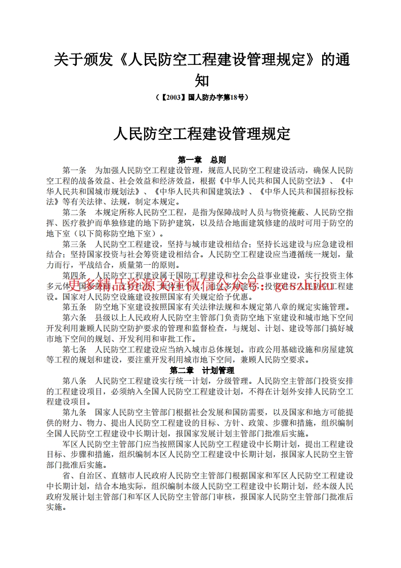 关于颁发《人民防空工程建设管理规定》的通知(【2003】国人防办字第18号)人民防空工程建设管理规定第一章总则第一条为加强人民防空工程建设管理,规范人民防空工程建设活动,确保人民防空工程的战备效益、社会效益和经济效益,根据《中华人民共和国人民防空法》、《中华人民共和国城市规划法》、《中华人民共和国建筑法》、《中华人民共和国招标投标法》等有关法律、法规,制定本规定。第二条本规定所称人民防空工程,是指为保障战时人员与物资掩蔽、人民防空指挥、医疗救护而单独修建的地下防护建筑,以及结合地面建筑修建的战时可用于防空的地下室(以下简称防空地下室)。第三条人民防空工程建设,坚持与城市建设相结合:坚持长远建设与应急建设相结合:坚持国家投资与社会筹资建设相结合。人民防空工程建设应当遵循统一规划,量力而行,平战结合,质量第一的原则。设。国家对人民防空设施建设按照国家有关规定给予优惠。第五条防空地下室建设按照国家有关法律法规和本规定第八章的规定实施管理。第六条县级以上人民政府人民防空主管部门负责防空地下室建设和城市地下空间开发利用兼顾人民防空防护要求的管理和监督检查,与规划、计划、建设等部门搞好城市地下空间的规划、开发利用和审批工作。第七条人民防空工程建设应当纳入城市总体规划。市政公用基础设施和房屋建筑等工程的规划和建设,要注重开发利用城市地下空间,兼顾人民防空要求。第二章计划管理第八条人民防空工程建设实行统一计划,分级管理。人民防空主管部门投资安排的工程建设项目,必须纳入全国人民防空工程建设计划,不得在计划外安排人民防空工程建设项目。第九条国家人民防空主管部门根据社会发展和国防需要,以及国家和地方可能提供的财力、物力、提出人民防空工程建设的目标、方针、政策、步骤和措施,组织编制全国人民防空工程建设中长期计划,报国家发展计划主管部门批准后实施。军区人民防空主管部门应当按照国家人民防空工程建设中长期计划,提出工程建设目标、步骤和措施,组织编制本区人民防空工程建设中长期计划,报国家人民防空主管部门批准后实施。省、自治区、直辖市人民政府人民防空主管部门根据国家和军区人民防空工程建设中长期计划,结合本地实际,组织编制本级人民防空工程建设中长期计划,经本级人民政府发展计划主管部门和军区人民防空主管部门审核,报国家人民防空主管部门批准后实施。人民防空重点城市以下地方各级人民政府人民防空主管部门组织编制本级人民防空工程建设中长期计划,经本级人民政府发展计划主管部门审核,报上一级人民防空主管部门批准后实施。县级以上人民政府人民防空主管部门编制的人民防空工程建设中长期计划应当明确项目,为年度计划作好项目储备。第十条国家人民防空主管部门根据中期计划的要求,于每年五月下达翌年年度计划安排原则。省、自治区、直辖市人民政府人民防空主管部门根据原则要求和储备项目,编制本级年度计划草案,安排一年内的建设任务和具体项目,经军区人民防空主管部门审核汇总,于八月中旬报国家人民防空主管部门。国家人民防空主管部门综合编制全国人民防空工程建设年度计划草案,报国家发展计划主管部门审批。自筹资金安排的人民防空工程建设项目,应当附有上一级人民防空财务部门出具的验资证明。年度计划草案的编制应与年度预算的编制相一致。年度预算的执行应当按照批准的预算进行第十一条全国人民防空工程建设年度计划,由国家发展计划主管部门统一下达。省、自治区、直辖市人民政府人民防空主管部门必须根据国家下达的人民防空工程建设年度计划,编制年度实施计划,会同本级发展计划主管部门下达各人民防空重点城市执行,并由人民防空主管部门于当年三月底前报国家和军区人民防空主管部门备案。第十二条人民防空工程建设年度计划一经批准下达,任何单位或者个人不得擅自调整或者改变。严禁擅自变更建设项目或者无故不完成国家计划。第十三条人民防空工程建设年度计划确需调整的,省、自治区、直辖市人民政府人民防空主管部门应当于当年八月底前报国家人民防空主管部门,经批准后下达实施。第十四条各级人民防空工程建设管理部门应当严格按照国家制定的人民防空工程第三章建设责任、程序与项目划分第十五条人民防空工程建设责任划分:(一)人民政府人民防空指挥工程、公用的人员掩蔽工程和疏散干道工程,由人民防空主管部门负责组织建设。人民政府人民防空指挥工程建设经费由本级政府财政预算安排:公用的人员掩蔽工程和疏散干道工程的建设经费,主要由地方各级政府财政预算安排、中央财政预算安排和人民防空主管部门依法筹措的经费解决。(二)防空专业队、医疗救护、物资储备等专用工程,由群众防空组织组建部门和战时医疗救护、物资储备等部门分别负责组织建设。有关单位负责修建本单位的人员与物资掩蔽工程。其建设经费由各有关部门和单位解决。(三)防空地下室工程,由有关单位或者个人负责组织建设。其建设经费由建设单位或者个人筹措,列入建设项目总投资。第十六条人民防空工程建设按照下列基本程序进行:(一)根据人民防空工程建设的中