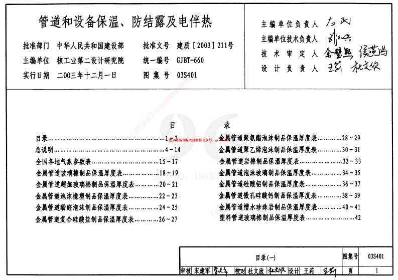 管道和设备保温、防结露及电伴热主编单位负责人广2主编单位技术负责人批准部门中华人民共和国建设部批准文号建质[2003]211号主编单位核工业第二设计研究院统一编号GJBT-660设计负责人实行日期二00三年十二月一日图集号03S401目录目录…金属管道聚乙烯泡沫制品保温厚度表………30-31金属管道岩棉制品保温厚度表…………………32-33金属管道玻璃棉制品保温厚度表…………18一191563金属管道泡沫玻璃制品保温厚度表…………34~35金属管道超细玻璃棉制品保温厚度表………20~21金属管道硅酸铝制品保温厚度表………………36~37金属管道泡沫橡塑制品保温厚度表……………22一23金属管道徽孔硅酸钙制品保温厚度表…………38~39金属管道酚醛泡沫制品保温厚度表……………24-25金属管道憎水珍珠岩制品保温厚度表…………40一41金属管道复合硅酸盐制品保温厚度表…………26一27塑料管道玻璃棉制品保温厚度表……………………2图集号03S401目录塑料管道超细玻璃棉制品保温厚度表………………43塑料管道泡沫橡塑制品保温厚度表…………………44塑料管道复合硅酸盐制品保温厚度表………………5管道玻璃棉、超细玻璃棉制品防结蓦厚度表………62塑料管道聚乙烯泡沫制品保温厚度表……………6管道泡沫橡塑、酚醛泡沫制品防结蓦厚度表………63管道复合硅酸盐、聚氨脂泡沫制品防结露厚度表…64管道聚苯乙烯泡沫、聚乙烯泡沫制品防结露厚度表65金属、玻璃朝薄板保护层管道保温结构图……50复合包扎涂抹保护层管道保温结构图……………51管道硅酸铝、徵孔硅酸钙制品防结露厚度表………67卧式筒体设备保温结构图………………55156303S4012目录电热带缠绕管道支架和吊架安装示意图……………114管道绝热材料工程量面积计算表…………………82管道绝热材料工程量体积计算表………………83圆形设备筒体部分绝热材料工程量计算……84~861563平壁设备电伴热安装图……………玻璃棉制品电伴热金属管道散热量(Q)表…107~108阀门类散热系数()表、电伴热金属设备散热量目录(白)03S4013总说明材按S5系列PP-R塑料管计算。室内冷水塑料管道啮结露,dn20~d血500,介质温度>5℃.本图集根据建设部建质[2002]156号文《关于印发《二00二年国家标准设计编制计射》的通知》,并在原87S159《管道和设备保温》3.4室内给水排水金属管造电伴热保温和防冻,DN15-DN500,介质的基础上修编完成。温度5℃-60℃.室内给水排水金属设备电伴热保温和防冻,介质温度5℃~60℃。2.设计做据2.1《工业设备及管道绝益工程设计规范》GB50264-974.绝热层材料2.2《工业设备及管道绝热工程施工及验收规花》GBJ126-894.1绝热层材料应选择能昊供允许使用温度、导热系数、容重、机2.3《工业设备及管道绝热工程质量检验评定标准》GB50185-93械强度和不燃性、难性、可燃性性能检测证明的产品;对防冻、防2.4《设备及管道保温设计导则》GB8157-872.5《设备及管道保冷技术通则》GB/T11790-19962.6《建筑给水排水设计规范》GB50015-20034.2用于与奥氏体不锈锅和铜管表面接触的绝热层材料应提供对上单00:1563述材料不会产生腐蚀作用的测试证明3.适用范围4.3绝热层材料的燃烧等级应符合下列要求:3.1本图集适用于一版工业及民用建筑室内(含地沟)给排水管道和4.3.1被绝热的设备与管道外表面温度>100°℃时,绝热层材料3.2室内给水排水金属管道保灌和防结露,DW15-DN500,介质温度5℃-150℃.图集号03S401审宋建军校对杜文欣王莉41×103-4×10(nsPa/g)】、防水性能和防性能,且其吸水率诛塑料类艷热层材料不得低于一殼可燃性2级材料的性能要求不大于1%的材料.4.4塑料管保温和防结露的绝热层不应采用硬质绝热材料,且塑料管直线管段固定支承的间距,不得大于给排水国家标准图《给水塑料5.1.3防糊层材料应选用化学性能稳定、无毒且耐腐蚀的材料.并不得对绝热层和保护层村料产生腐蚀或溶解作用,夏季不软化、不4.5金属管材和塑料管材在保温绝热工程中,绝热层的厚度相差较起泡和不流消;低温时不脆化、不开裂、不脱落的材料,大,在管径、环境温度和介质温度相同的条件下,金属管的绝热层厚度要比塑料管的绝热厚度大好多,特别是管径越大(塑料管壁规厚),不应小于0.15P;挥发物不得大于30%.其厚度相差更大,所以将金属管保温绝热层的厚度(本图集18~41页)5.2防湖层设置与塑料管保温绝热层的厚度(本图集42~47页)分别计算.设备与管道的防结露和电伴热防冻绝热层外表面;敷设在地沟内会属管材与塑料管材在防结霉绝热工程中绝热层的厚度,在设计防结幕绝热层厚度时,可以共用一个4值表(本图集62~68页)计算塑料管设计准数值,需要先计算塑料管表面遇度T!值,塑料管表面温度T值见本图集第61页,156305.3防潮层种类:4.6绝热材料性能表参见本图集第6页表一,常用防湖层的种类见第7页表二,6.保护层5.1防湖层材料性能要求6.1保护层材料性能要求5.1.1防潮层材料应选择具有抗蒸汽渗透性能【水蒸汽渗透阻《6.1.1保护层材料应选用强度高,在使用的环境温度下不得软化、总说明(二)图集号03S401审宋建军校州杜文文饭设计王莉5绝热材料性能表表一序号绝热材料名称适用条件145-90A入=0.031+0.00017tm金属管、塑料管260-80A1=0.025+0.00023tm金属管、塑料管3-40-105B1 B2入=0.038+0.00012tm金属管、塑料管40-70-180-150λ=0.0265+0.0000839ta5复合硅酸盐制品150-160-40-8