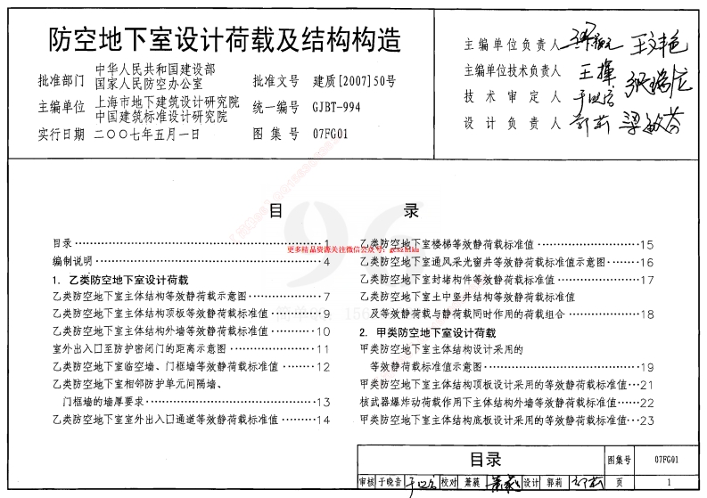 防空地下室设计荷载及结构构造中华人民共和国建设部批准部门国家人民防空办公室批准文号建质[2007]50号主编单位上海市地下建筑设计研究院统一编号GJBT-994技术审定人予以名中国建筑标准设计研究院实行日期二00七年五月一日图集号07FG01录编制说明…4乙类防空地下室通风采光窗井等效静荷载标准值示意图…161.乙类防空地下室设计荷载乙类防空地下室封堵构件等效静荷载标准值…17乙类防空地下室主体结构等效静荷载示意图乙类防空地下室土中竖井结构等效静荷载标准值乙类防空地下室主体结构顶板等效静荷载标准值…95及等效静荷载与静荷载同时作用的荷栽组合…18乙类防空地下室主体结构外墙等效静荷栽标准值…102.甲类防空地下室设计荷载室外出入口至防护密闭门的距离示意图…11甲类防空地下室主体结构设计采用的乙类防空地下室临空墙、门框培等效韓静荷载标准值…12等效静荷载标准值示意图………乙类防空地下室相邻防护单元问隔墙、甲类防空地下室主体结构顶板设计采用的等效静荷载标准值…21门框墙的墙厚要求…核武器爆炸动荷载作用下主体结构外墙等效静苻栽标准值…22乙类防空地下室室外出入口通道等效静荷我标准值…14甲类防空地下堂主体结构底板设计采用的等效静荷载标准值·23目录1甲类多层防空地下室主体结构设计采用的等效3.工程口部等效静荷载示例静荷载标准值示意图…24常6级乙类二等人员掩蔽所…40甲类防空地下室临空墙设计采用的等效静荷载标准值…26核5级常5级甲类防空专业队队员掩蔽部…43甲类防空地下室设计采用的直接作用在门框培上的核5级常5级甲类一等人员掩藏所…46等效静荷载标准值·……27核6级常6级甲类二等人员掩藏所·……49甲类防空地下室相邻防护单元间隔墙、门框培的4.材料及构造规定水平等效静荷载示意图…28甲类防空地下蜜相邻防护单元问隔墙、门框培的混凝土强度设计值……53水平等效静荷载标准值…30防空地下室结构材料最低强度等级及结构构件最小厚度…54甲类防空地下室堂外出入口通道等效静荷载标准值3受力铜筋最小保护层厘度及防水混凝土的设计抗渗等级…55铜篇混粱士结构构件纵向受力铜筋的最小配筋率和甲类防空地下室开激式防倒塌棚架等效静荷载标准值34受拉钢筋的最大配筋率…56甲类防空地下室防倒塌挑檐及土中竖井结构等效防空地下室纵向受拉铜筋最小锚固及搭接长度…57静荷我标准值……35内、外墙与顶板、底板、楼板的连接构造…58甲类防空地下室通凤采光窗井等效静荷栽标准值示意图36饲筋混凝土培体连接构造及板中拉结筋布置…59甲类防空地下室封堵构件等效静荷栽标准值示意图37防空地下室内墙留孔构造…60甲类防空地下室出入口通道内封堵构件设计采用的等效静荷我标准值…38相邻防护单元间偶墙配筋构造……62甲类防空地下室等效静荷载与静荷载同时作用的荷载组合…39目录07FG01页2自行车坡道出入口配筋图…75独立式竖井配筋图…76内附壁式竖井配筋图…77梁或柱支座两边变截面时纵向钢筋构造·…66外附壁式竖井配筋图…78柱中纵向受力铜筋及箍筋构造…67垂直运输口配筋图…79非承重墙连接构造……71外附壁式电缆井配筋图…815.部分构件配筋选用内附壁式电缆井配筋图…洗消污水集水坑配筋图…72项部式电缆井配筋图……84奇单00:1563033835目录页3编制说明1.编制依据4.战时荷载的作用建设部建质函[2006]71号《2006年国家建筑标准4.1甲类防空地下室结构应能承受常规武器爆炸动荷载和核武器设计编制工作计划》爆炸动荷载的分别作用,乙类防空地下室结构应能承受常规武器《人民防空地下室设计规范》(GB50038-2005)爆炸动荷载的作用。对常规武器爆炸动荷载和核武器爆炸动荷载,《混凝土结构设计规范》(GB50010-2002)设计时均按一次作用,《钢结构设计规范》(GB50017-2003)4,2战时设计荷载有动荷载和静荷载两类,动荷栽是指核爆炸或《地下工程防水技术规范》(GB50108-2001)常规武器爆炸空气冲击波超压形成的荷载和土中压缩波形成的荷2.适用范围载;静荷载是指士压力、水压力、结构自重及上部建筑传来的荷类防空地下室及常5级、常6级乙类防空地下室,且战时功能为4.了本图集提供的荷载是甲类防空地下室及乙类防空地下室设计防空专业队队员掩蔽部、一等及二等人员掩蔽所、人防汽车库、采用的等效静荷载标准值.。对于甲类工程,为核武器爆炸动荷载人防物资库。作用下的等效静荷栽标准值与常规武器爆炸动荷载作用下的等效3.图集内容静荷栽标准值两者中的较大值:对于乙类工程,为常规武器爆炸动3.1本图集用图示及表格的形式,表示了作用于甲类及乙类防荷载作用下的等效静荷莪标准值。应注意,设计采用的等效静荷空地下室不同部位设计采用的等效静荷栽标准值,载标准值仅供设计时采用,不是荷载的作用方式,3,2结合建筑图集的防空地下室示例,表达了防空地下室主体结构及口部的临空墙、门框墙战时等效静荷载的取值方法,33用图示及表格的形式表达了防空地下室结构的构造规定。编制说明页45.防空地下室的设计原则6.了在确定常规武器爆炸动荷栽作用下及核武器爆炸动荷载作用5,1防空地下室结构的设计使用年限为50年,当上部建筑结构的下结构外墙的等效静荷载标准值时,应按照工程所在地的土的类设计使用