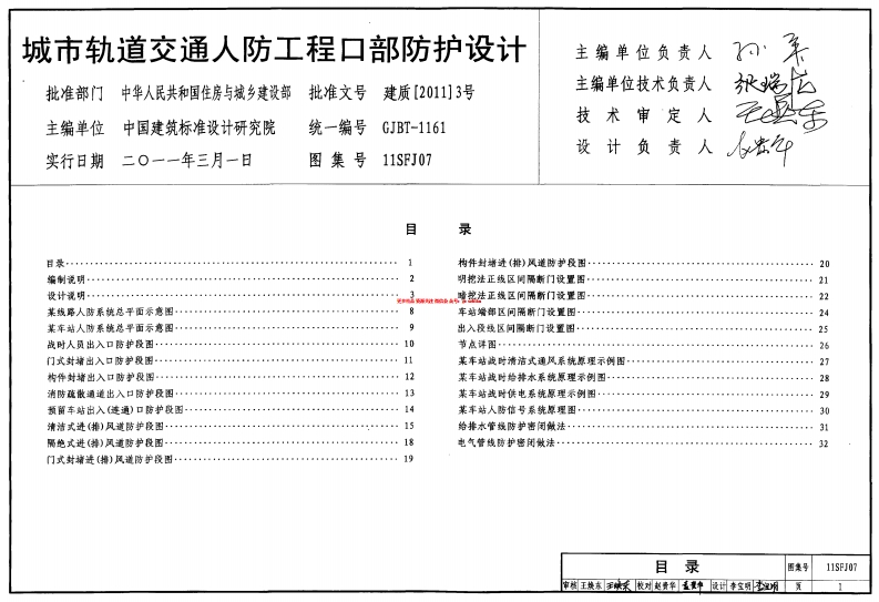 城市轨道交通人防工程口部防护设计主编单位负责人批准部门中华人民共和国住房与城乡建设部批准文号建质[2011]3号主编单位技术负责人技术审定人主编单位中国建筑标准设计研究院统一编号GJBT-1161实行日期二0一一年三月一日图集号11SJ07目录2228925战时人员出入口防护段图……1013293015隔绝式进()风道防护段图…18电气管线防护密闭法,目录11SFJ07编制说明1编制依据4编制内容2编制目的5注意事项5.4本图集中未注明的有关施工岁装质量等要求,均需轩合国家和人毖行业有关标增规有非常重要的意义,编制说明11SFJ07设计说明1设计依据《人民南空工程授计规范》G850225-2005《人民防空工程工及脸收观范》GB50134-20042设防原则1)每个防护单元战时人员出入口不应少于2个《不含适通口和垂直式出入日),其中少于1个直通地面的战时主要人员出入口,战时人员出入口宜结合平时出入口设置,各战3建筑设计32防护单元划分设计说明3.5.3装修次到位,战时能方便地启闭防护密闭门及整闭门,地面及项棚装修在满足防护瓷备平时启4结构设计5通风设计设计说明号7电气设计7.1电源7.1.2战时电源供电方式出室外,并结合平时环控排风系花的风管和风口进行种风,其风管内的侧阀启闭由环整自7.1,3战时应急电源6给排水设计8平战功能转换设计设计说明9其他设计说明11SFJ079.3图例0-159.4.5封墙板DB0000-15产品标识BGMH0000-159.4.7伪装门B2元0000-15设计说明④5站A河道中心线6站站车辆段某线路人防系统总平面示意图不设防的高架车站的某线路人防系统总平面示意图11SFJ071号风道1号出入口2号出入口2号风道数量ECF5040-155500X26001BGKFN4040-15400040C05500X28001550026001EFFM5040-15BWZN08302800K30002EFFM4040-15B504041号安全出口8站BHFN1220-151200X20001一站1号出入口2号出入口号安全出口4号出入口3号出入口BGFw5526-155500X26001550026001800K300024号出入口3号出入口说明:某车站人防系统总平面示意图115F0721-1剖面图/8B/4+50战时人员主要出入口防护段平面布置图战时人员出入口防护段防护设备参数选用表2-2剖面图(mm)(mm)140002600BGM4026BGM40262450026006GFM4526-15BGM45268GM4526500026009CM50269GM5026455002600BGFM5526-159GM5526BGFM5526-30BGM5526直小于800mm.560002600BGFM6026-15BGM6026BGM6026665002600BGM6526BGFM6526-30770002600BcFM7026-15BGFM7026-30战时人员出入口防护段图11SFJ0710