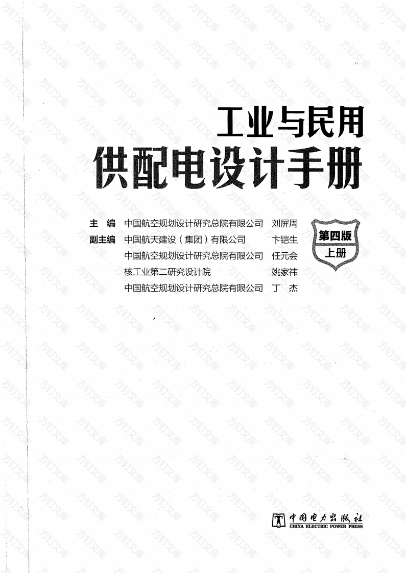 方方方文工业与民用供配电设计手册主编中国航空规划设计研究总院有限公司刘屏周副主编中国航天建设(集团)有限公司第四版中国航空规划设计研究总院有限公司任元会上册核工业第二研究设计院中国航空规划设计研究总院有限公司丁杰钉方方万方CHINA ELECTRIC POWER PRESS·内容提本书是在《工业与民用配电设计手册(第三版)》的基融上,依据国内外最新标准、规范,跟踪当前电气技术及电工产品的发展,总结多年的实用经验,进行大幅更新和扩充,涵盖1I0kV及以下供配电系统,并更名《工业与民用供配电设计手册(第四版)》。本书共分17章,分别为负荷计算及无功功率补偿,供配电系统,变(配)电站(附柴油发电机房),短路电流计算,高压电器及开关设备的选择,电能质量,继电保护和自动装置,变电站二次回路,导体选择,线路敷设,低压配电线路保护和低压电器选择,常用用电设备配电,交流电气装置过电压保护和建筑物防雷,接地,电气安全,节能和常用资料。本手册是工业与民用项目供配电设计的必备工具书,注册电气工程师(供配电)执业资格考试的指定参考书;电气施工安装和运行维护人员的常用资料,也可作为大专院校有关专业师生的参考书。图书在版编目(CP)数据工业与民用供配电设计手册:全2册/中国航空规划设计研究总院有限公司组编.一4版.一北京:中国电力出版社,2016.12(2017.3重印)ISBN978-7-5123-9995-2Ⅲ①工业用电-供电系统-系统设计-手册②工业用电-配电设计-手册③民用建筑-供电系统-系统设计-手册④民用建筑-配电设计-手册V.①TM72-62中国版本图书馆CIP数据核字(2016)第264959号中国电力出版社出版、发行(北京市东城区北京站西街19号100005http:/www.cepp.sgec.com.cn)北京盛通印刷股份有限公司印刷各地新华书店经售1983年11月第一版2016年12月第四版2017年3月北京第三十六次印刷787毫米×1092毫米16开本114.25印张2756千字印数267001-一275000册定价388.00元(上、下册)合订本敬告读者方本书封底贴有防伪标签,刮开涂层可查询真伪本书如有印装质量问题,我社发行部负责退换版权专有翻印必究文目录第四版前言第一版前言方方第二版前言第三版前言方上册1负荷计算及无功功率补偿1.1概述1.1.1基本概念1.1.2计算负荷的分类及其用途1.】.3负荷曲线和计算参数…1.1.4负荷计算法的选择……1.1.5本章适用范围和使用说明1.2设备功率的确定1.2.1单台用电设备的设备功率1.2.2多台用电设备的设备功率61.3单位指标法求计算负荷61.3.1负荷密度指标法61.3.2综合单位指标法1.3.3单位产品耗电量法…91.4需要系数法求计算负荷…101.5利用系数法求计算负荷…151.5.1利用系数法的计算步骤151.5.2用电设备有效台数的简化计算…181.5.35台及以下用电设备的计算负荷191.5.4利用系数法和需要系数法的关联191.6单相负荷计算…191.6,2单相负荷换算为等效三相负荷的简化法21.6.3单相负荷换算为等效三相负荷的精确法1.7电弧炉负荷计算…231.8尖峰电流计算…2411.9年电能消耗量计算241.10电网损耗计算1,10.1◇电网中的功率损耗…1.10.2电网中的电能损耗:…1.11无功功率补偿341.11.1无功功率补偿的意义和原则341.11.2提高系统的自然功率因数341.11.3并联电容补偿装置的基本要求和接线方式1.11.4并联电容补偿容量计算1.11.5电容器额定电压的选择和实际输出容量381,11.6电容器的设置方式、投切方式及调节方式1.12负荷计算示例…1.12.1利用系数法负荷计算示例1.12.2需要系数法负荷计算示例41参考文献2供配电系统432.1负荷分级及供电要求432.1.1负荷分级原则2.1.2负荷分级示例442.1.3各级负荷供电要求52.2电源和电压…2.2.1术语502.2.2电源选择…2.2.3电压选择…512.3◇高压供配电系统…2.3.1供配电系统设计要则2.3.2中性点接地方式类别532.3.3中性点接地方式的选择2.3.4配电方式…612.4变压器选择和变(配)电站主接线632.4.1变压器选型…2.4.2变(配)电站的电气主接线62.4.3变(配)电站站用电源2.5◇低压配电系统…2.5.1电压选择…82.5.2载流导体型式和接地型式…2.5.3低压电力配电系统82.5.4照明配电系统万2.6应急电源…912.6.1应急电源种类912.6.2应急电源系统912.6,3柴油发电机组912.6.4不间断电源设备(UPS)962.6.5逆变应急电源(EPS)103附录A供配电设计的原始资料106A.1需向供电部门提供的资料…106A.2需向供电部门索取的资料…106A.3需向建设单位了解的内容和索取的资料…1063变(配)电站(附柴油发电机房)1073.1变(配)电站站址和型式选择1073.1.1变(配)电站分类…1073.1.2变(配)电站站址选择1083.1.3变(配)电站型式选择1093.2变(配)电站的布置1093.2.1总体布置1091113.2.3高压配电室1143.2.4电容器室1213.2.5低压配电室12532.6变压器室…1283.2.7露天安装的变压器、预装箱式变(配)电站、地下变(配)电站、无人值班变(配)电站…1343.3柴油发电机房13533.1总体布置1353.3.2机房布置1363.3.3燃油和排烟1383.3.4·冷却和通风1423.3.5机房其他设施1451463.3.7柴油发电机组数据…1463.3.8机房布置示例1503.4变(配)电站对土建、采暖、通风、给排水的要求1513.5110、35kV变电站设计实例1674短路电流计算1764.1概述17634.1.1短路电流计算方法1764.1.2GB/T15544短路电流计算方法简介1764,1.3短路电流的基本概念4.1.4计算最大与最小短路电流的基本条件1794,1.5计算最大短路电流考虑的条件1794.1.6计算最小短路电流考虑的条件1804.1.7对称分量法的应用…1804.2电气设备的短路阻抗1814.2.1馈电网络阻抗1814.2.2变压器的阻抗1824.2