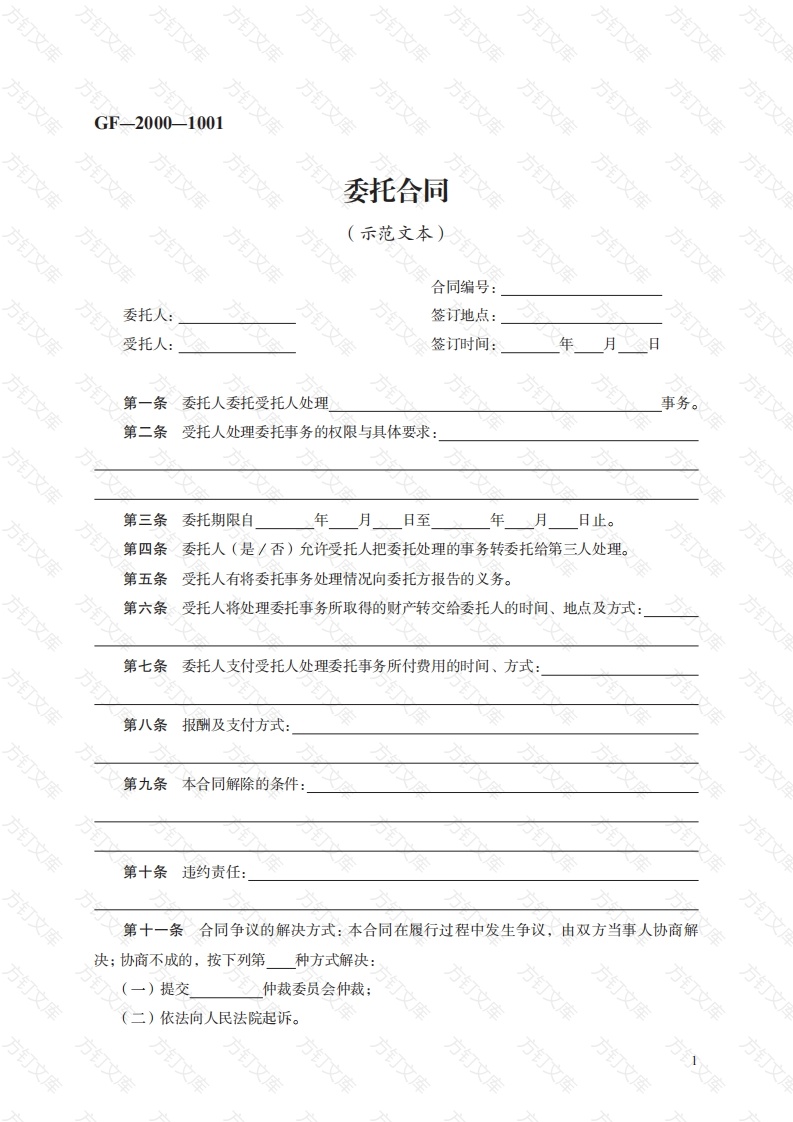 万GF-2000-1001委托合同方订方万(示范文本)合同编号:委托人:签订地点:受托人:签订时间:月第一条委托人委托受托人处理事务。第二条受托人处理委托事务的权限与具体要求:第三条委托期限自年月日至年日止。第四条委托人(是/否)允许受托人把委托处理的事务转委托给第三人处理。第五条受托人有将委托事务处理情况向委托方报告的义务。第六条受托人将处理委托事务所取得的财产转交给委托人的时间、地,点及方式:第七条委托人支付受托人处理委托事务所付费用的时间、方式:第八条报酬及支付方式:第九条本合同解除的条件:第十条违约责任:第十一条合同争议的解决方式:本合同在履行过程中发生争议,由双方当事人协商解决;协商不成的,按下列第种方式解决:(一)提交仲裁委员会仲裁:(二)依法向人民法院起诉。万万第十二条其他约定事项:第十三条本合同未作规定的,按《中华人民共和国合同法》的规定执行。委托人(章):受托人(章):住所:住所:法定代表人(签字):法定代表人(签字):电话:电话:开户银行:账号:方开户银行:账号:邮政编码:邮政编码:监制部门:印制单位:方方方2方订万万