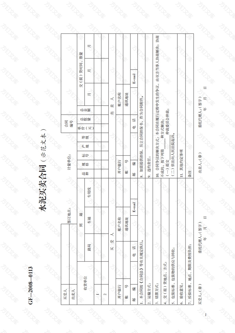 XGF-2008-0113水泥买卖合同(示范文本)买受人计量单位:合同签订地点:出卖人编号到站交(提)货时间、数量收货单位车站路局专用线单价(元总数量总金额月月月12买受人出卖人开户银行账户名称开户银行账户名称账号通讯地址通讯地址E-mailE-mail电话电话本合同按《合同法》等有关规定执行。8.如需提供担保,另立合同担保书,作为合同附件。2.运输方式:9.违约责任:3.结算方式:10.合同争议的解决方式:本合同在履行过程中发生的争议,由双方当事人协商解决;协商不成的,按下列第种方式解决:交(提)货地点、方式:5.包装标准、包装物的供应与回收:(二)依法向人民法院起诉。验收意见:其他约定事项检验标准、地点、期限及费用负担:备注买受人:(章)委托代理人:(签字)出卖人:(章)年月日「C委托代理人:(签字)年月日