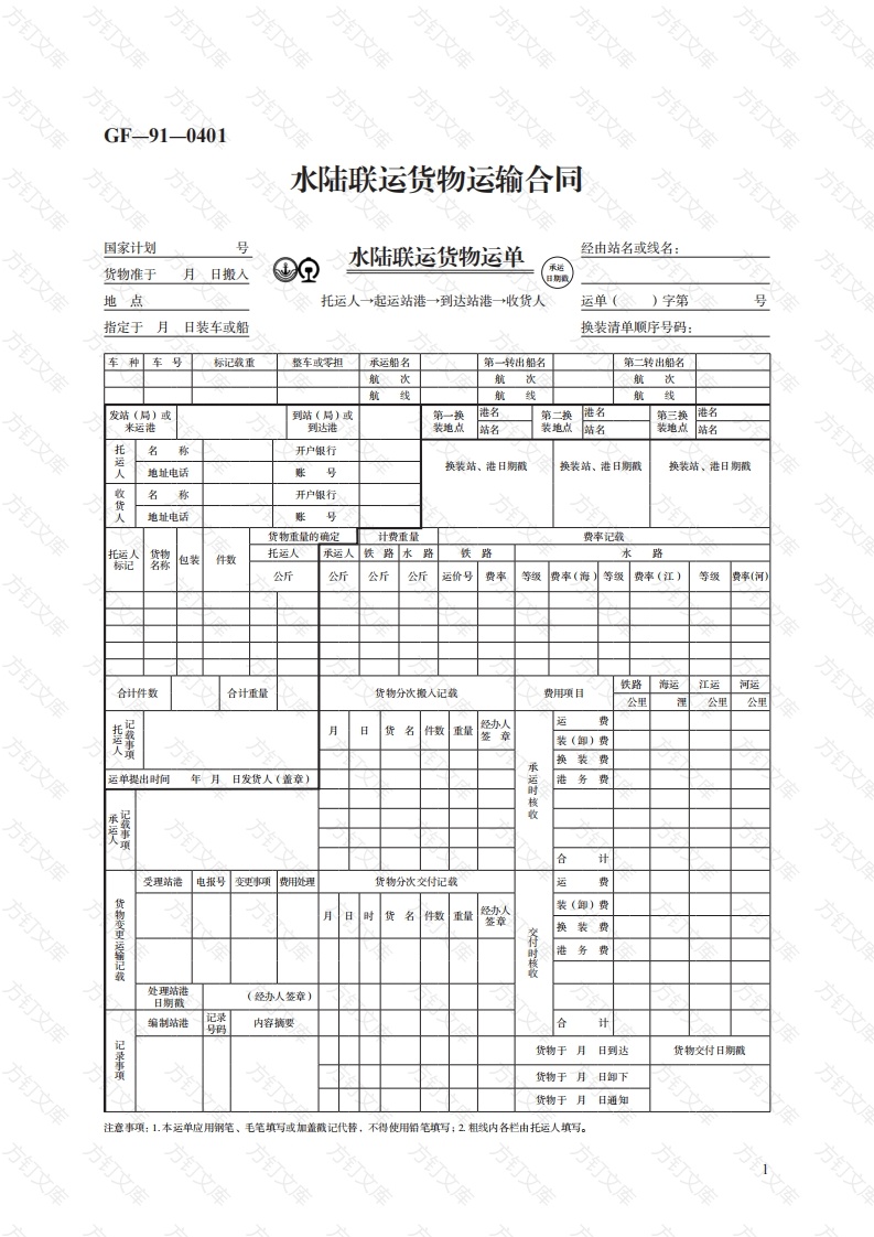 方方水陆联运货物运输合同国家计划号水陆联运货物运单经由站名或线名:货物准于月日搬人地点托运人一→起运站港→到达站港→收货人运单()字第指定于月日装车或船换装清单顺序号码:车种车号标记载重整车或零担第一转出船名第二转出船名方文航次航次航次航线航线航线发站(局)或到站(局)或港名第二换港名港名米运港到达港装地点站名装地点站名装地点站名名称开户银行地址电话账号换装站、港日期藏收货名开户银行人地址电话账货物重量的确定计费重量费率记载包装件数托运人承运人铁路水路铁路路公斤公斤公斤公斤运价号等级等级费率(江)等级贵率(河铁路海运江运河运合计件数合计重量费用项目公里公里公里运月日货名件数重量装(卸)费承换装费运单提出时间年月日发货人(盖章)港务费合计电报号费用处理货物分次交付记载月时货名件数重量经办人装(卸)费货物变更运输记载换装费付时核收港务费处理站港日期(经办人签章)记录万编制站港号码内容摘要合计记录事項货物于月日到达货物交付日期微货物于月日卸下货物于月日通知注意事项:1.本运单应用钢笔、毛笔填写或加盖戳记代,不得使用铅笔填写:2相线内各栏由托运人填写。方GF-91-0401方方万水陆联运货物运输合同方(示范文本)方水陆联运货物承运收据局起运港站一→托运人运单()字第方发站或起运港托运人名称到站或到达港收货人名称重量铁路海运江运河运货物名称种类件数费用项目实际重量计费重量公里公里公里公里运费装(卸)费换装费港务费合计承运时核收支票号收款人(盖章)合计方
