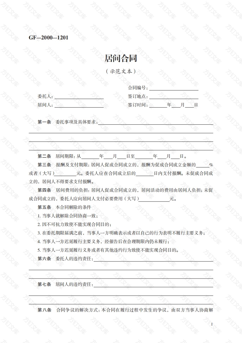 方GF-2000-1201居间合同方订方万示范文本)合同编号:委托人:签订地点:居间人:签订时间:年月日第一条委托事项及具体要求:第二条居间期限:从年月日至年月日。第三条报酬及支付期限:居间人促成合同成立的,报酬为促成合同成立金额的%或者(大写元。委托人应在合同成立后的日内支付报酬。未促成合同成立的,居间人不得要求支付报酬。第四条居间费用的负担:居间人促成合同成立的,居间活动的费用由居间人负担:未促成合同成立的,委托人应向居间人支付必要费用(大写第五条本合同解除的条件1.当事人就解除合同协商一致;文2.因不可抗力致使不能实现合同目的;3.在委托期限届满之前,当事人一方明确表示或者以自己的行为表明不履行主要义务:4.当事人一方迟延履行主要义务,经催告后在合理期限内仍未履行:5.当事人一方迟延履行义务或者有其他违约行为致使不能实现合同目的。第六条委托人的违约责任:第七条居间人的违约责任:第八条合同争议的解决方式:本合同在履行过程中发生的争议,由双方当事人协商解决;也可由当地工商行政管理部门调解;协商或调解不成的,按下列第种方式解决:(一)提交仲裁委员会仲裁:(二)依法向人民法院起诉。文第九条其他约定事项:第十条本合同未作规定的,按《中华人民共和国合同法》的规定执行。委托人(章):居间人(章)鉴(公)证意见:住所:住所:法定代表人:法定代表人:居民身份证号码:万居民身份证号码:委托代理人:委托代理人:电话:电话:鉴(公)证机关(章)开户银行:万开户银行:经办人:账号:邮政编码:邮政编码:年月监制部门:印制单位:方方方订方方订万万