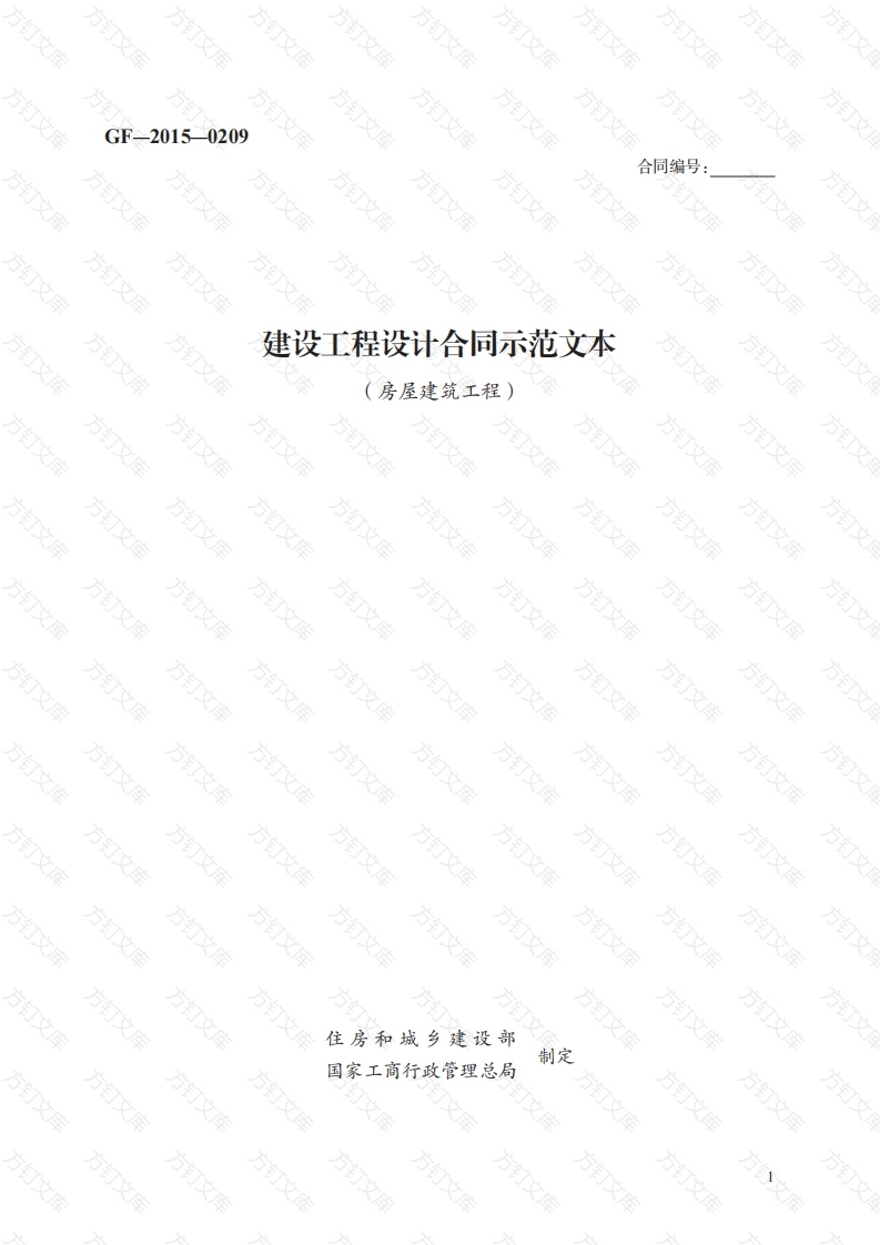 文文20150209方合同编号:方丁建设工程设计合同示范文本钉房屋建筑工程方方订方方方方住房和城乡建设部制定国家工商行政管理总局万万说明为了指导建设工程设计合同当事人的签约行为,维护合同当事人的合法权益,依据《中华人民共和国合同法》、《中华人民共和国建筑法》、《中华人民共和国招标投标法》以及相关法律法规,住房城乡建设部、工商总局对《建设工程设计合同(一)(民用建设工程设计合同)》(GF-2000-0209)进行了修订,制定了《建设工程设计合同示范文本(房屋建筑工程)》(GF-2015-0209)(以下简称《示范文本》)。为了便于合同当事人使用《示范文本》,现就有关问题说明如下:一、《示范文本》的组成《示范文本》由合同协议书、通用合同条款和专用合同条款三部分组成。(一)合同协议书《示范文本》合同协议书集中约定了合同当事人基本的合同权利义务。(二)通用合同条款通用合同条款是合同当事人根据《中华人民共和国建筑法》、《中华人民共和国合同法》等法律法规的规定,就工程设计的实施及相关事项,对合同当事人的权利义务作出的原则性约定。通用合同条款既考虑了现行法律法规对工程建设的有关要求,也考虑了工程设计管理的特殊需要。(三)专用合同条款专用合同条款是对通用合同条款原则性约定的细化、完善、补充、修改或另行约定的条款。合同当事人可以根据不同建设工程的特点及具体情况,通过双方的谈判、协商对相应的专用合同条款进行修改补充。在使用专用合同条款时,应注意以下事项:1.专用合同条款的编号应与相应的通用合同条款的编号一致;2.合同当事人可以通过对专用合同条款的修改,满足具体房屋建筑工程的特殊要求,避免直接修改通用合同条款:3.在专用合同条款中有横道线的地方,合同当事人可针对相应的通用合同条款进行细化、完善、补充、修改或另行约定;如无细化、完善、补充、修改或另行约定,则填写“无”或划“”。二、《示范文本》的性质和适用范围《示范文本》供合同双方当事人参照使用,可适用于方案设计招标投标、队伍比选等形式下的合同订立。《示范文本》适用于建设用地规划许可证范围内的建筑物构筑物设计、室外工程设计、民用建筑修建的地下工程设计及住宅小区、工厂厂前区、工厂生活区、小区规划设计及单体设计等,以及所包含的相关专业的设计内容(总平面布置、竖向设计、各类管网管线设计、景观设计、室内外环境设计及建筑装饰、道路、消防、智能、安保、通信、防雷、人防、供配电、照明、废水治理、空调设施、抗震加固等)等工程设计活动。方方方方方方方订文万