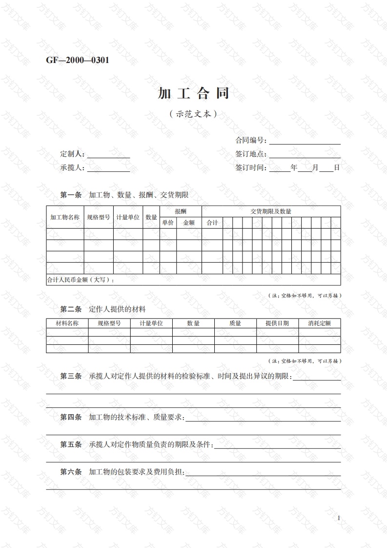 文方GF-2000-0301加工合同万(示范文本)方合同编号:定制人:签订地点:承揽人:签订时间:年月日第一条加工物、数量、报酬、交货期限报酬交货期限及数量加工物名称规格型号计量单位数量单价金额合计合计人民币金额(大写):(注:空格如不够用,可以另接)第二条定作人提供的材料材料名称规格型号计量单位数量质量提供日期消耗定额(注:空格如不够用,可以另接)第三条承揽人对定作人提供的材料的检验标准、时间及提出异议的期限:第四条加工物的技术标准、质量要求:第五条承揽人对定作物质量负责的期限及条件:第六条加工物的包装要求及费用负担:方方万文第七条定作人提供技术资料、图纸的时间、办法及保密要求第八条承揽人发现定作人提供的图纸、技术要求不合理的,在日内向定作人提出书面异议。定作人应在收到书面异议后的日内答复。第九条定作人(是/否)允许第三人完成加工物的主要工作。第十条加工物的交付方式及地点:第十一条加工物的检验标准、方法、地点及期限第十二条报酬的结算方式及期限:第十三条定作人在年月日前交定金(大写)第十四条本合同解除的条件:第十五条定作人未向承揽人支付报酬的,承揽人(是/否)可以留置加工物。第十六条违约责任:第十七条合同争议的解决方式:本合同在履行过程中发生的争议,由双方当事人协商解决;也可由当地工商行政管理部门调解:协商或调解不成的,按下列第种方式解决:(一)提交仲裁委员会仲裁:(二)依法向人民法院起诉。第十八条其他约定事项:定作人承揽人鉴(公)证意见:定作人(章):住所:住所:法定代表人:居民身份证号码:法定代表人:居民身份证号码:委托代理人:委托代理人:电话:电话:开户银行:开户银行:鉴(公)证机关(章):账号:账号:经办人:邮政编码:邮政编码:年月日监制部门:印制单位:万