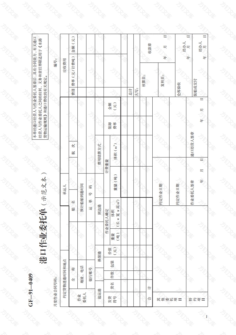 GF-91-0409本单经港口经营人与作业委托人签章后,具有合同效力,有关港口港口作业委托单(示范文本)经营人与作业委托人之间的权利、义务和责任界限适用于《水路货物运输规则》和港口费收的有关规定。月度作业合同号码:约定货物进港时间和地点承运人应收费用全称船名航次费目费率(元/计费吨)金额(元)作业委托人地址、电话预计船舶到港时间银行账号运单号码起运港换装港到达港费用结算方式作业委托人确定计费重量发货货名件数包装价值装卸金额符号(元)重量体积重量(吨)体积(m3)费率(元)(吨)(长×宽×高m)总计大写:核算员:合计收款章其他委托项约定作业日期复核员:年月日目约定作业日期C仓库验收经办人年月特约项作业委托人签章港口经营人签章装船或交付目年月日经办人年月日X「C港口作业委托单说明1.作业委托单一式六份,顺序如下:第一份(起运港入库或到达港提货联)起运或到达港口经营人起运或到达港口经营人仓库;第二份(作业委托人存查联)起运或到达港口经营人一→作业委托人:第三份(收据联)起运或到达港口经营人收后,作业委托人;第四份(财务结算联)起运或到达港口经营人财务结算;第五份(计费存查联)起运或到达港口经营人计费存查:第六份(作业联)起运或到达港口经营人作业后存查。2.作业委托单的抬头应印刷或填写港口经营人名称。3.作业委托单第六份用厚纸印刷,其余五份均用薄纸印刷,印刷墨色应有区别为:结算联为红色、收据联为绿色、其他联为黑色。4.要印控制号码或固定号码。5.危险货物作业,第六份用红纸印刷。6.规格:长19厘米,宽27厘米。方万