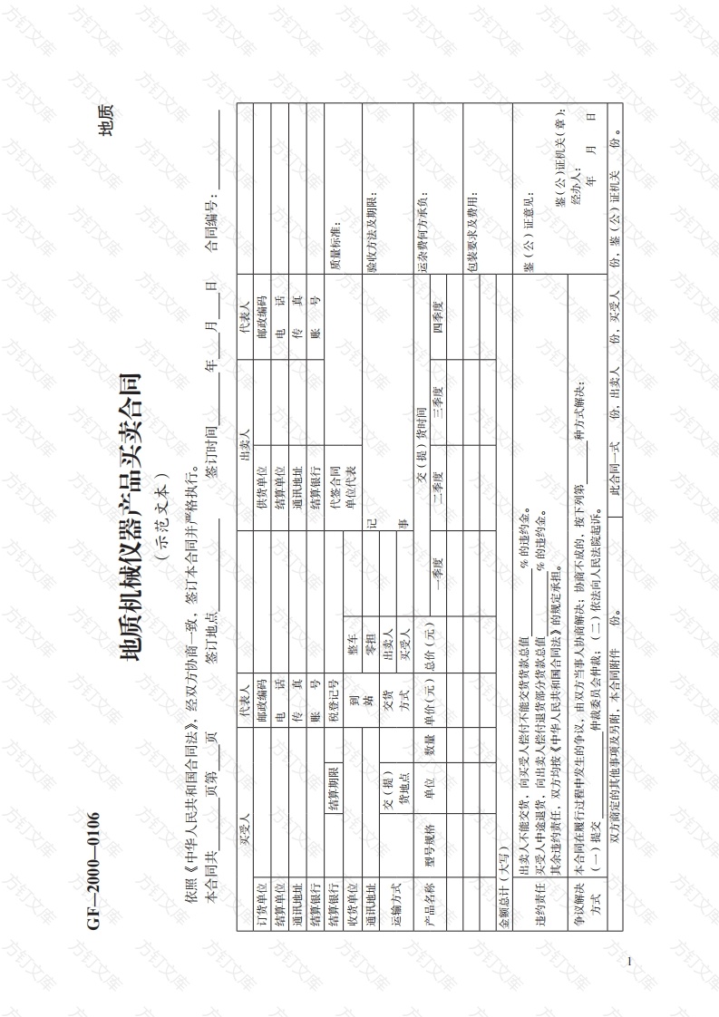 GF-2000-0106地质地质机械仪器产品买卖合同(示范文本)依照《中华人民共和国合同法》,经双方协商一致,签订本合同并严格执行。本合同共页第页签订地点签订时间年月日合同编号:买受人代表人出卖人代表人订货单位邮政编码供货单位邮政编码结算单位电话结算单位电话通讯地址通讯地址传真结算银行账号结算银行账号结算银行结算期限税登记号代签合同质量标准:收货单位到整车单位代表通讯地址站零担记验收方法及期限:出卖人运输方式交(提)交货货地点方式买受人事产品名称型号规格单位数量单价(元)总价(元)交(提)货时间运杂费何方承负:一季度二季度三季度四季度包装要求及费用:金额总计(大写)出卖人不能交货,向买受人偿付不能交货货款总值%的违约金。鉴(公)证意见:违约责任买受人中途退货,向出卖人偿付退货部分货款总值%的违约金。其余违约责任,双方均按《中华人民共和国合同法》的规定承担。鉴(公)证机关(章):争议解决本合同在履行过程中发生的争议,由双方当事人协商解决;协商不成的,按下列第种方式解决:经办人:方式仲裁委员会仲栽;(二)依法向人民法院起诉。年月日双方商定的其他事项及另附,本合同附件份。此合同一式份,出卖人份,买受人份,鉴(公)证机关份。C地质地质机械仪器产品买卖合同附表本合同共页第签订日期年出卖人合同编号:号序号产品名称规格、型号或图号单位数量交货期单价(元)金额(元)备注一季度二季度三季度四季度封生C