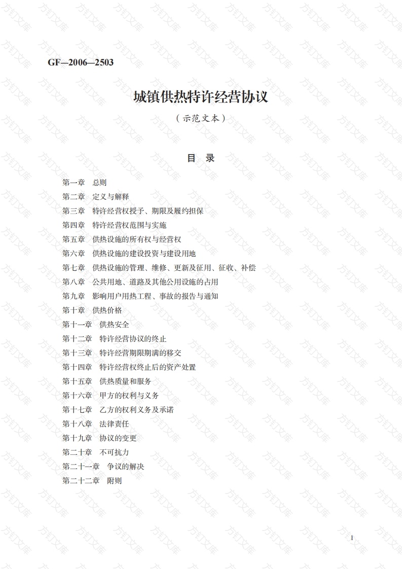 2006-2503城镇供热特许经营协议示范文本)方录第一章总则第二章定义与解释第三章特许经营权授予、期限及履约担保方第四章特许经营权范围与实施第五章供热设施的所有权与经营权第六章供热设施的建设投资与建设用地第七章供热设施的管理、维修、更新及征用、征收、补偿第八章公共用地、道路及其他公用设施的占用方订第九章影响用户用热工程、事故的报告与通知第十章供热价格第十一章供热安全第十二章特许经营协议的终止第十三章特许经营期限期满的移交方第十四章特许经营权终止后的资产处置第十五章供热质量和服务第十六章甲方的权利与义务第十七章乙方的权利义务及承诺第十八章法律责任第十九章协议的变更第二十章不可抗力第二十一章争议的解决第二十二章附则万万万万1第音总则为规范城市、地区集中供热特许经营活动,保障供热行业的健康发展,保障社会公共利益和公共安全,根据建设部《市政公用事业特许经营管理办法》和(地方法规名称),由协议双方按照法定程序于年月日在中国省(自治区)市(县)签订本协议。102协议双方分别为:经中国省(自治区市(县)人民政府授权(注:该授权可以通过以下两种形式:1.该人民政府发布规范性文件;2.该人民政府就本协议事项签发授权书),中国省(自治区市(县)人民政府局(委)(以下简称甲方),地址:法定代表人职务:和公司(以下简称乙方),注册地点:注册号:法定代表职务:国籍:103特许经营原则甲、乙双方签订并付诸履行本协议,应当遵循以下原则:(1)遵守中国的法律;(2)公开、公平、公正;(3)符合城市发展规划、环保规划及城镇供热专项规划;方(4)有利于保障供热安全和高效节能:(5)有利于促进城镇供热行业的健康发展。万万文第二章定义与解释本协议中下列名词或术语的含义遵从本章的定义或解释201[中国]指中华人民共和国,仅为本协议之目的,不包括香港特别行政区、澳门特别行政区和台湾地区。202[法律]指所有适用的中国法律、行政法规、地方性法规、自治条例和单行条例、规章、司法解释及其他有法律约束力的规范性文件。203[供热]向热用户供应热能。204[供热系统]由热源通过热网向热用户供应热能系统的总称。205[集中供热]从一个或多个热源通过热网向城市、镇或某些区域热用户供热。206[热力管网]由热源向热用户输送和分配供热介质的管线系统。207[管道业务]在本协议规定的范围内,依照本协议价格机制制定的价格向使用者提供的管道热力及相关有偿服务的经营业务。208[违约]指本协议签约任何一方未能履行其在本协议项下的任何义务,而且这种违约不能归答于另一方违反本协议的作为或不作为或不可抗力等。209[特许经营权]本协议规定之特许经营权为特许经营供热业务专营权,即在其有效期限和规定地域内,特许经营权受让方独自占有该项业务的经营权利。210[户内共用管道热力设施]用户楼前引入管、楼内立管、水平管及阀门等热力设施。211[用户自用管道热力设施]自户内共用热力管道引入到用户室内的热力管道、阀门计量表等设施。212[热力紧急事件]涉及供热采暖需要紧急采取应急措施的事件,包括爆炸、泄漏以及管道热力设施紧急利用等。213[履约保函]指为保证协议的正常履行,由金融机构通过保函形式向乙方提取的履约保证金,分为建设期履约保函,运营与维护保函,移交保函。214日、月、季度、年:均指公历的日、月、季度和年。第三章特许经营权授予、期限及履约担保301特许经营权授予甲方自本协议生效之日起,授予乙方在本协议有效期限和规定地域内,独家享有供热业务的经营权利(以下简称“特许经营权”)。甲方应当于本协议生效之日起5个工作日内向乙方发放特许经营权证书,并以适当方式公302特许经营期限本协议之特许经营权有效期限为自本协议生效之日起计月入日起至年入月日止。303特许经营履约担保1.乙方应在签订协议前十五日内向甲方提供双方能接受的信誉良好的金融机构出具的履约保函,以保证乙方履行本协议规定的义务。履约保函分作建设期保函、运营维护保函和移交保函,移交保函可并入运营维护保函。2.特许经营期间,乙方如拒绝履行本协议规定的义务、支付违约金或不及时实施事故处理,甲方可以提取履约担保作为违约金或用于事故处理,但不能挪作他用。3.履约担保金额共元,其中建设期履约担保金额元、运营维护履约担保金额元、移交履约担保金额元。(履约担保金额根据特许经营有效期限和规定区域内用户数、用热量和用热性质等具体情况由协议双方商定。)4.凡用于乙方违约金及事故处理等费用支出的部分履约担保金额,乙方须于事项处理后的10日内向甲方补齐履约担保金额。