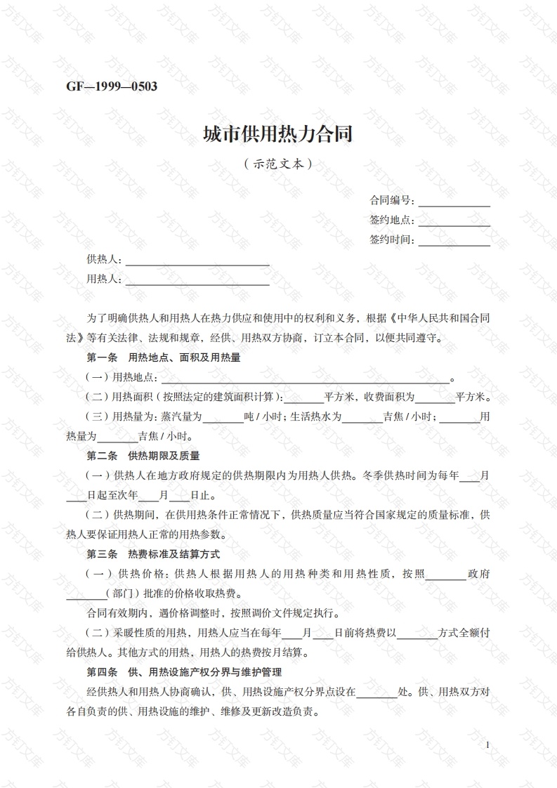 1999_0503万文城市供用热力合同方示范文本)合同编号:万文签约地点:签约时间:供热人:用热人:为了明确供热人和用热人在热力供应和使用中的权利和义务,根据《中华人民共和国合同法》等有关法律、法规和规章,经供、用热双方协商,订立本合同,以便共同遵守。第一条用热地点、面积及用热量(一)用热地点:(二)用热面积(按照法定的建筑面积计算平方米,收费面积为方米。(三)用热量为:蒸汽量为吨/小时:生活热水为吉焦/小时:用热量为吉焦/小时。第二条供热期限及质量(一)供热人在地方政府规定的供热期限内为用热人供热。冬季供热时间为每年日起至次年月日止。在供用热条件正常情况下,供热质量应当符合国家规定的质量标准,供热人要保证用热人正常的用热参数。第三条热费标准及结算方式(一)供热价格:供热人根据用热人的用热种类和用热性质,按照政府部门)批准的价格收取热费。合同有效期内,遇价格调整时,按照调价文件规定执行。(二)采暖性质的用热,用热人应当在每年日前将热费以给供热人。其他方式的用热,用热人的热费按月结算。第四条供、用热设施产权分界与维护管理经供热人和用热人协商确认,供、用热设施产权分界点设在处。供、用热双方对各自负责的供、用热设施的维护、维修及更新改造负责。第五条供热人的权利和义务(一)有权对用热人的用热情况及设施运行状况进行监督和检查。(二)监督用热人在合同约定的用热地点、数量、范围内用热,有权制止用热人超量、超使用范围用热。(三)对新增用热人,供热人有权在供热之前对用热人采暖系统进行检查验收。(四)用热人违反操作规程,造成计量仪表显示数字与实际供热量不符、伪造供热记录的,供热人有权要求用热人立即改正。用热人应当按照本采暖期中最高用热月份用热量的热费收取当月热费。(五)用热人用热设施或者安全管理存在不安全隐患、可能造成供热设施损害时,或者用热人在合同约定的时限内拒不交费的,供热人有权中断供热。(六)属供热人产权范围内的供热设施出现故障,不能正常供热或者停热8个小时以上的,供热人应当通知用热人,并立即组织抢修,及时恢复供热。(七)供热人因供热设施临时检修或者用热人违法用热等原因,需要中断供热时,应当提前小时通过媒体或者其他方式通知用热人。因不可抗力等原因中断供热时,供热人应当及时抢修,并在小时内通知用热人。(八)有义务按照合同约定的数量、质量和使用范围向用热人供热。第六条用热人的权利和义务(一)监督供热人按照合同约定的数量和质量向用热人提供热力。(二)有权对供热人收取的热费及确定的热价申请复核。(三)用热人新增或者增加用热,应当向供热人办理用热申请手续,并按照规定办理有关事项。(四)用热人变更用热性质、变更户名、减少用热量、暂停或者停止用热移动表位和迁移用热地址,应当事先向供热人办理手续。停止用热时,应当将热费结清。(五)用热人的开户银行或者账号如有变更,应当及时通知供热人。(六)应当按照合同约定向供热人交热费。(七)对自己产权范围内的用热设施应当认真维护,及时检修。第七条违约责任(一)供热人的违约责任1.因供热人责任未按照合同约定的期限向用热人供热的,除按照延误供热时间,热价减收或者退还用热人热费外,还应当向用热人支付热费百分之违约金。2.由于供热人责任事故,给用热人造成损失的,由供热人承担赔偿责任。供热人应当减收或者退还给用热人实际未达到供热质量标准部分的热费。但有下列情况之一,造成供热质量达不到规定的标准,供热人不承担责任:文)用热人擅自改变居室结构和室内供热设施的;万(2)室内因装修和保温措施不当影响供热效果的;(3)停水、停电造成供热中断的;(4)热力设施正常的检修、抢修和供热试运行期间。3.供热人的供热设施出现故障,未能及时通知用热人,给用热人造成损失的,供热人应当承担赔偿责任。4.由于不可抗力的原因或者政府行为造成停止供热,使用热人受到损失的,供热人不承担赔偿责任。(二)用热人的违约责任1.用热人逾期交热费的,还应当支付滞纳金。逾期一个月仍不交热费和滞纳金的,供热方有权限热或者停止供热。2.用热人违反合同约定,用热人应当向供热人支付百分之的违约金。3.用热人擅自进行施工用热,供热人有权立即停止供热,用热人应当赔偿供热人因此而受到的损失。损失额按照擅自进行施工用热的建筑物面积和实际用热天数热费的倍计算。开始擅自进行施工用热的时间难以确定的,按照当地开始供热时间为准。第八条合同有效期限合同期限为年,从日起至第九条合同的变更当事人如需要修改合同条款或者合同未尽事宜,须经双方协商一致,签订补充协定,补充协定与本合同具有同等效力。第十条争议的解决方式本合同在履行过程中发生的争议,由双方当事人协商解决,协商不成的,按下列第种方式解决;(一)提交仲裁委员会仲裁;(二)依法向人民法院起诉。第十一条其他约定方万万方万万