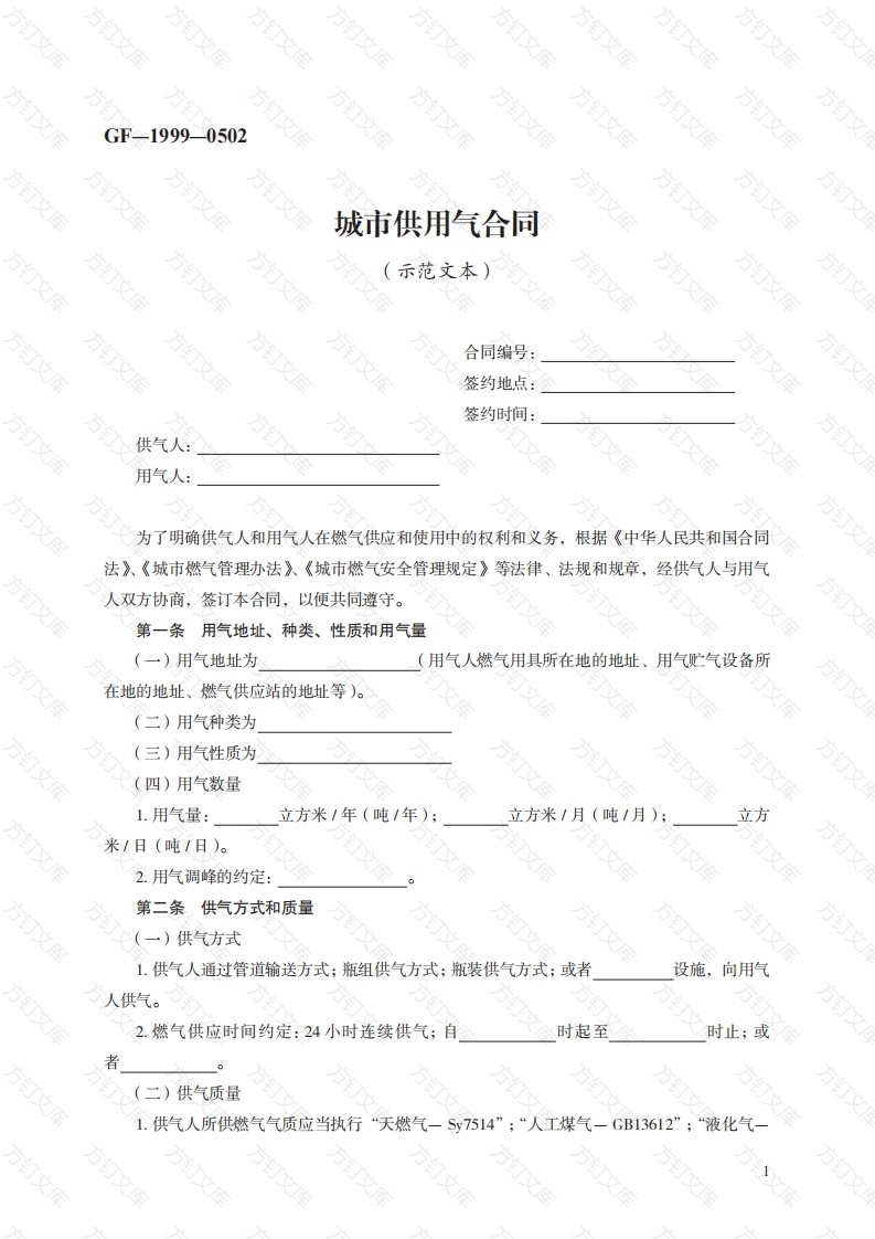 1999-0502方文城市供用气合同方示范文本)文合同编号:签约地点:签约时间:供气人:用气人:为了明确供气人和用气人在燃气供应和使用中的权利和义务,根据《中华人民共和国合同法》、《城市燃气管理办法》、《城市燃气安全管理规定》等法律、法规和规章,经供气人与用气人双方协商,签订本合同,以便共同遵守。第一条用气地址、种类、性质和用气量(一)用气地址为用气人燃气用具所在地的地址、用气贮气设备所在地的地址、燃气供应站的地址等)。(二)用气种类为(三)用气性质为(四)用气数量1.用气量:立2.用气调峰的约定:第二条供气方式和质量(一)供气方式1.供气人通过管道输送方式;瓶组供气方式;瓶装供气方式;或者设施,向用气人供气。2.燃气供应时间约定:24小时连续供气;自时起至者(二)供气质量1.供气人所供燃气气质应当执行“天燃气一Sy7514”;“人工煤气-GB13612”;“液化气-GB11174”标准2.根据用气人用气性质,双方约定执行下述质量指标:3.供气人保证在前气压大于等于兆)帕。第三条用气的价格、计量及气费结算方式(一)供气人根据用气人的用气性质和种类,按照政府部门)批准的燃气价格:天燃气元/立方米:人工煤气元/立方米:液化石油气吨(元/立方米)收取燃气费。在合同有效期内,遇燃气价格调整时,按照调价文件规定执行。(二)供用燃气的计量、气费结算方式1.供用燃气的计量器具为:IC卡燃气计量;衡或结算用计量器具须经当地技术监督部门检定、认定。2.供用燃气的计量供、用气双方以管道燃气计量器具的读数为依据结算;瓶装燃气以供气人供应站检斤计量为依据结算;或者以为依据结算。3.结算方式用气人于每月日前采取:通过银行方式交费:到供气人供应站交费;采取交费;供气人到用气场所收费。第四条供、用气设施产权分界与维护管理(一)供、用气设施产权分界点是:(二)产权分界点(含)逆燃气流向的输、配气设施由供气人负责维护管理;产权分界点顺燃气流向的输、配气设施至燃气用气器具由用气人负责维护管理,或者有偿委托供气人维护管理。第五条供气人的权利和义务(一)依照法律、法规和规章的规定,对用气人的用气设施运行状况和安全管理措施进行安全检查,监督用气人采取有效方式保证安全用气。(二)监督用气人在合同约定的数量、使用范围内使用燃气,有权制止用气人超量、超使用范围用气。(三)用气人逾期不交燃气费,供气人有权从逾期之日起向用气人收取滞纳金。(四)用气人用气设施或者安全管理存在不安全隐患、可能造成供气设施损害时,或者用