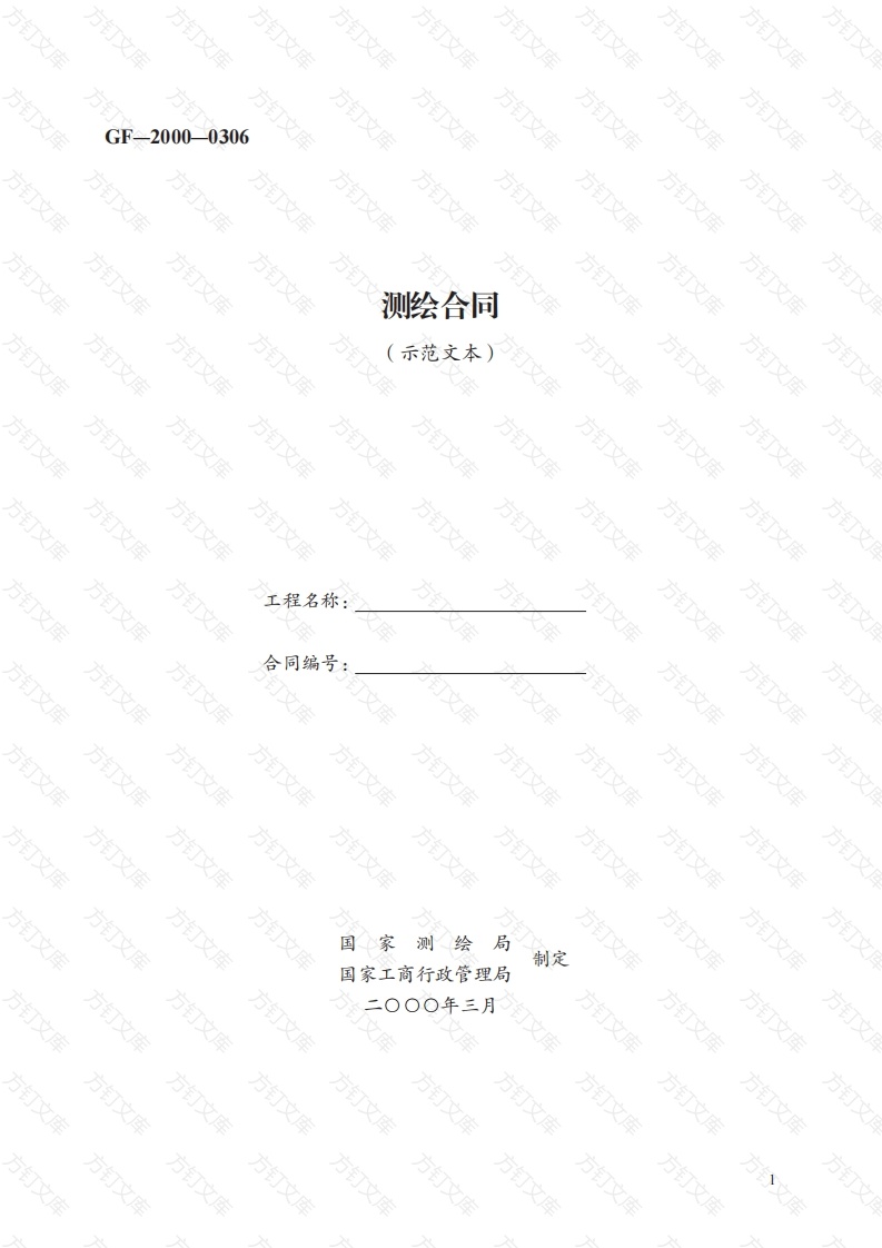 文文2000_0306方测绘合同示范文本)方工程名称:方合同编号:方方方方方方万文国家测绘制定国家工商行政管理局方方方万万方方方万定作人(甲方):合同编号:承揽人(乙方):签订地点:承揽人测绘资质等级:签订时间:根据《中华人民共和国合同法》、《中华人民共和国测绘法》和有关法律法规,经双方协商致签订本合同。第一条测绘范围(包括测区地点、面积、测区地理位置等)第二条测绘内容(包括测绘项目和工作量等):第三条执行技术标准:序号标准名称标准代号标准级别其他技术要求:第四条测绘工程费:1.取费依据:国家颁布的测绘产品价格标准。文2.取费项目及预算工程总价款:方万