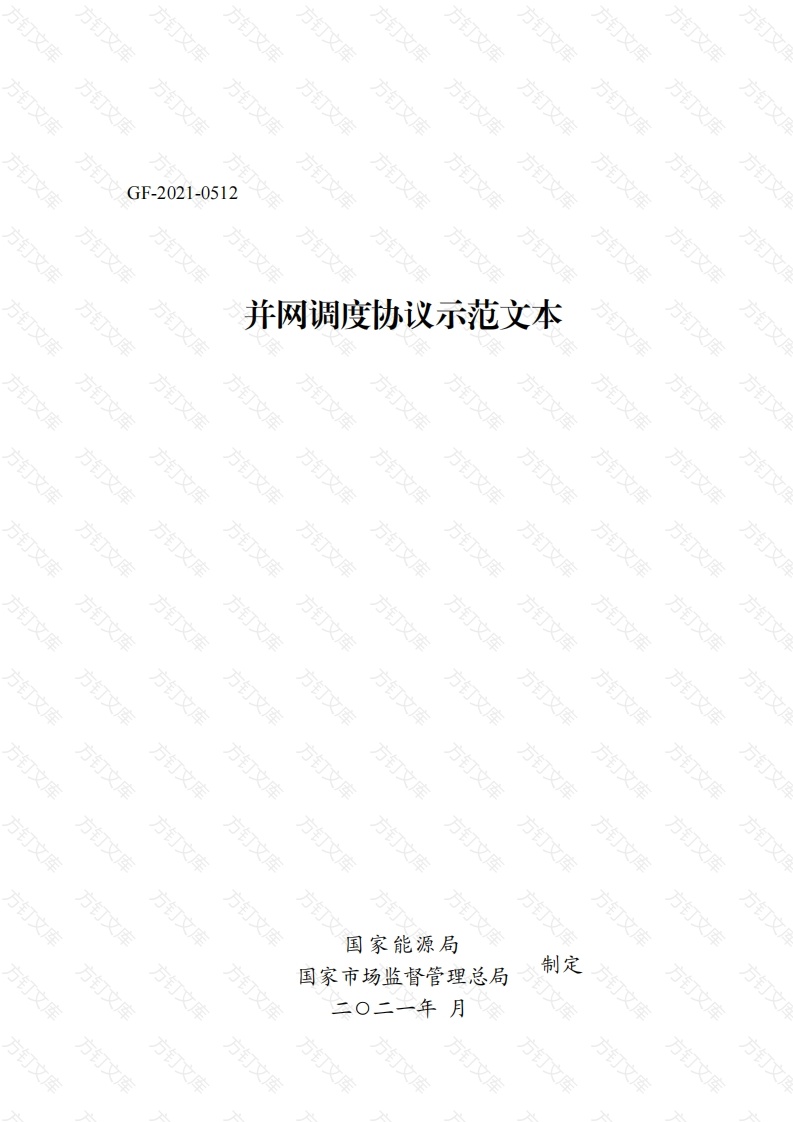 方方方GF-2021-0512方订方并网调度协议示范文本方方方方方订方方方国家能源局国家市场监督管理总局制定文《并网调度协议示范文本》使用说明《并网调度协议示范文本》(以下简称《示范文本》)是对燃煤、燃气、水电等常规电厂并入电网时双方调度和运行行为的约定,适用于常规电厂与电网之间签订并网调度协议。其他核电、抽水蓄能电站、燃油电厂、生物质发电、地热电站等,也可以参照使用。二、《示范文本》主要针对电厂并入电网调度运行的安全和技术问题,设定了双方应承担的基本义务、必须满足的技术条件和行为规范。对于本文本中所涉及的技术条件,如果国家、行业颁布新的相关行业标准和技术规范,双方应遵从其规定。三、《示范文本》中有关空格的内容由双方约定或据实填写,空格处没有添加内容的,请填写“无”。《示范文本》所列数字、百分比、期间均为参考值。协议双方可根据具体情况和电力系统安全运行的需要,在公平、合理和协商一致的基础上对参考值进行适当调整,对有关章节或条款进行补充、细化或完善,增加或减少定义、附件等。法律、法规或者国家有关部门有规定的,按照规定执行。四、签订并网调度协议的主要目的是维护电网经营企业和发电企业的合法权益,保证电力交易合同的实施,保障电力系统安全在正式协议文本中,所列数字、百分比、期间等均应为确定值,以免由此产生争议。优质、经济运行。协议双方应注意所签并网调度协议与购售电合同相关约定的一致性。五、《示范文本》特别条款及附件中略去的部分,双方可根据实际情况进行补充或约定。方方方方方方订2文万万